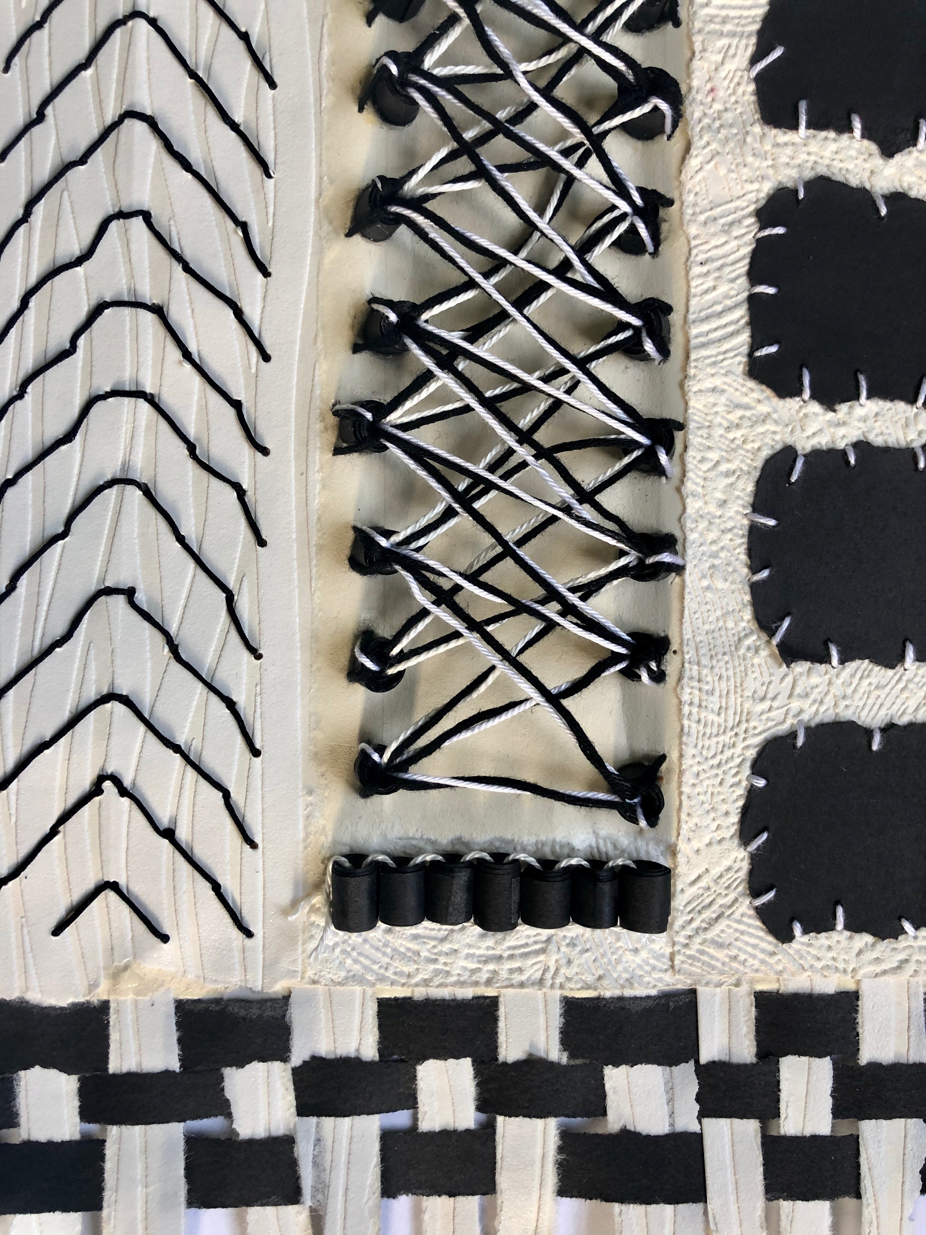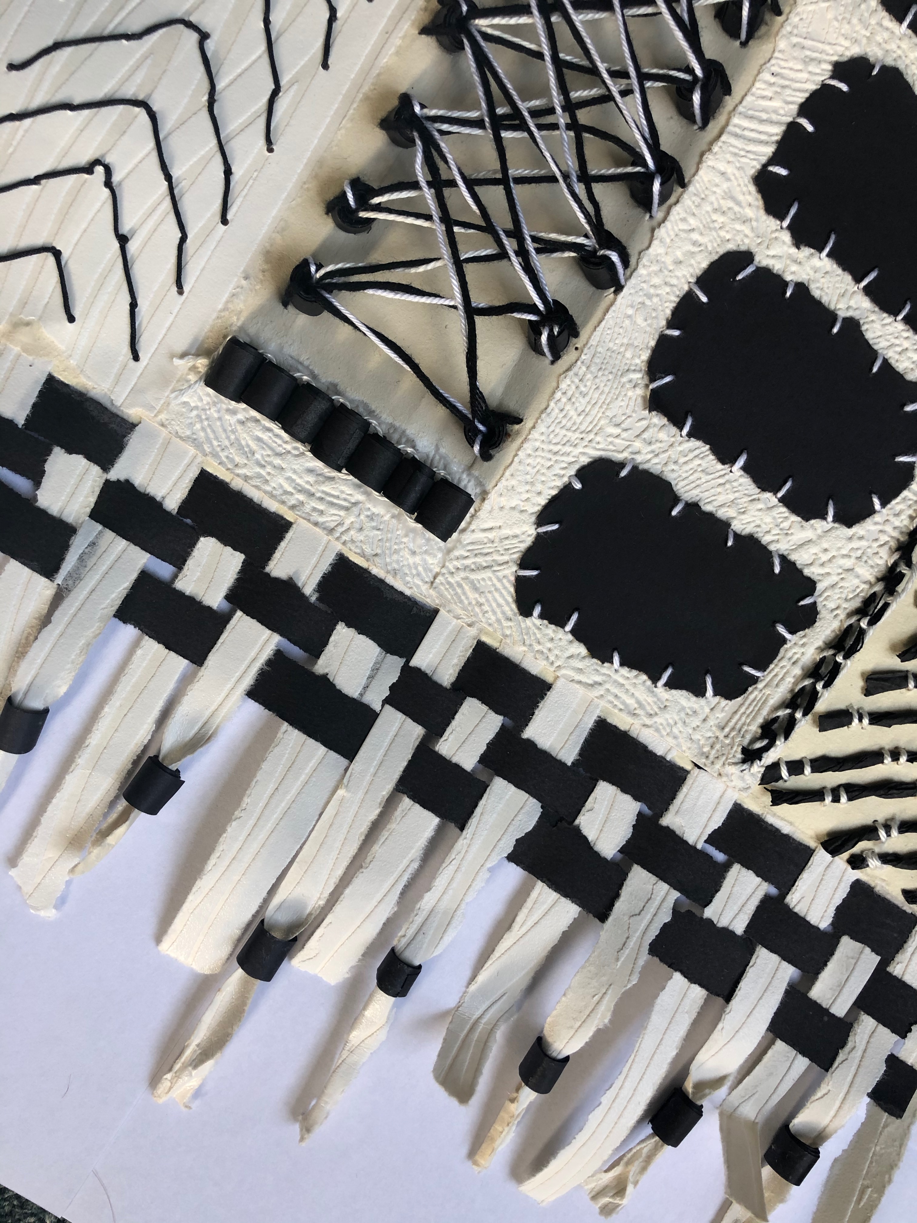 Having laid out my earlier samples and drawings I have used two ideas – strong lines and delicate whitework.