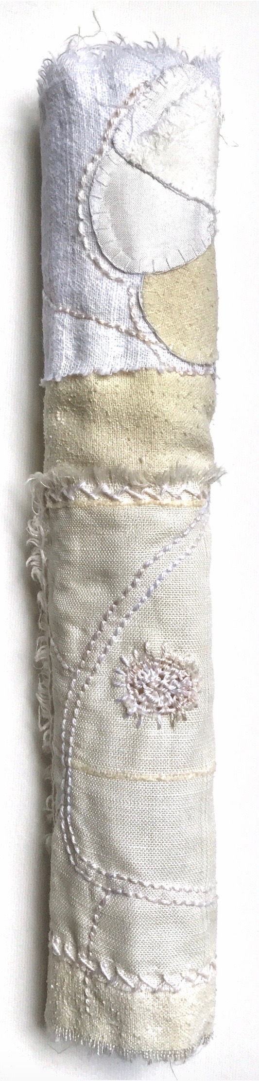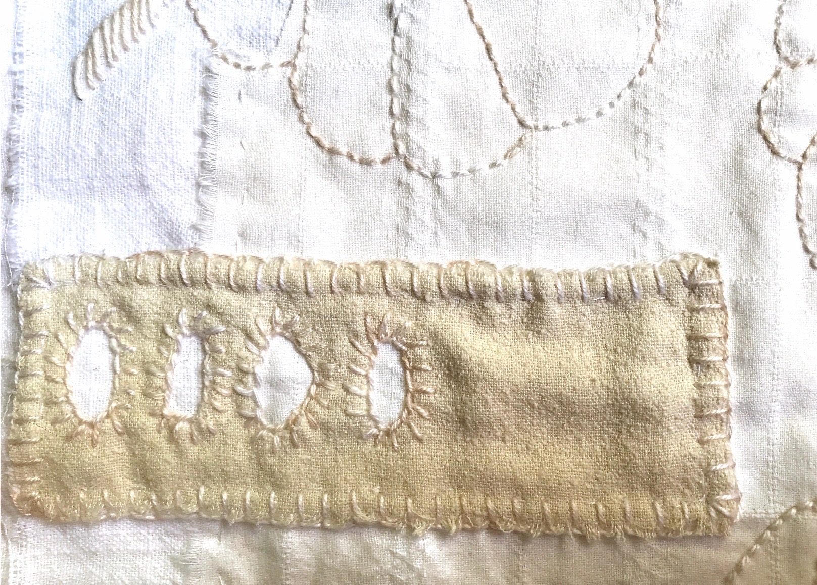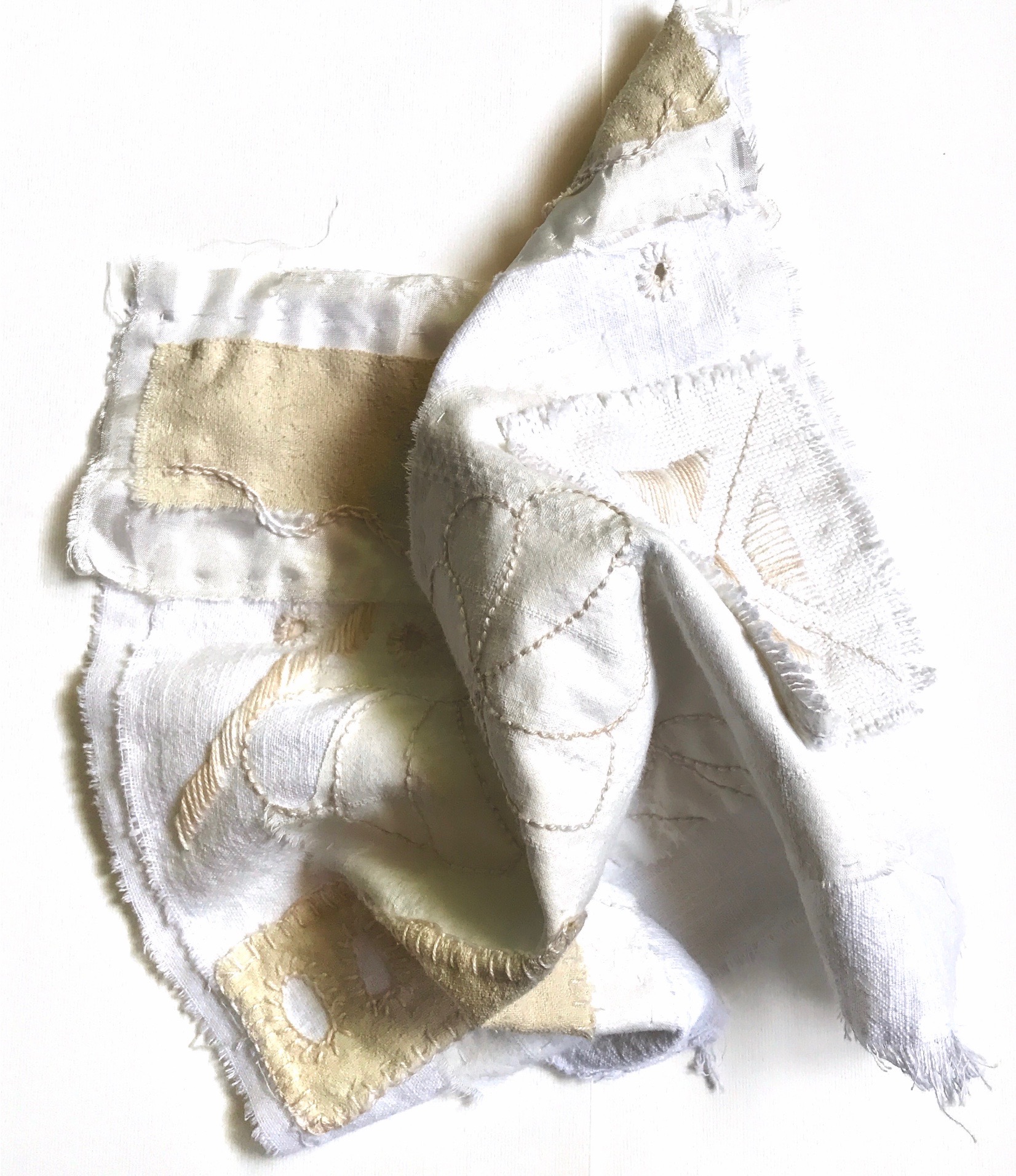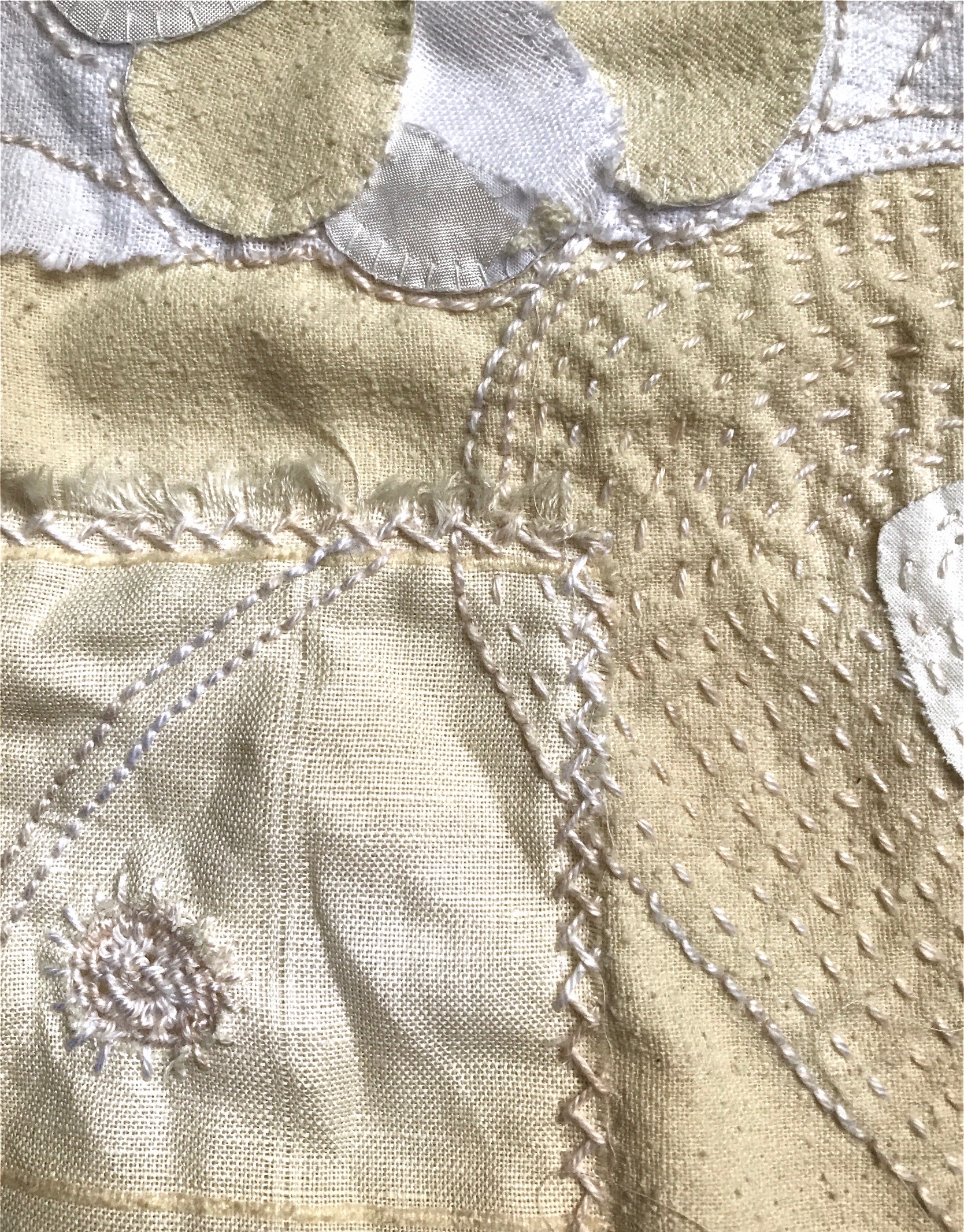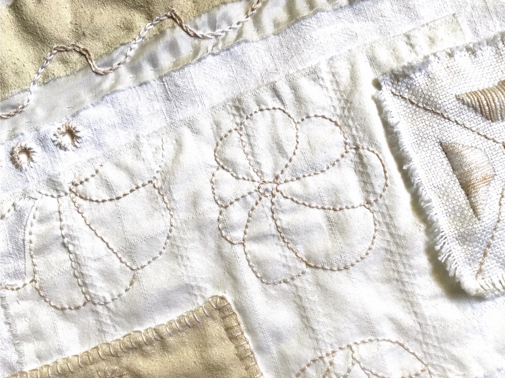 Here I have experimented with scale, starting again with a pieced background and stitching large stylised flowers over the whole piece. I have also experimented with cut out shapes and with applique to create a statement piece.