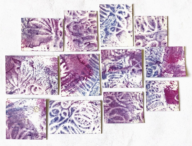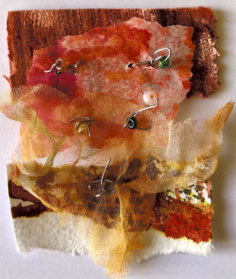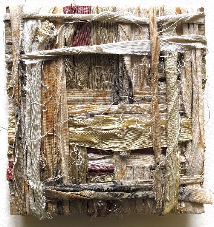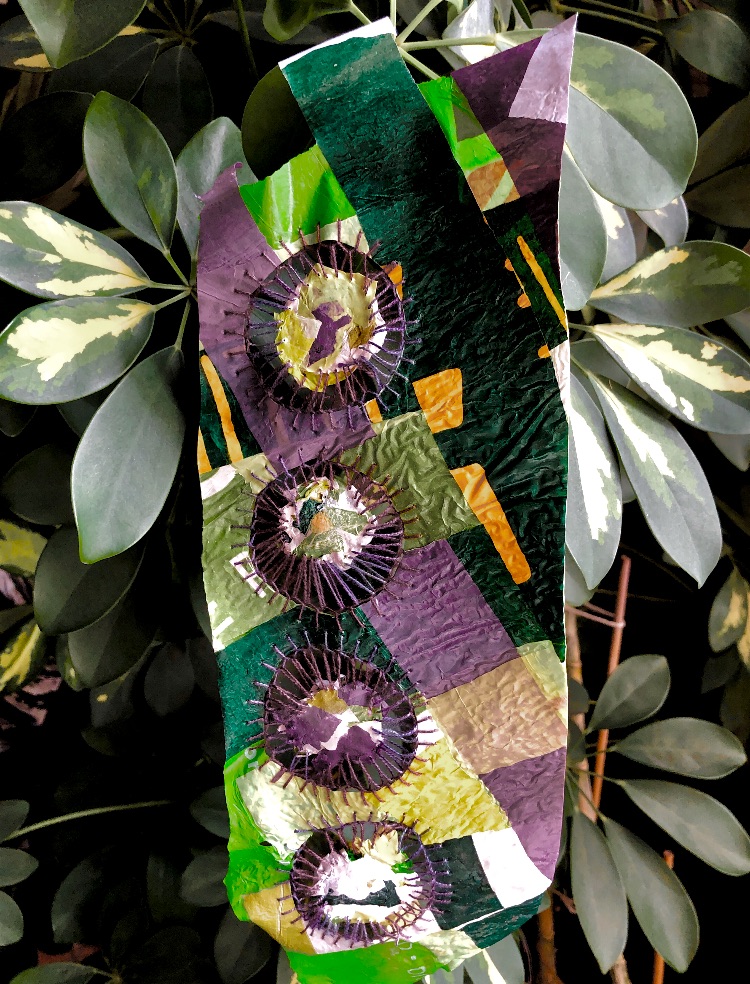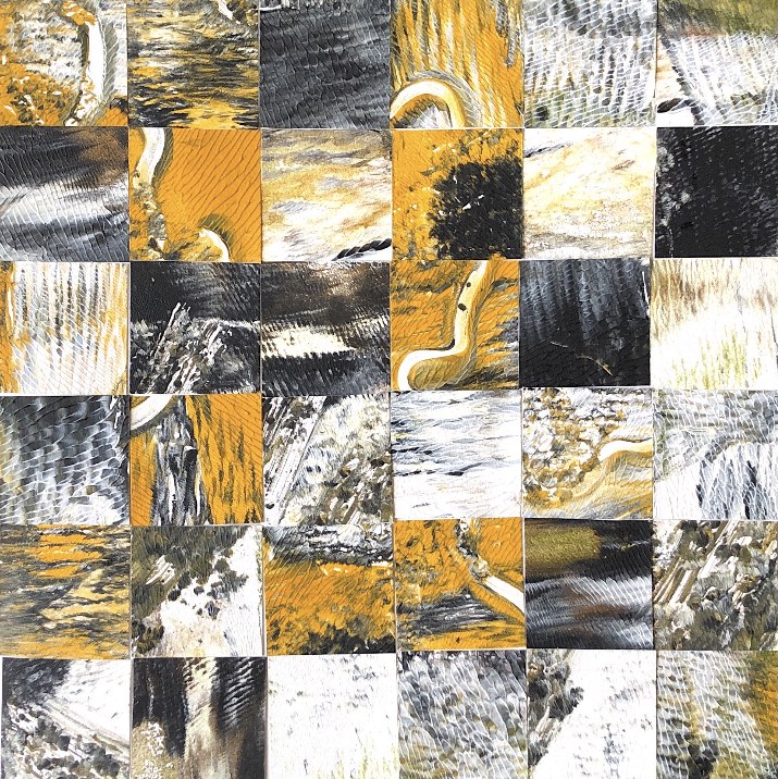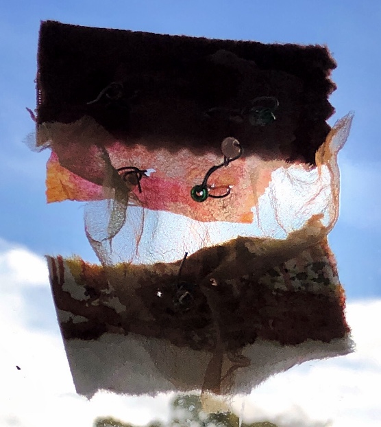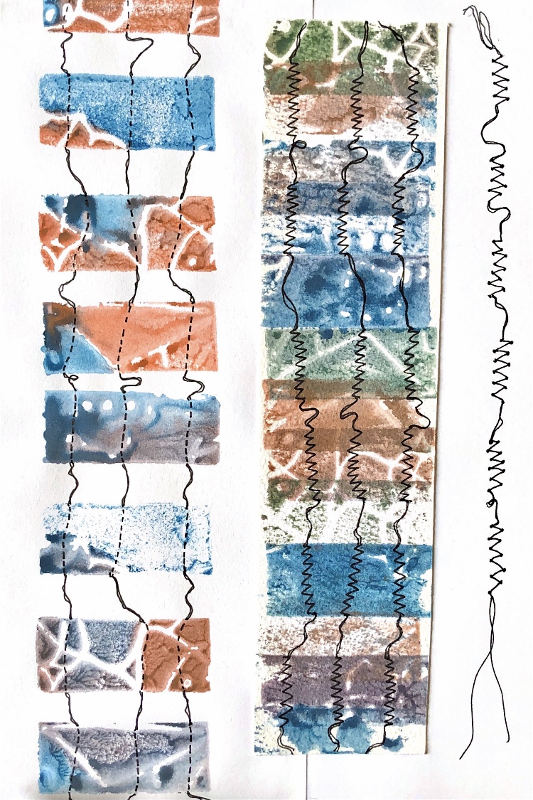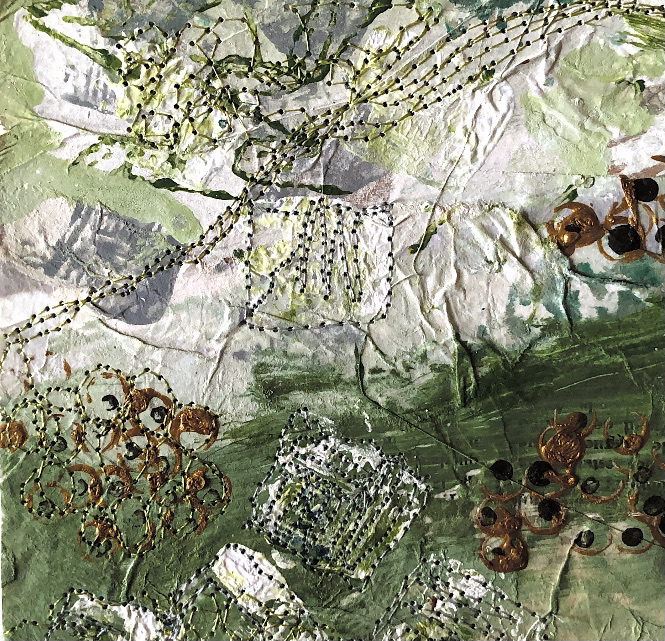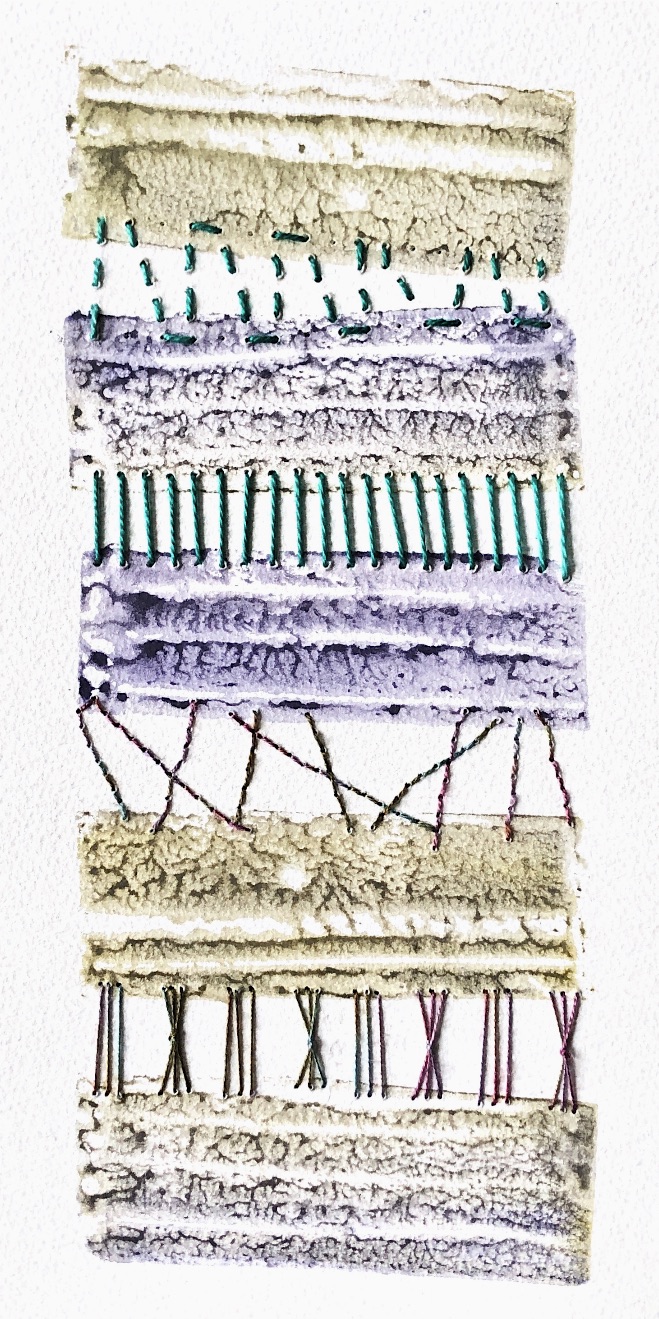 Collage papers painted. Squares cut out – hand and machine stitched.