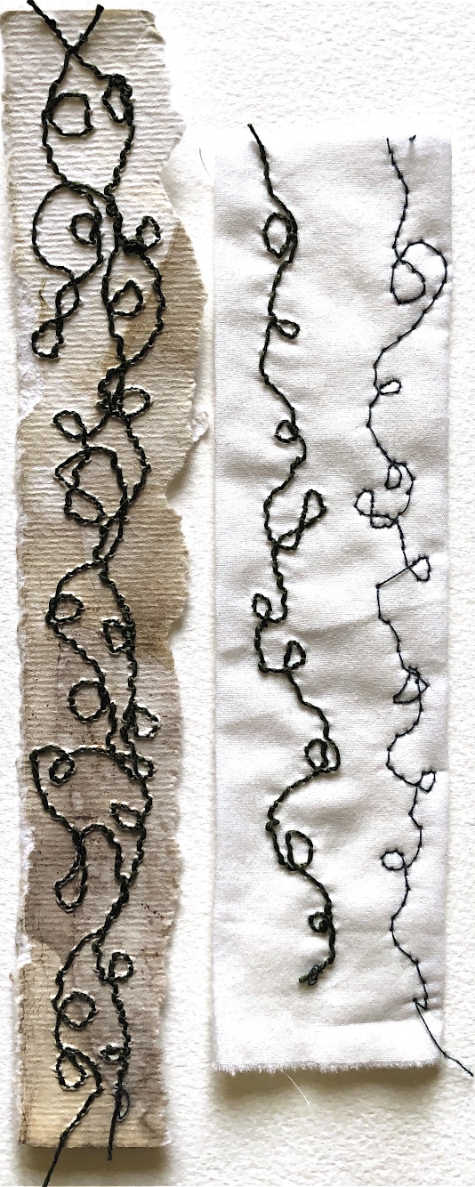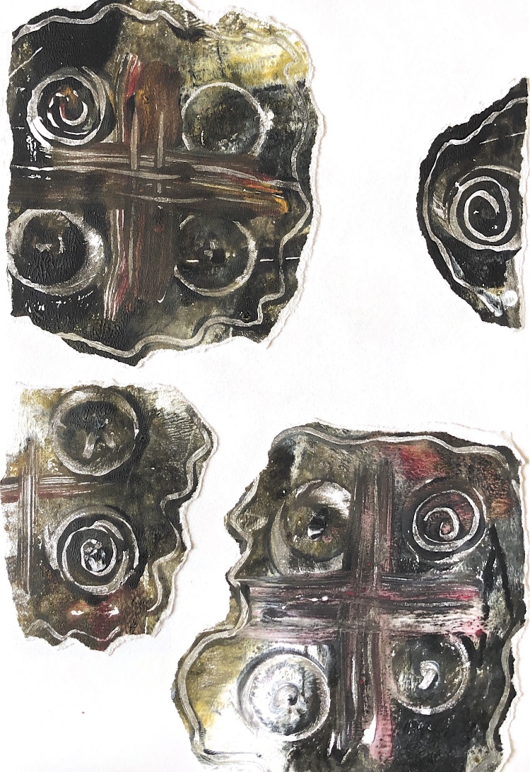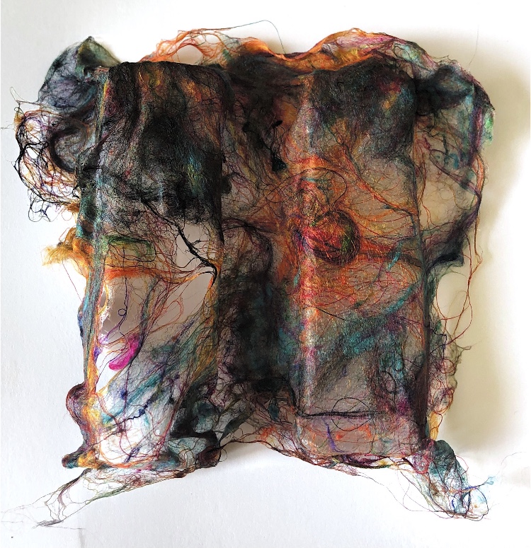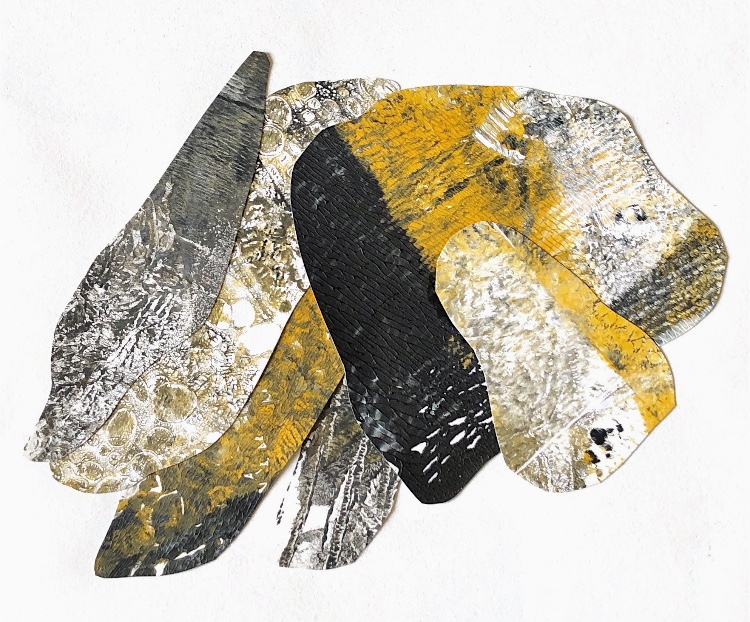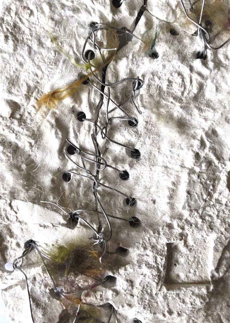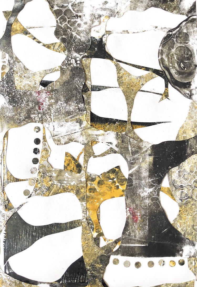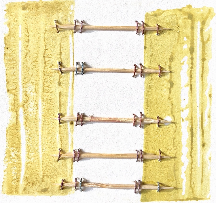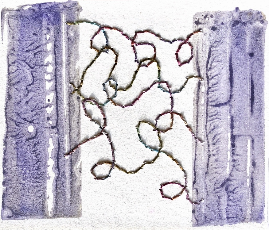 Collage papers painted. Squares cut out – hand and machine stitched.