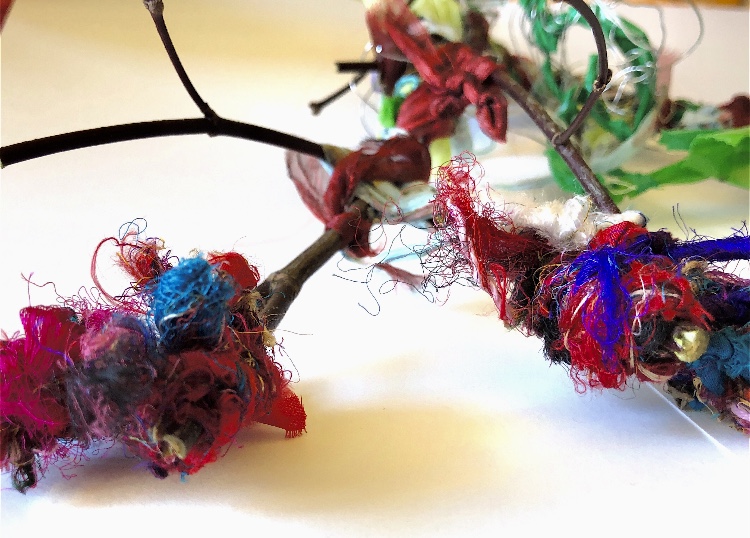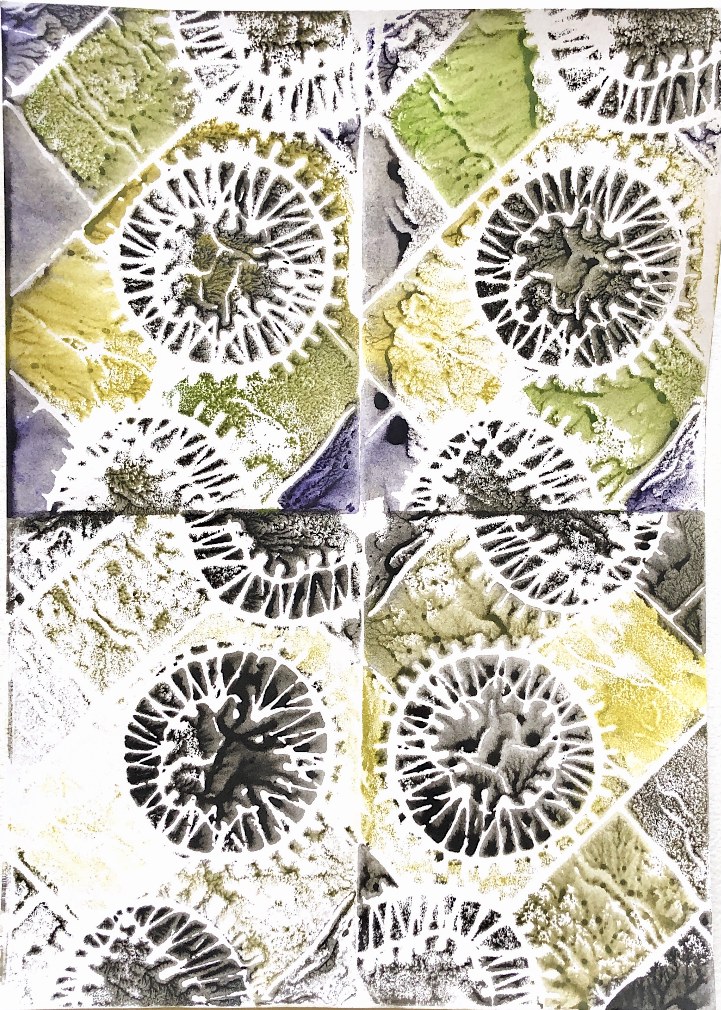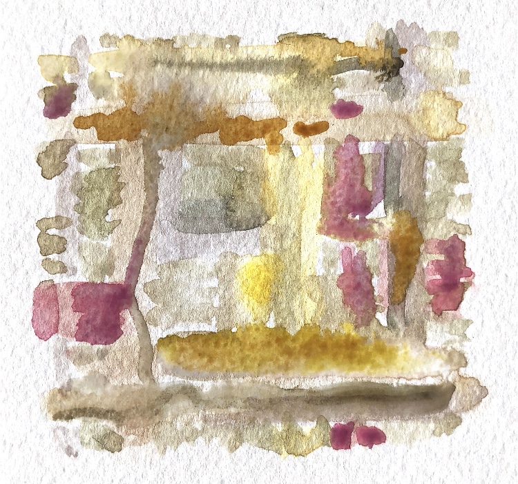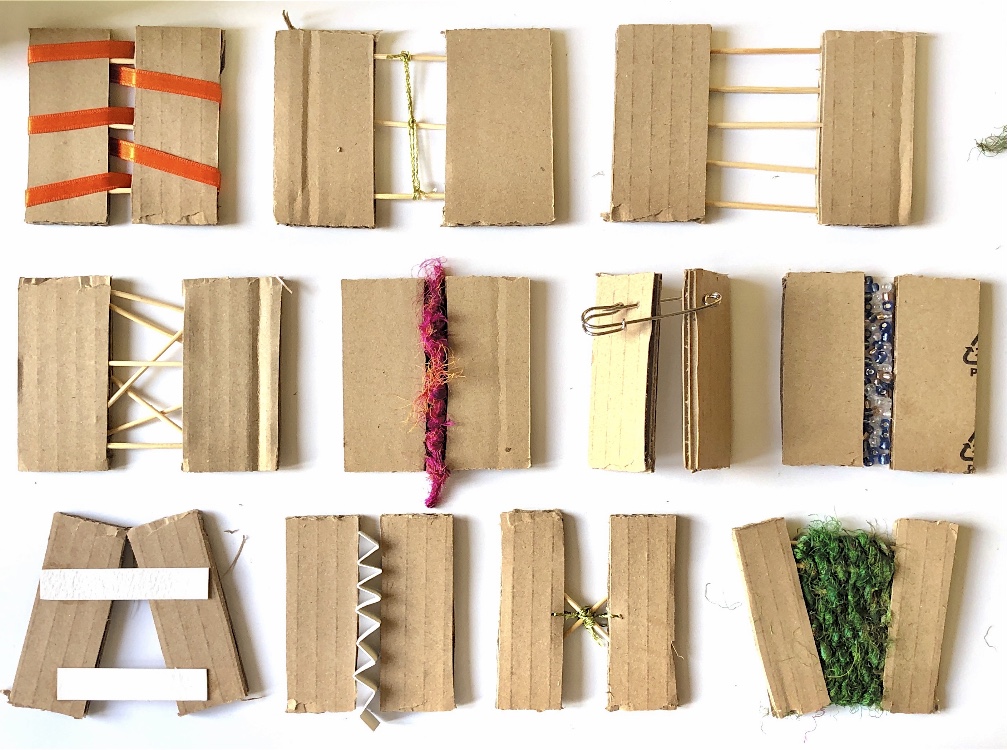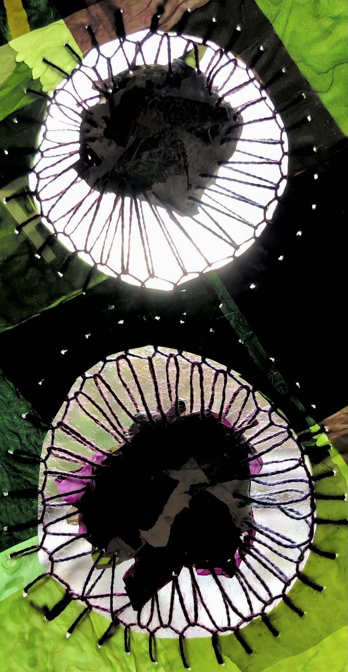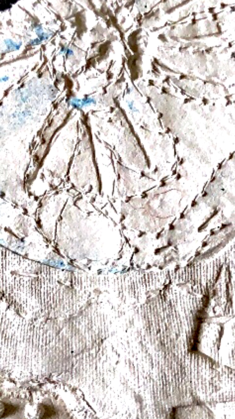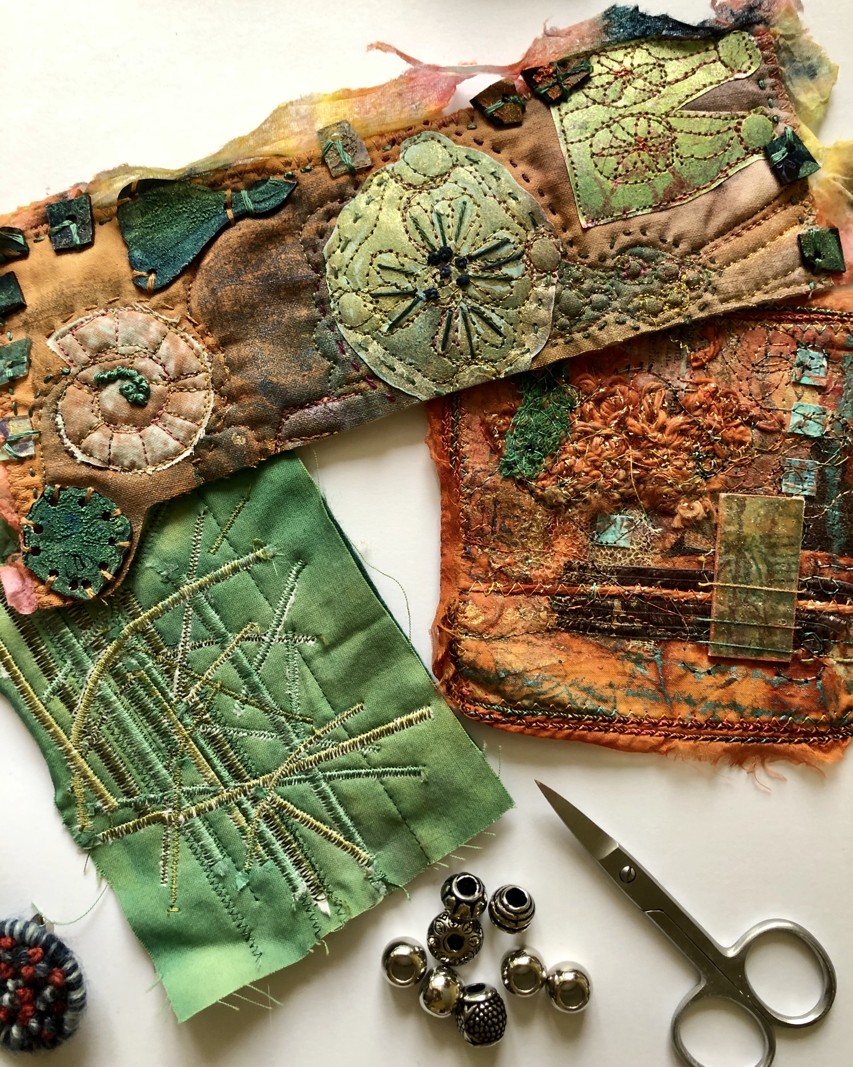 Collage papers painted. Squares cut out – hand and machine stitched.