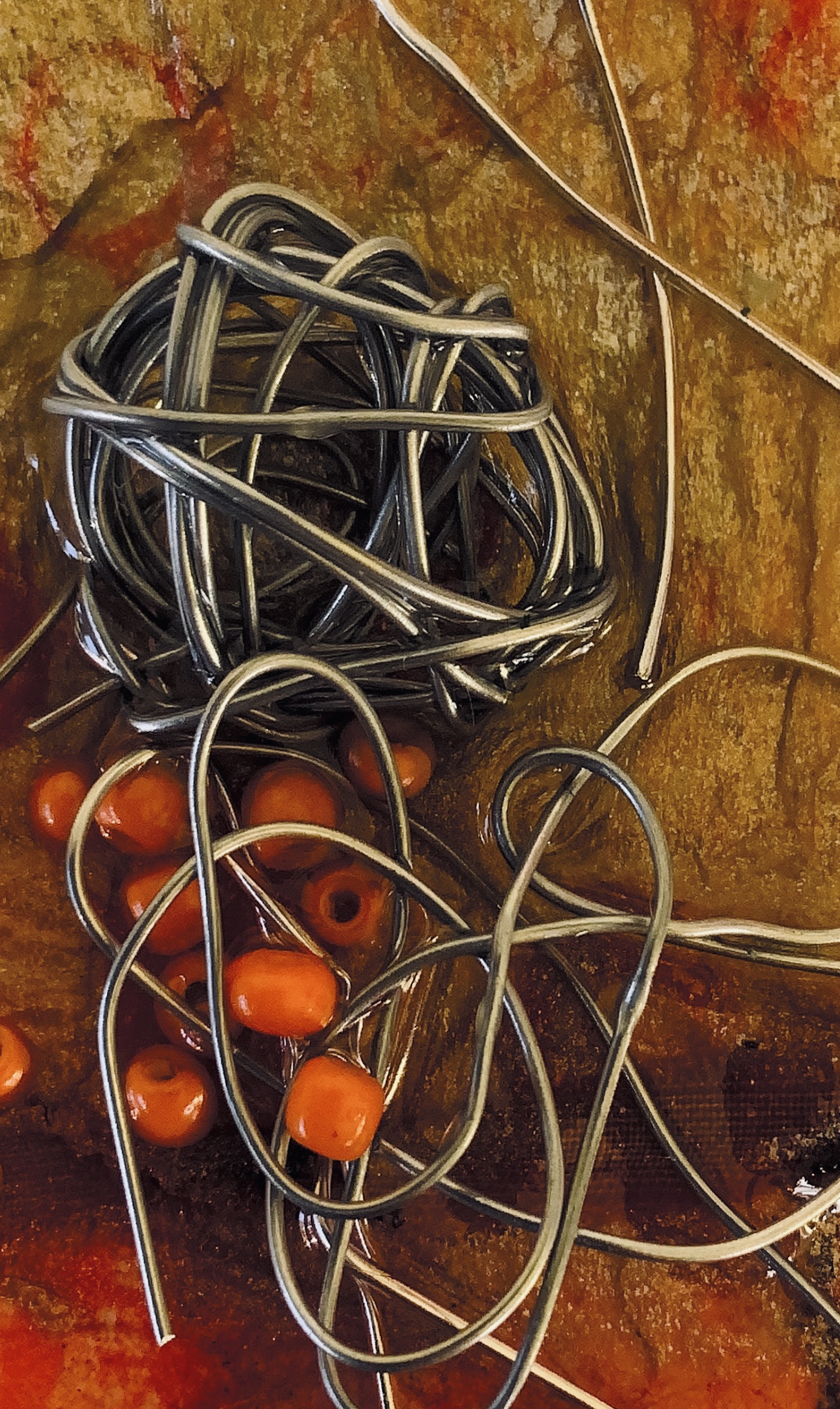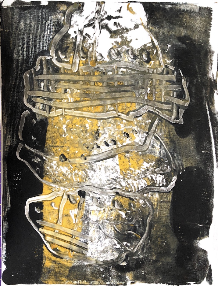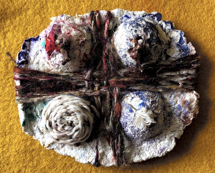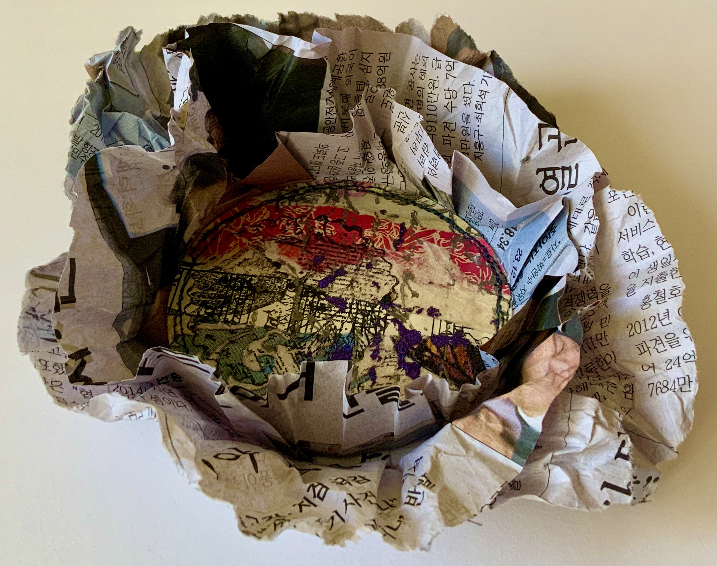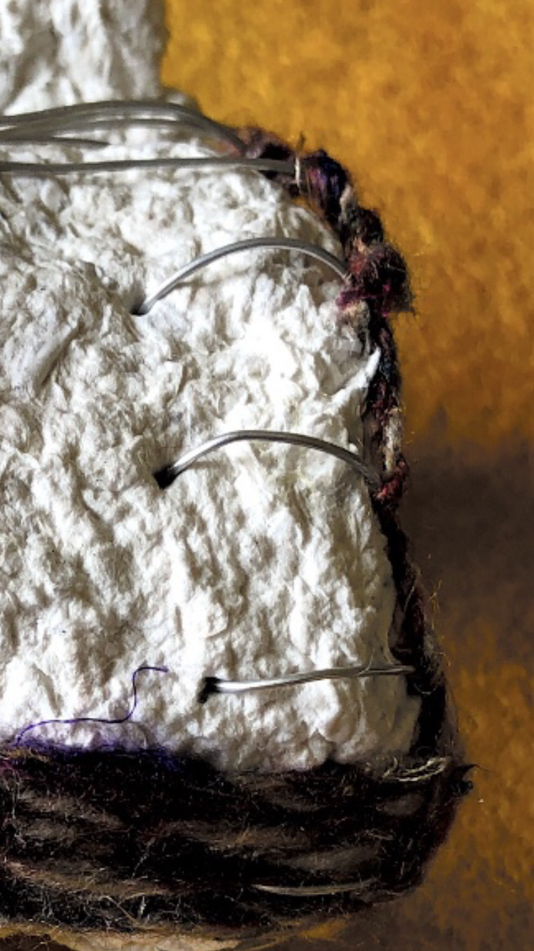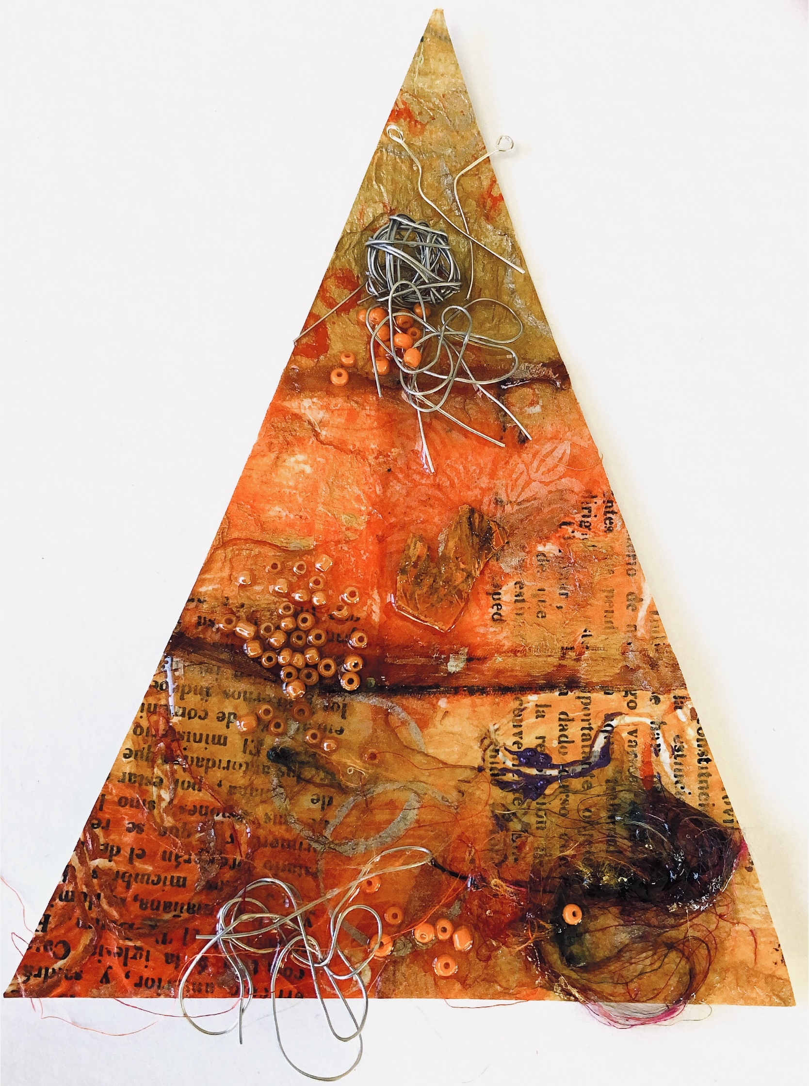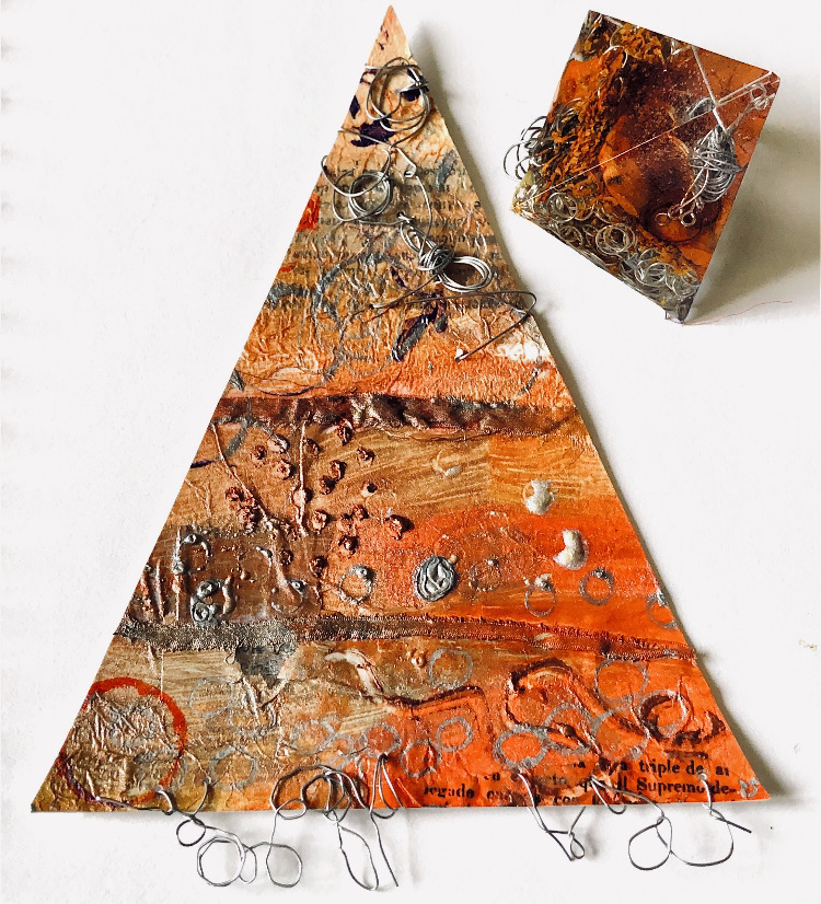 Collaged papers painted as a response. Triangle cut out and wire added.
