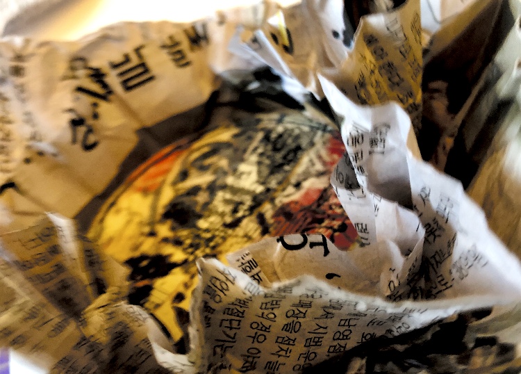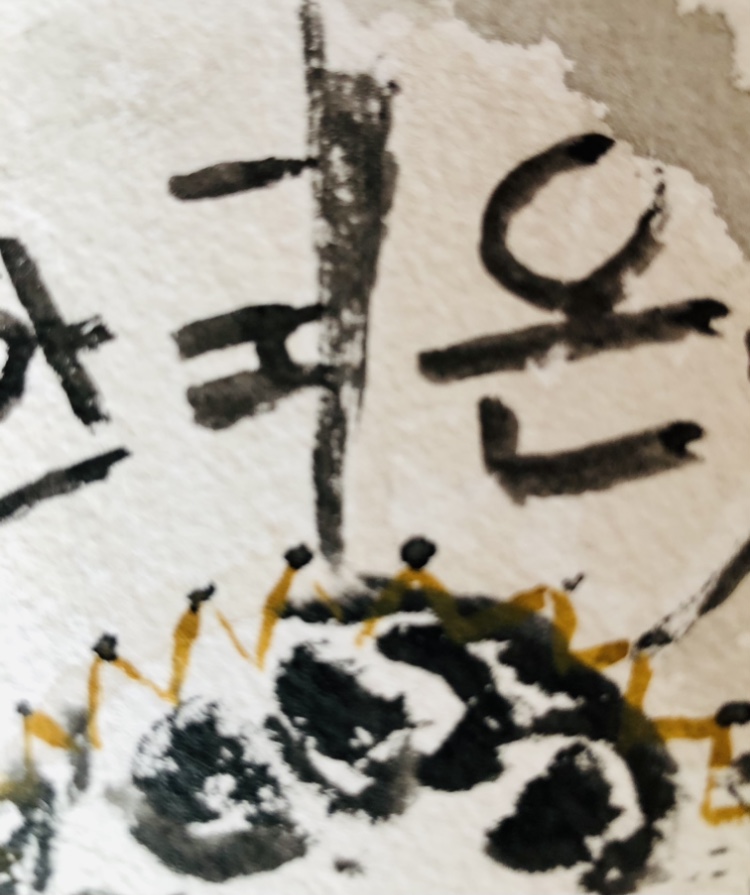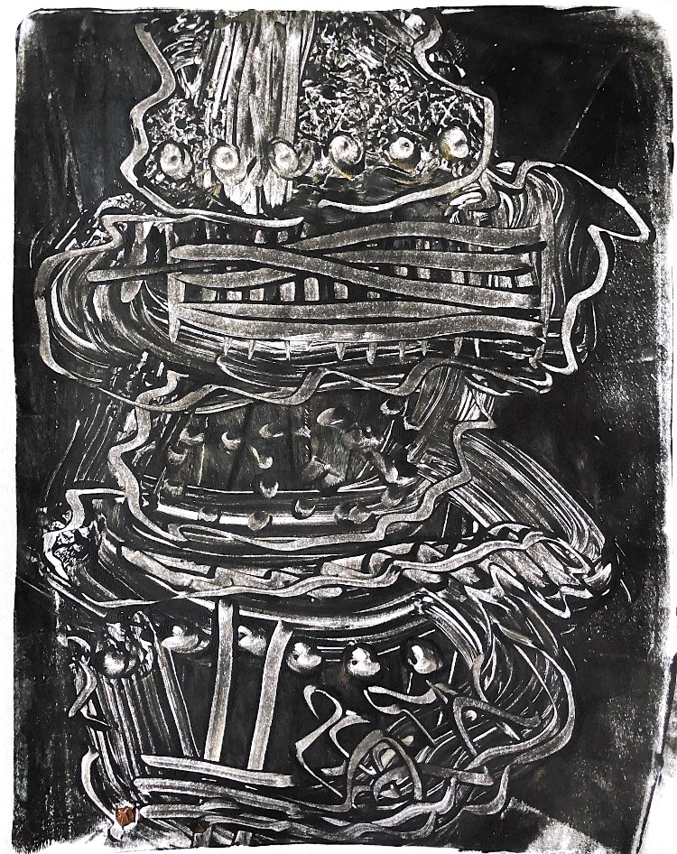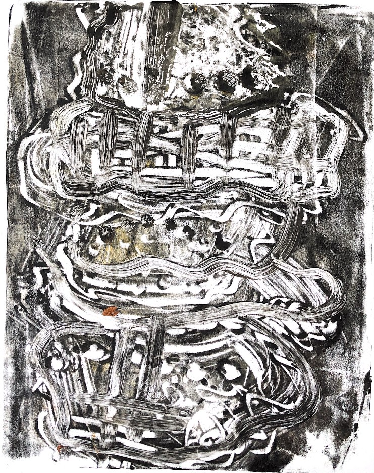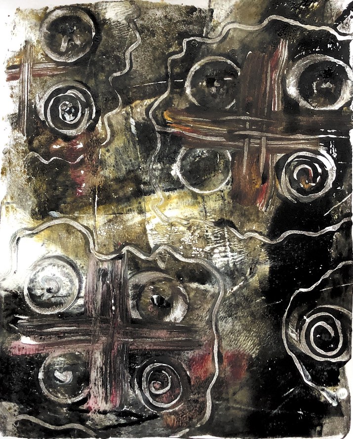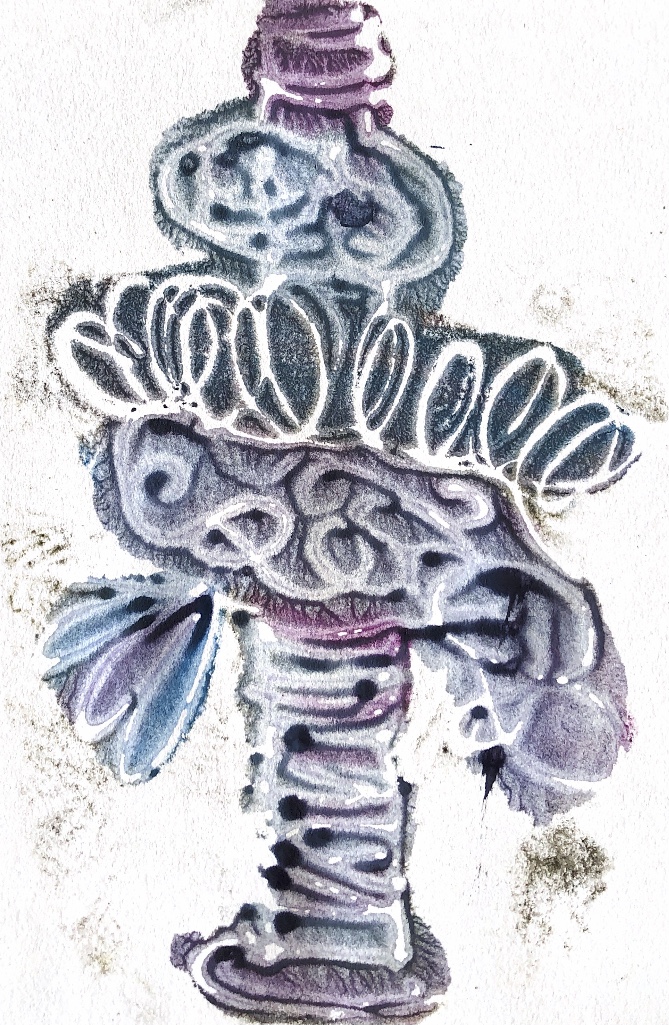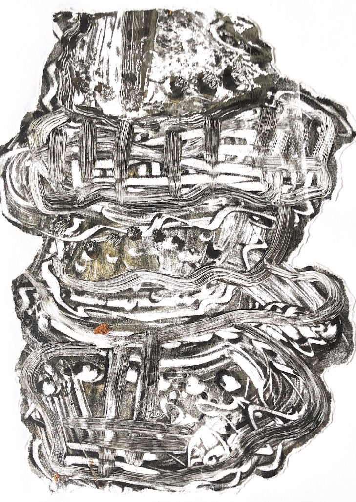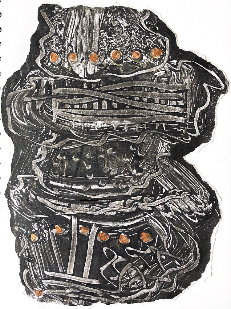 Collaged papers painted as a response. Triangle cut out and wire added.