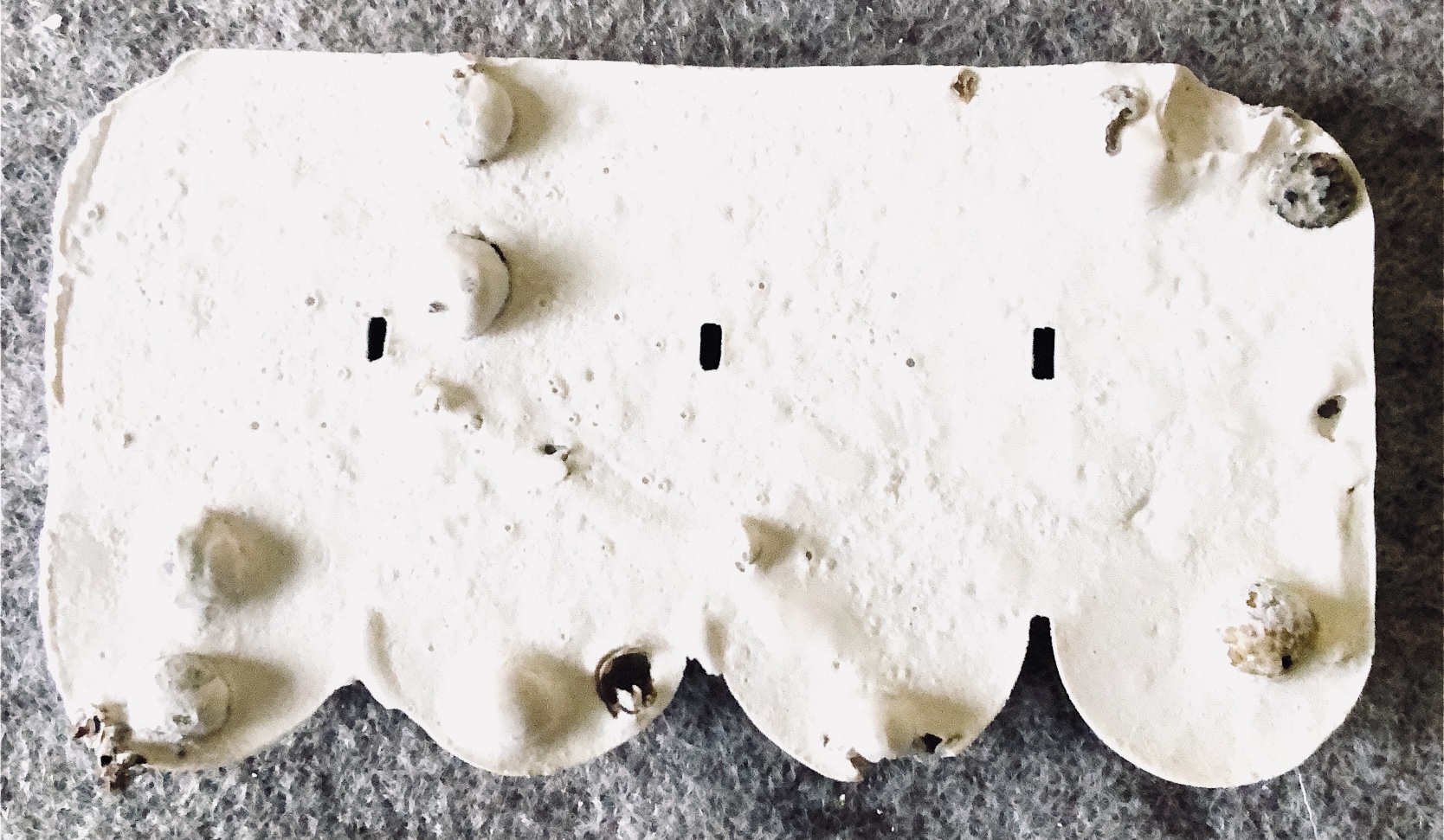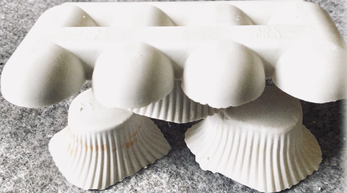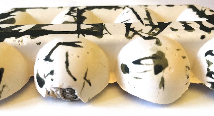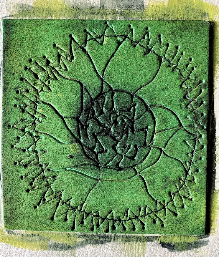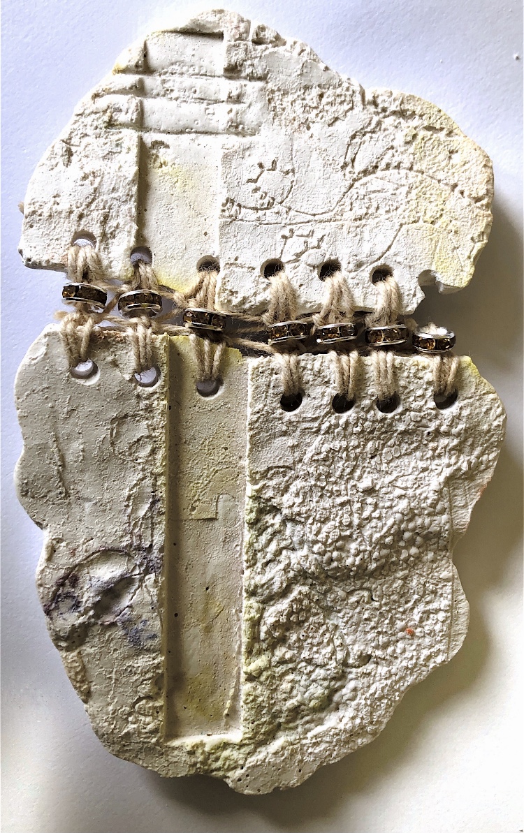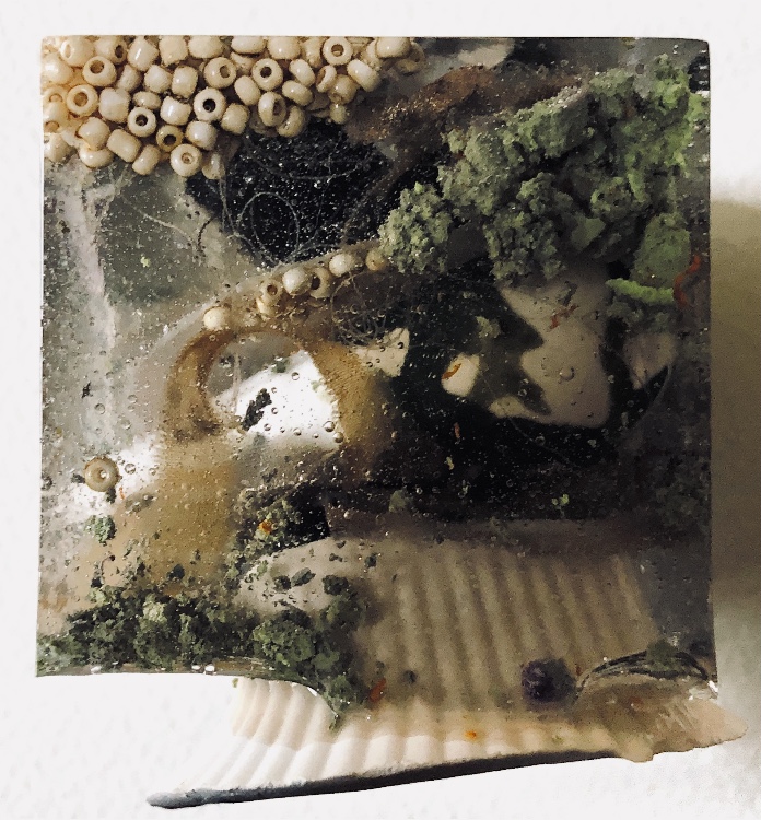 Fig 2. The square mold I filled with beads, plaster of paris shapes, green wax crayon (melted and shaved) fine strips of fabric and felt/plaster stacks tied with cord. I added in a plaster shape as a stand so that the cube stands at an angle off of the surface. This has a feel of the forest – underfoot. It it like a view underground of moss, pebbles. rocks and buried treasure, or maybe a rockpool – especially as the bubbles can be clearly seen in this sample.