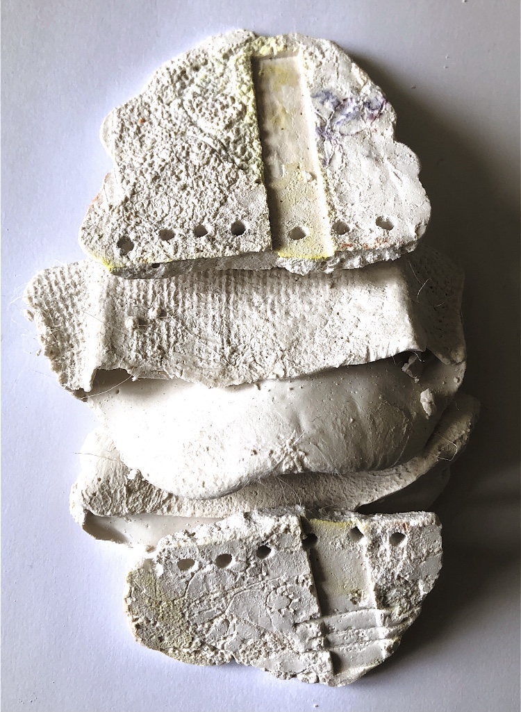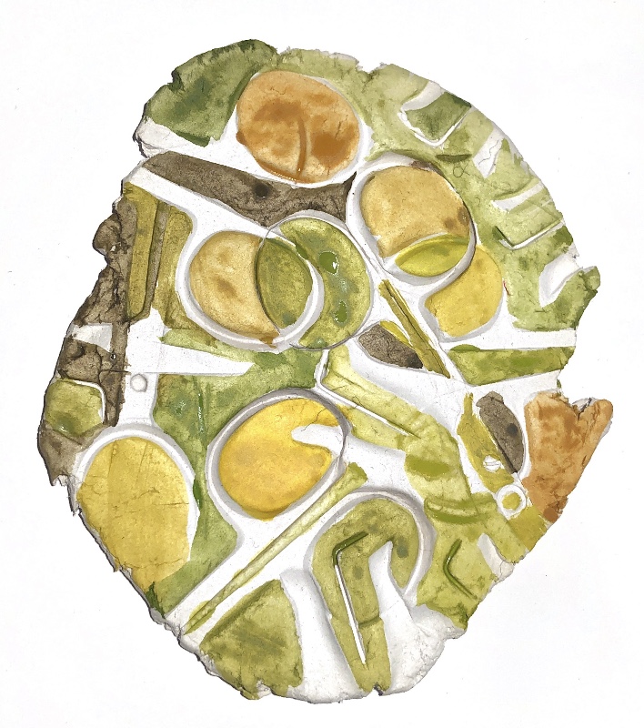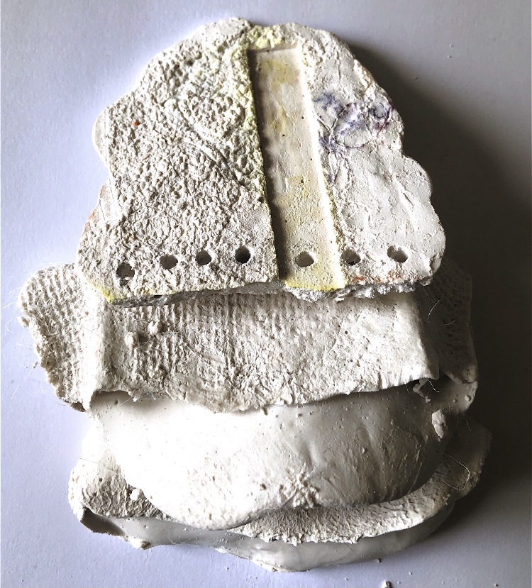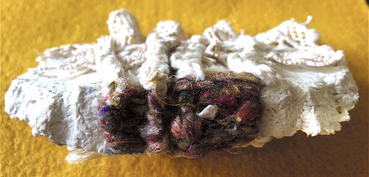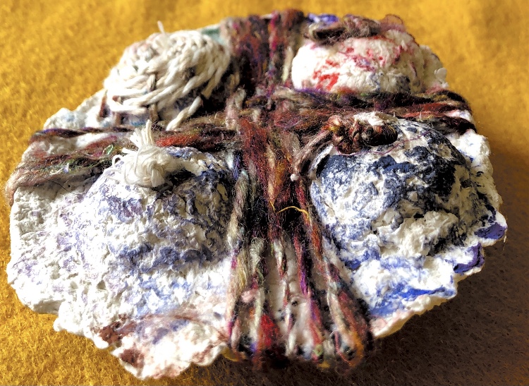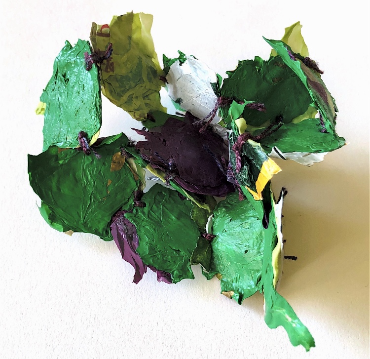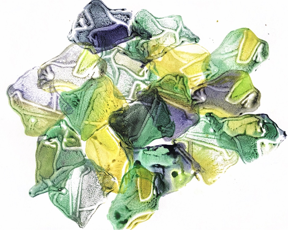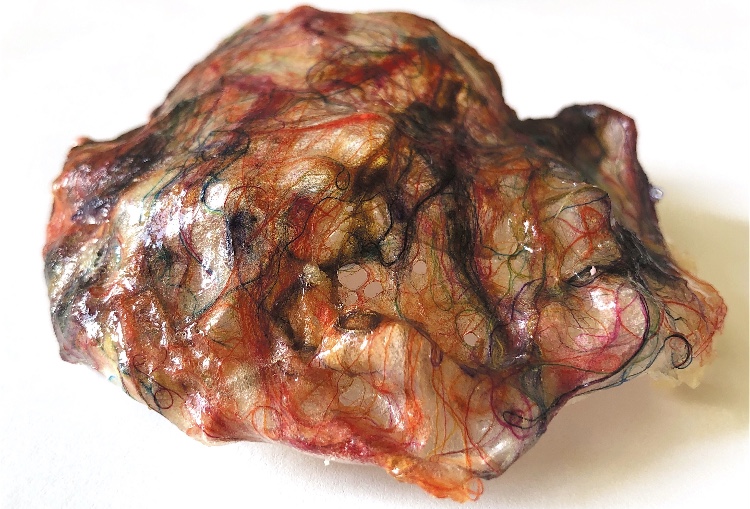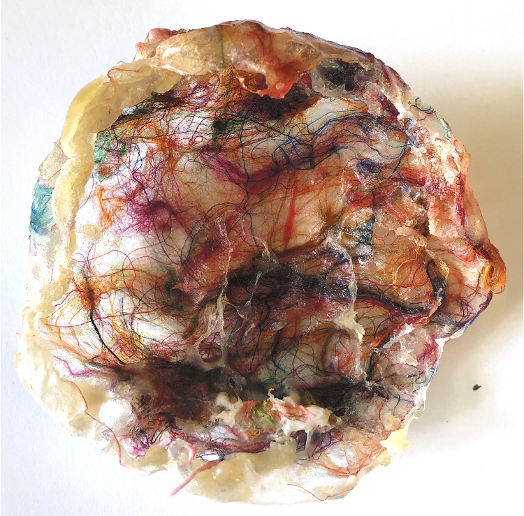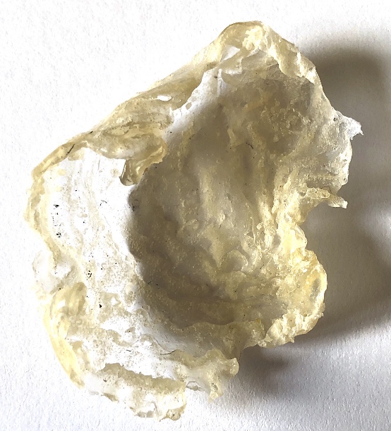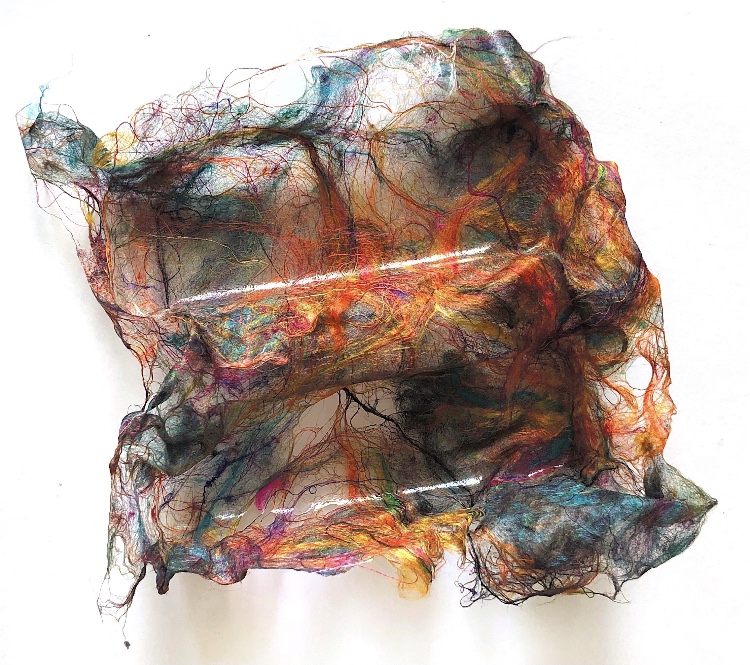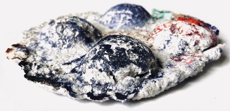 Fig 3. For this asymmetric mold I added pieces of heat treated and painted Tyvek and molded latex from a previous sample. There is a strong contrast between the translucent ethereal pieces of latex and the strong jewel like Tyvek pieces which catch the eye. There is movement in this sample where the latex bends and twists like a jellyfish or seaweed.