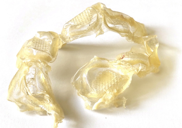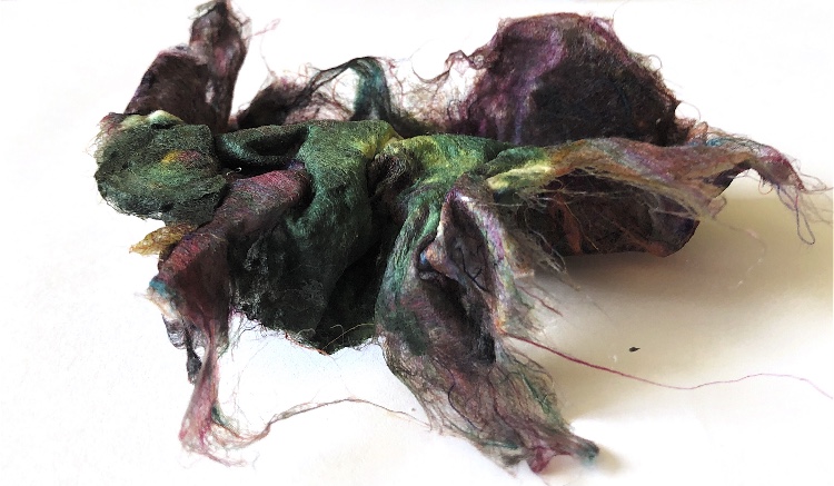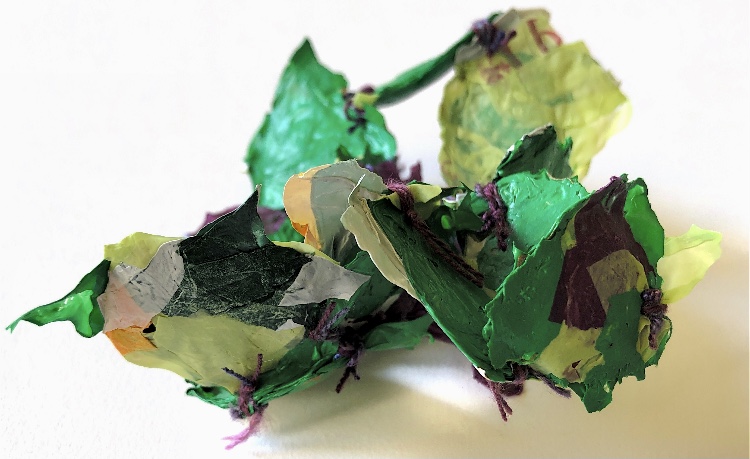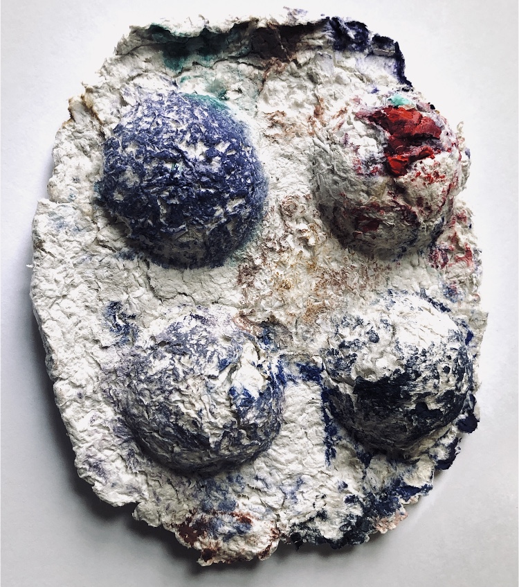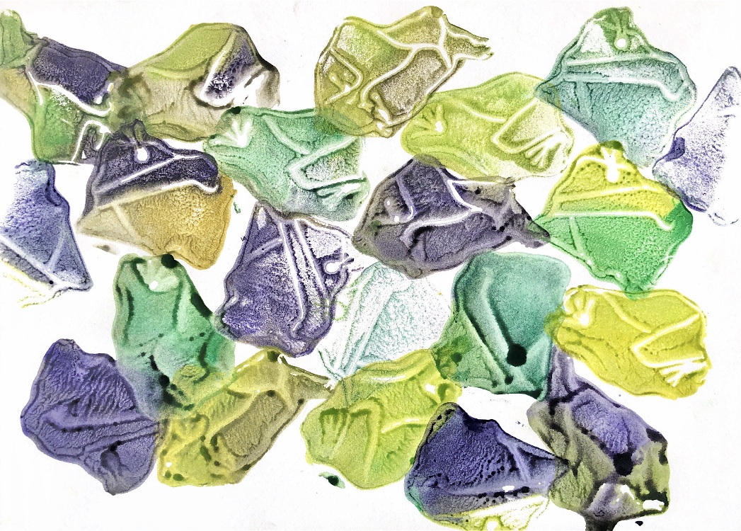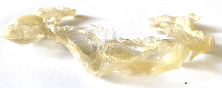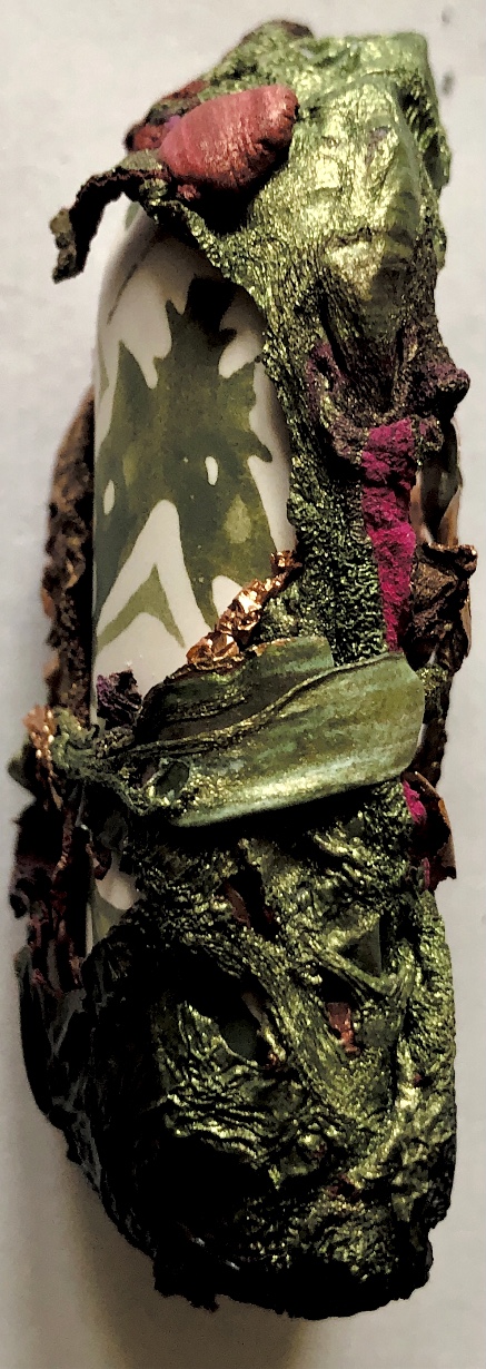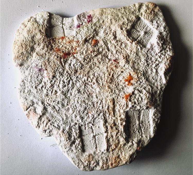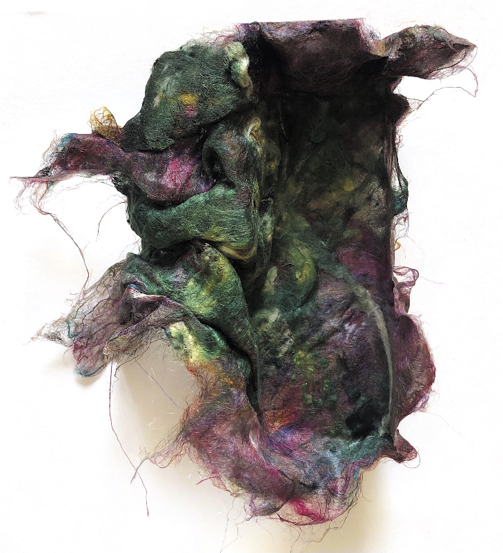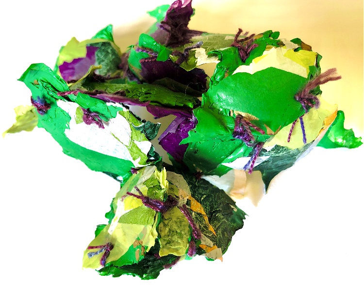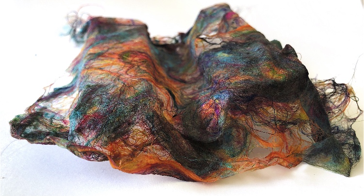Fig 3. For this asymmetric mold I added pieces of heat treated and painted Tyvek and molded latex from a previous sample. There is a strong contrast between the translucent ethereal pieces of latex and the strong jewel like Tyvek pieces which catch the eye. There is movement in this sample where the latex bends and twists like a jellyfish or seaweed.