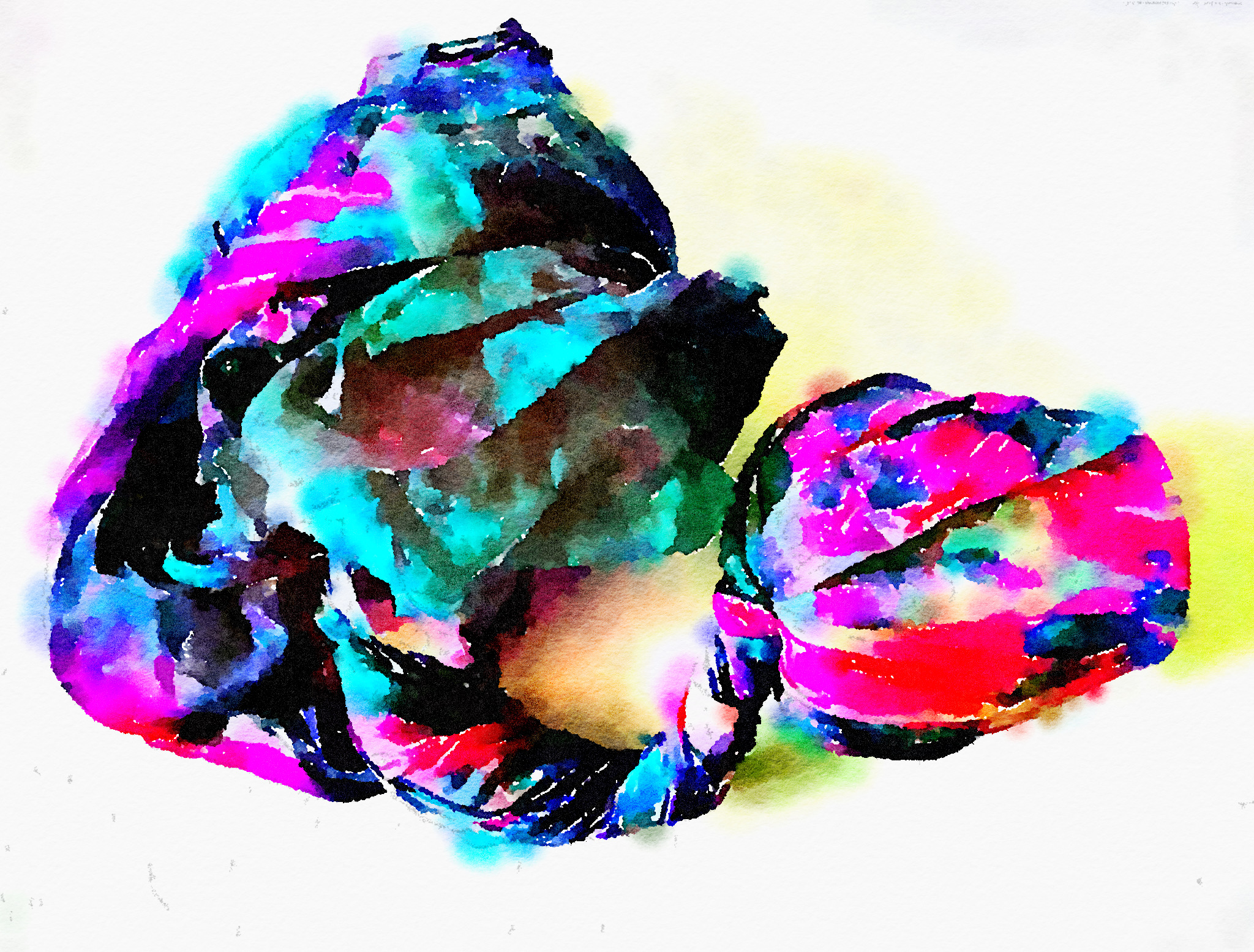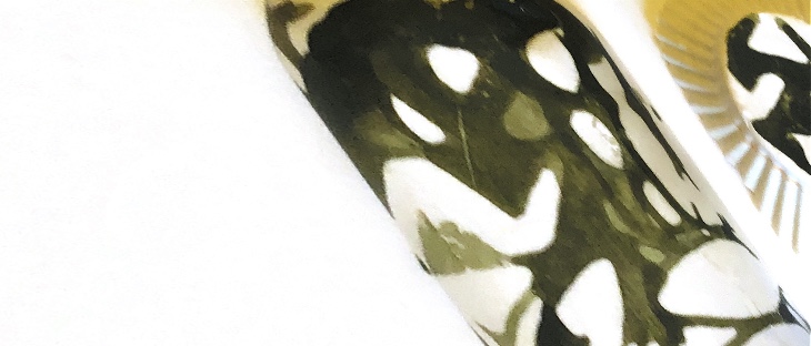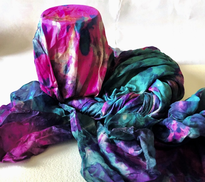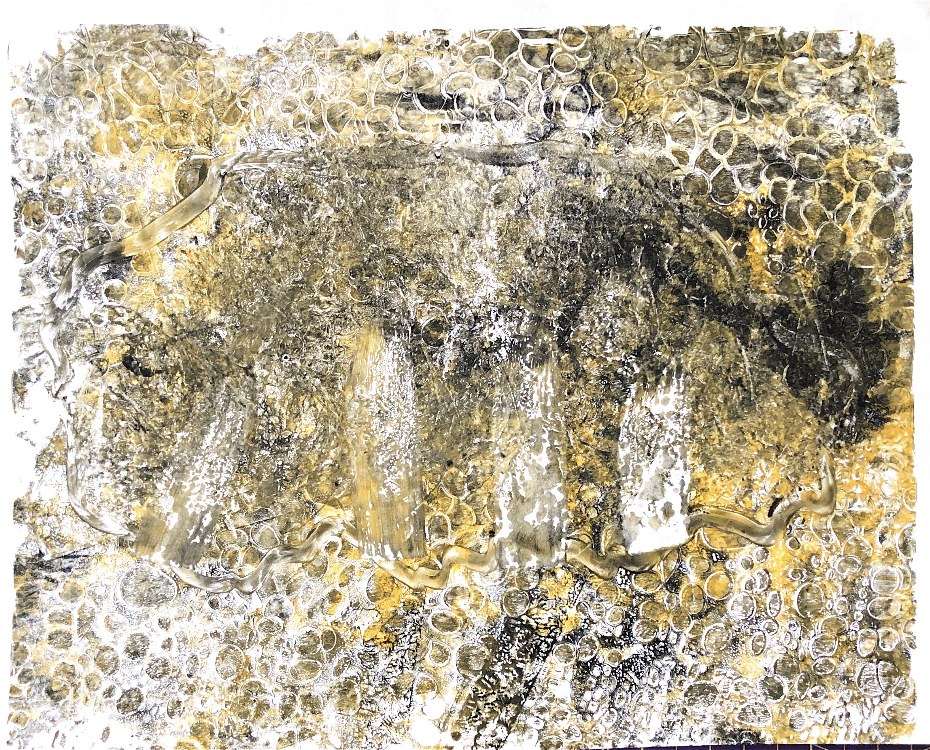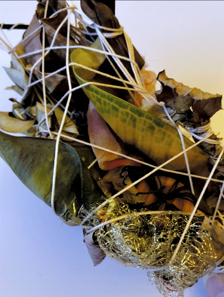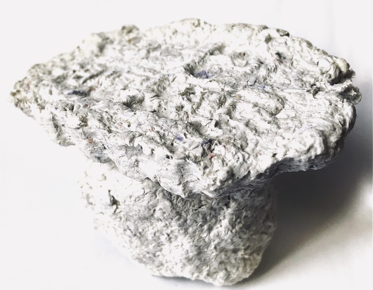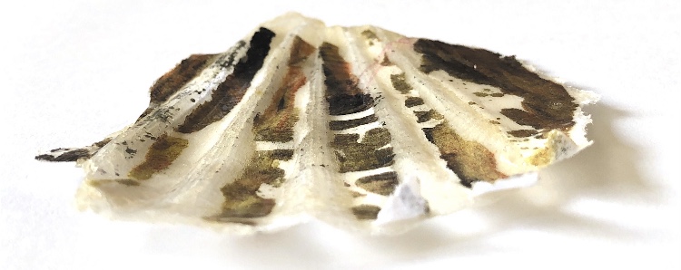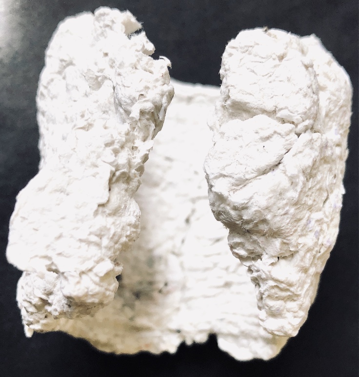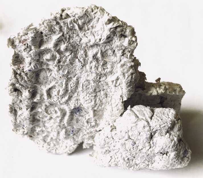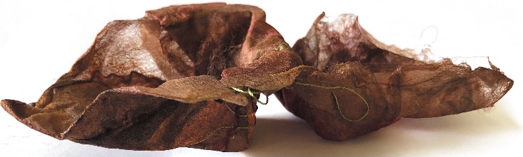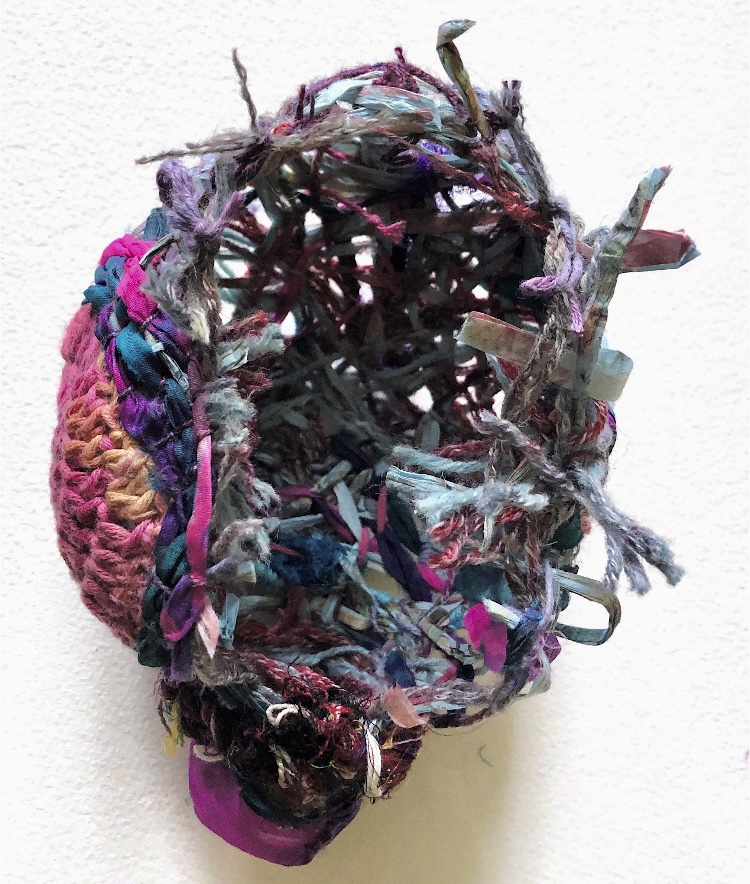 Fig 3. For this asymmetric mold I added pieces of heat treated and painted Tyvek and molded latex from a previous sample. There is a strong contrast between the translucent ethereal pieces of latex and the strong jewel like Tyvek pieces which catch the eye. There is movement in this sample where the latex bends and twists like a jellyfish or seaweed.