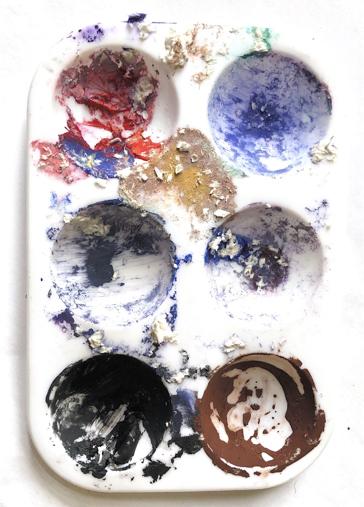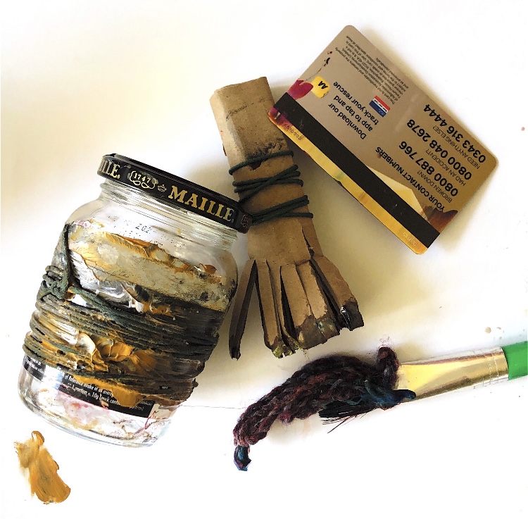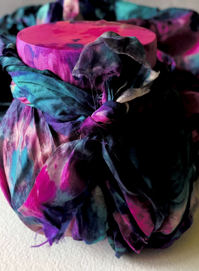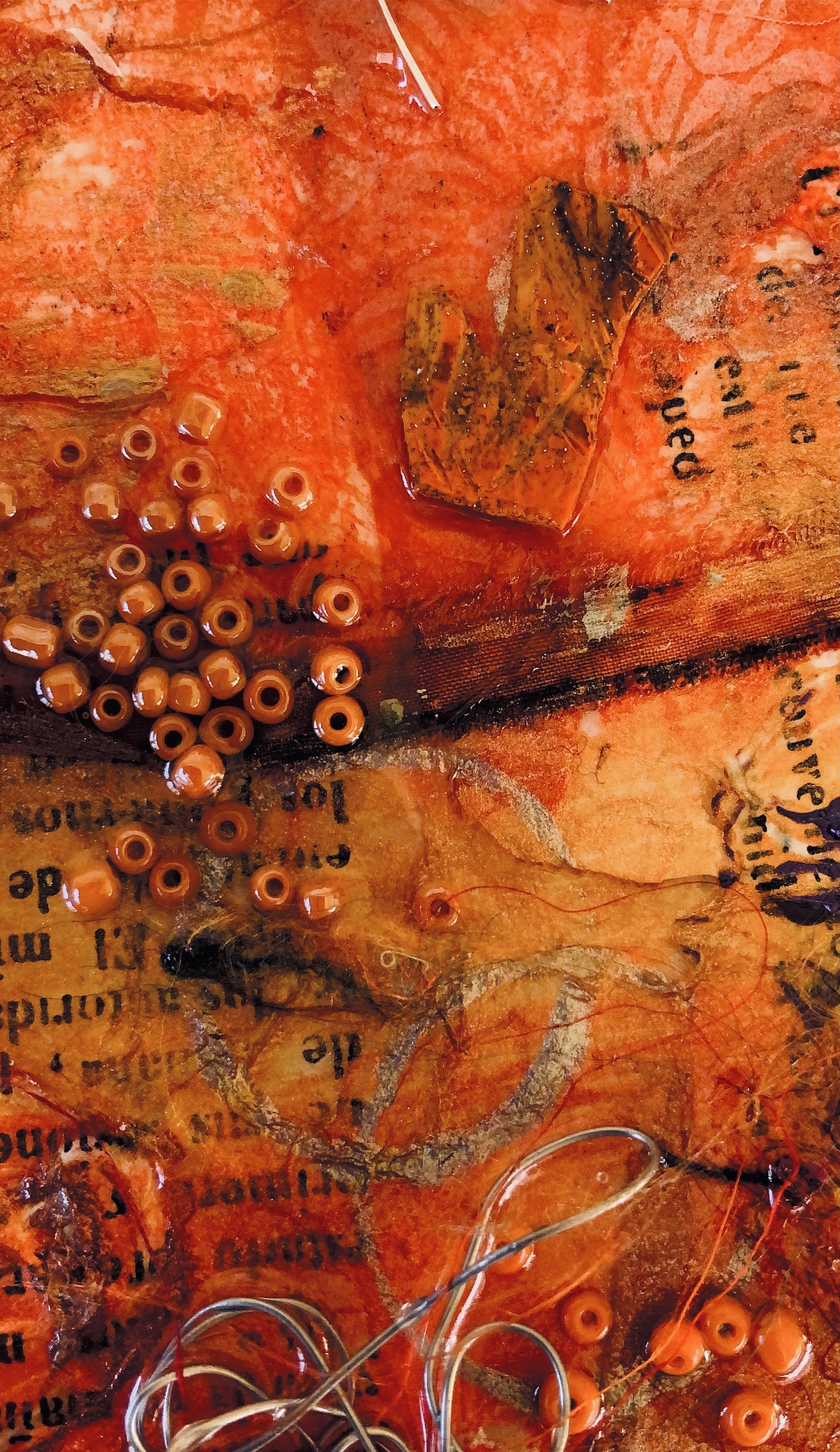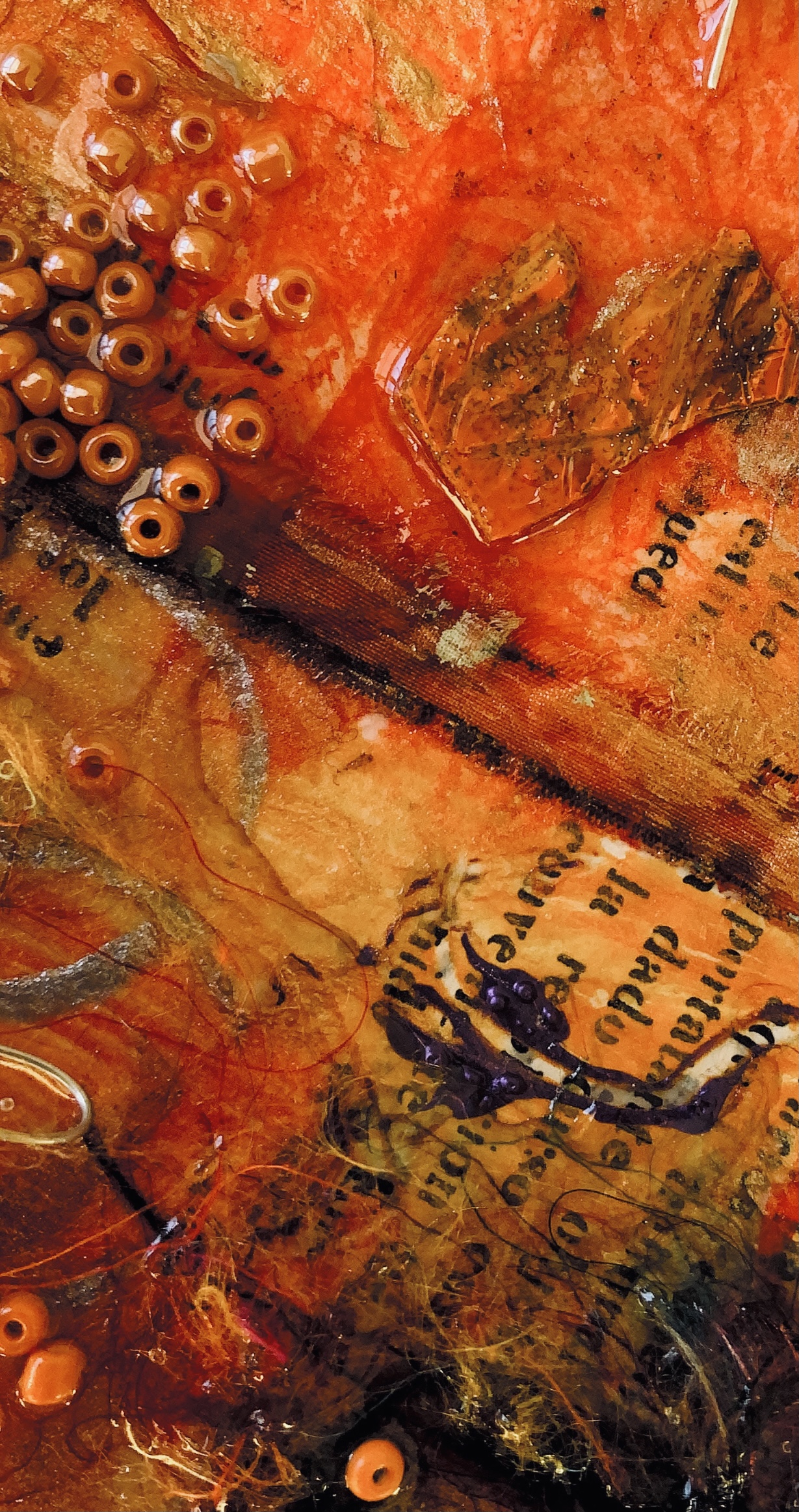 I experimented further by pouring resin onto one of my triangles to add more materials. It is difficult to see in the photos but this made a shiny raised coating which emphasised the colours and trapped materials beautifully.