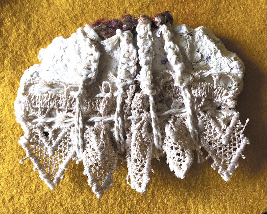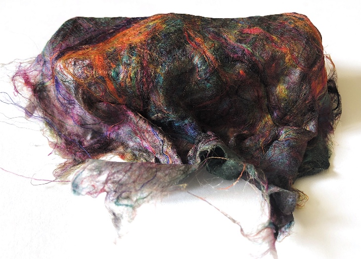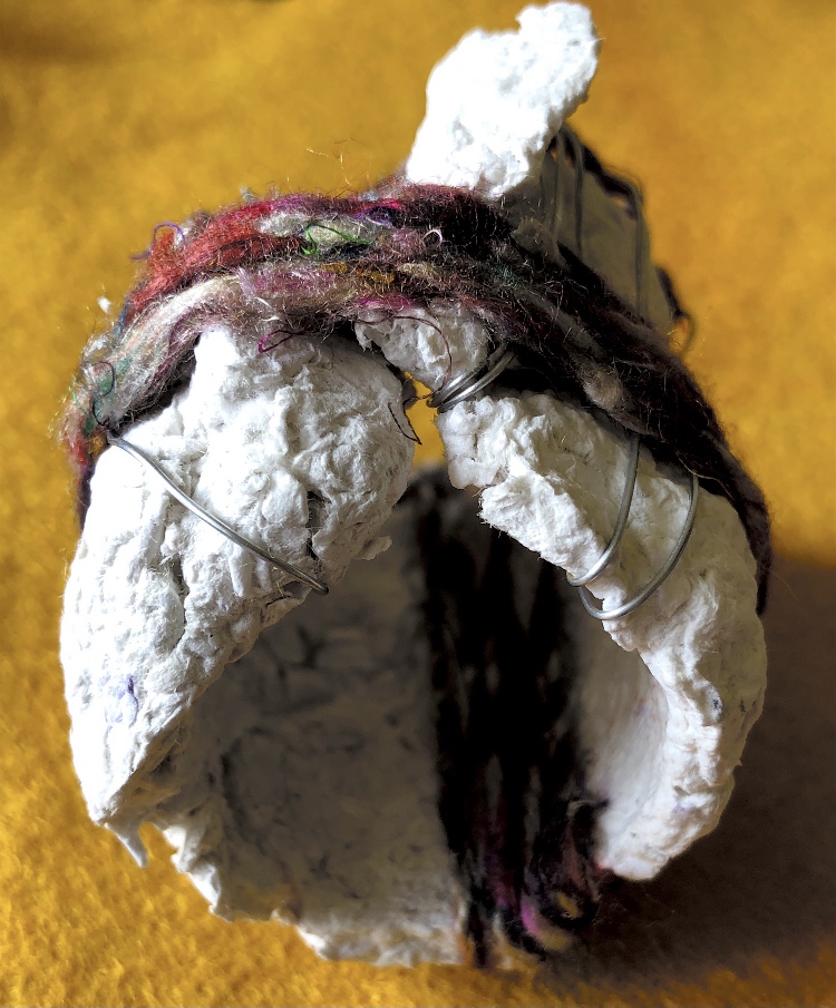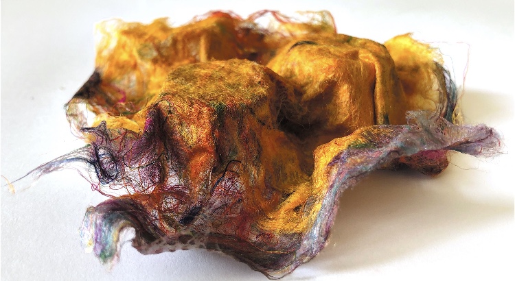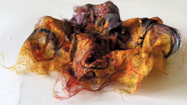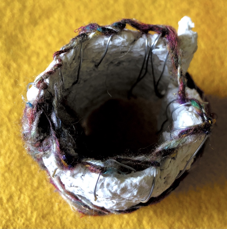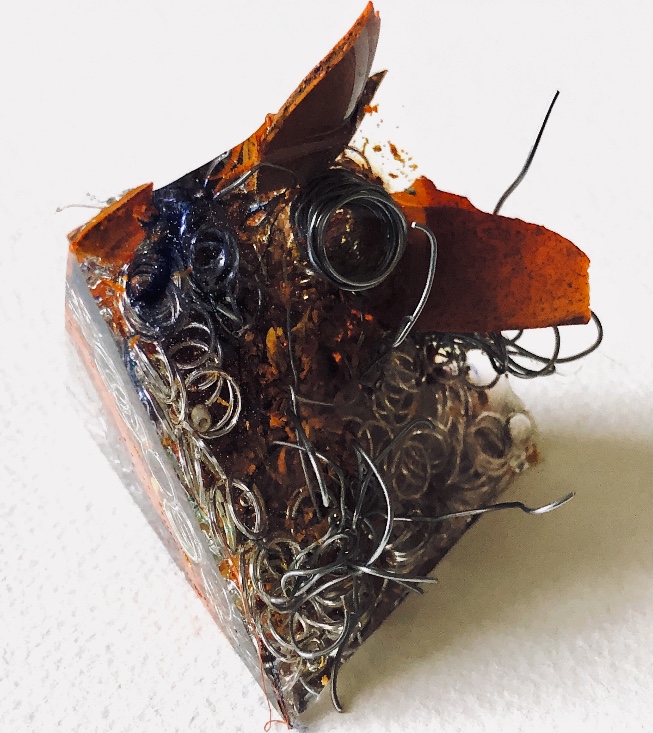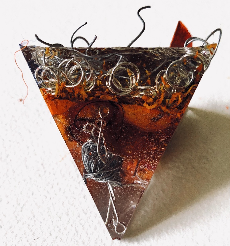 Fig 1. Pyramid mold. For this sample I was inspired by the pictures and samples of barbed wire with fibres caught on the barbs. I used wire and jewellery findings together with silk fibres and wax crayon melted and shaved to give colour. Every facet gives a different view. The orange colour works well as a contrast to the wire.