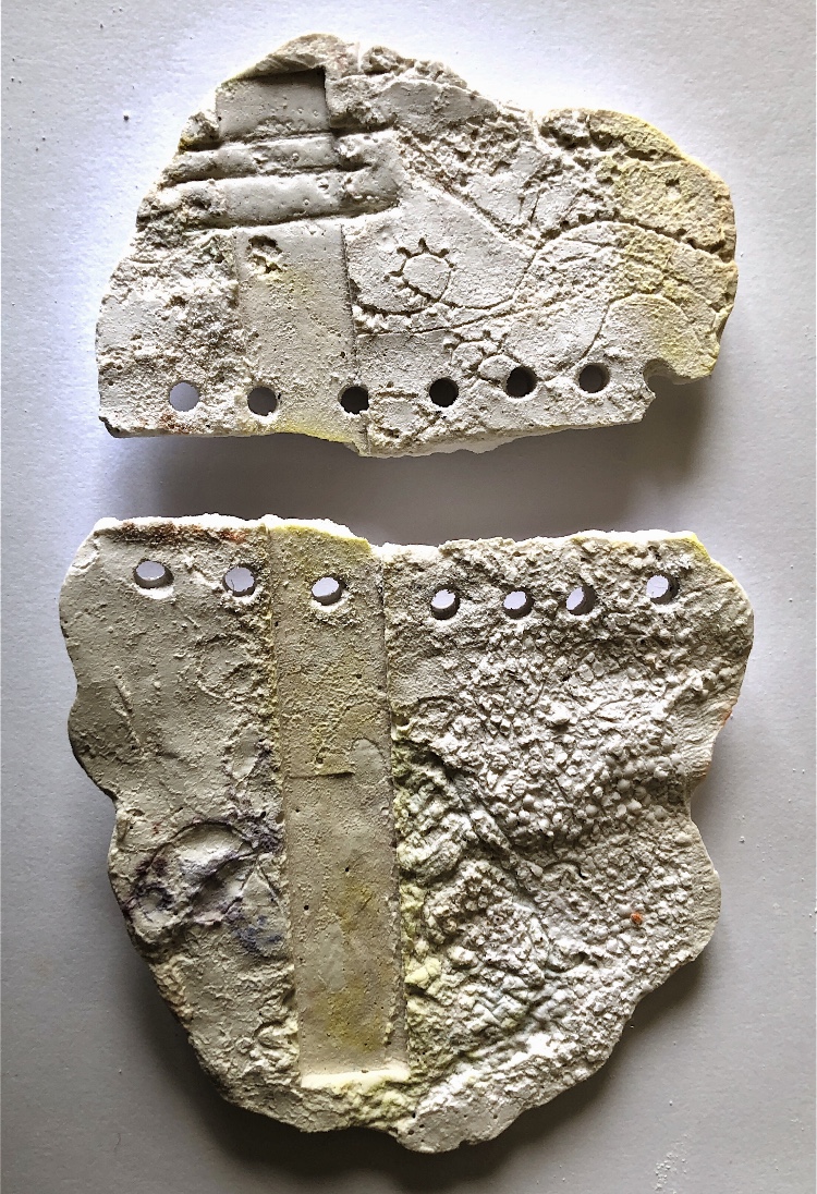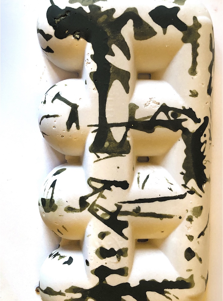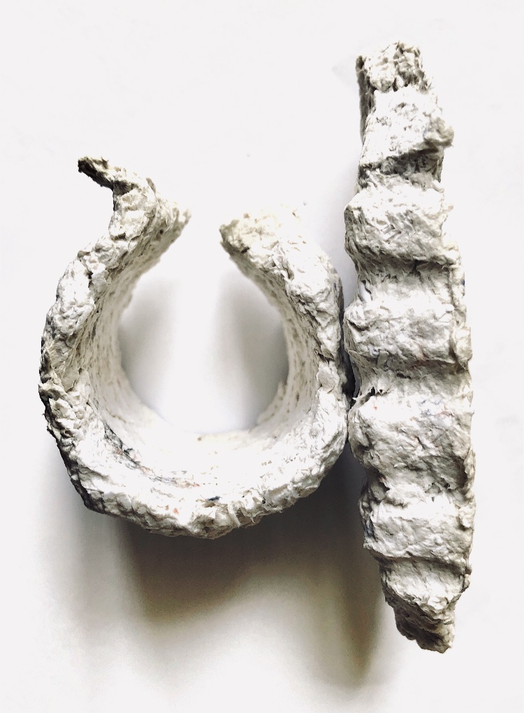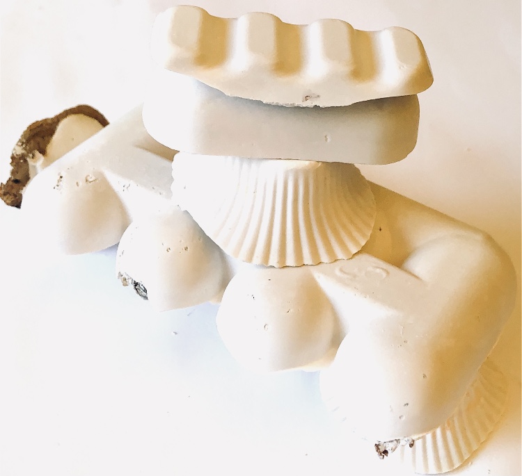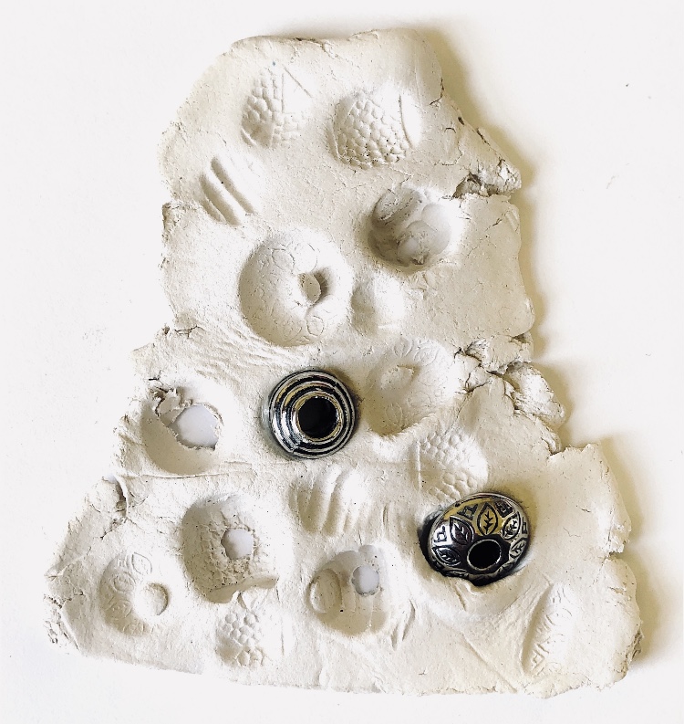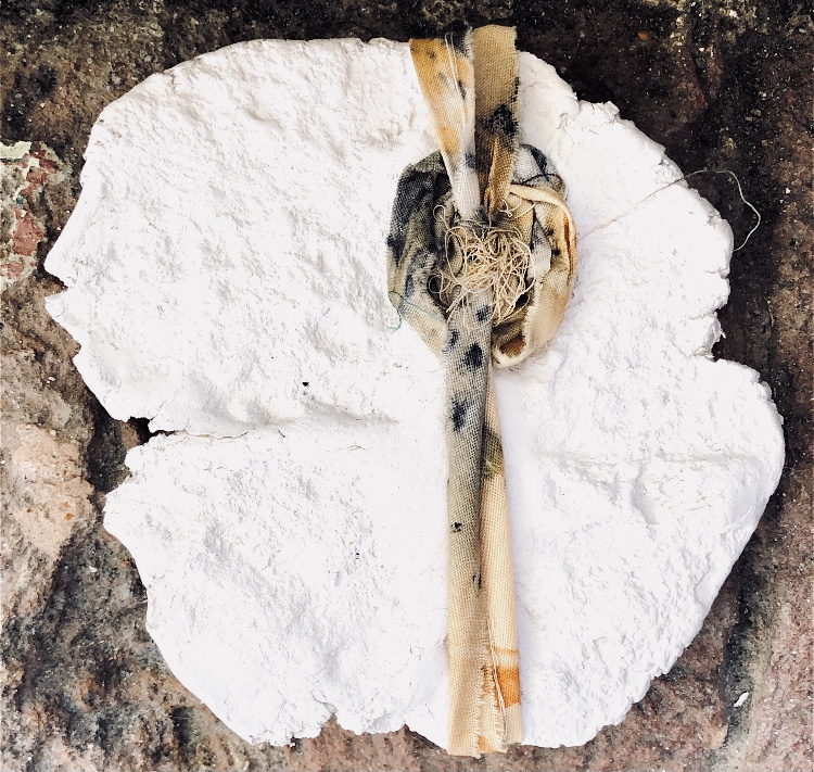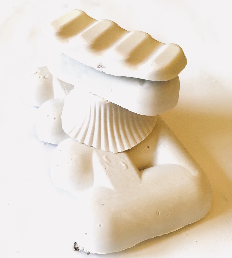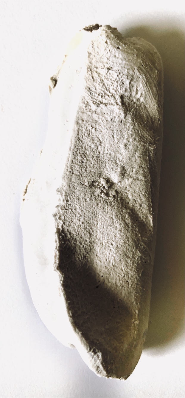 It was a long wait (24 hours) before I could remove the samples from the mold and hold them in my hands to view from all angles. They are satisfyingly smooth and heavy, but I deliberately left one side with protruding objects for a contrast. There are bubbles in the resin but I rather like the idea that the objects have been submerged and captured in a moment in time with bubbles rising from this action. It feels natural.