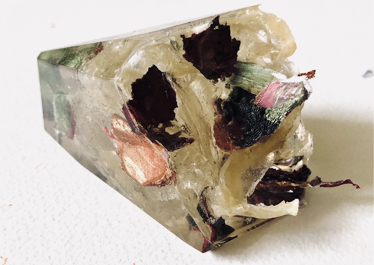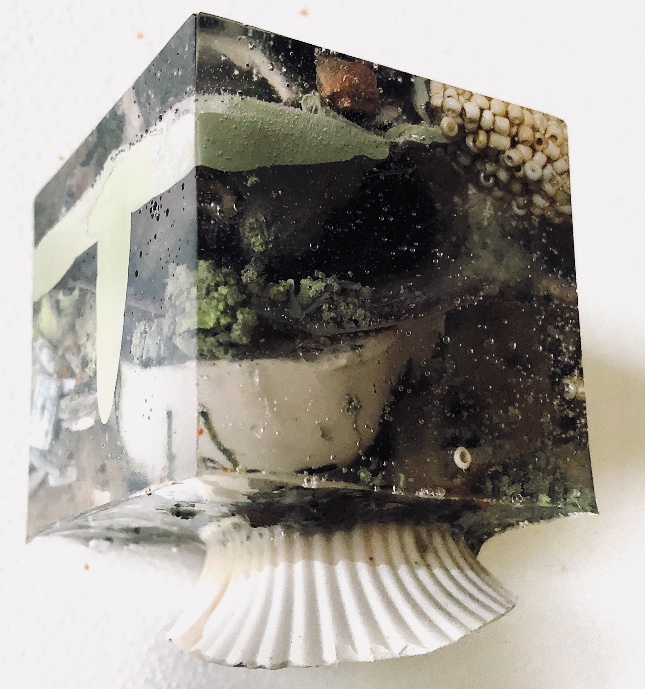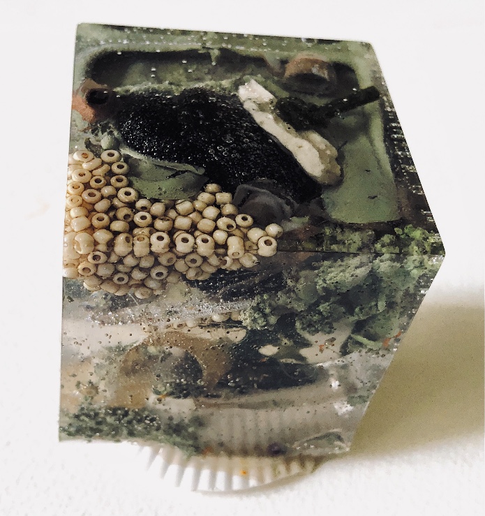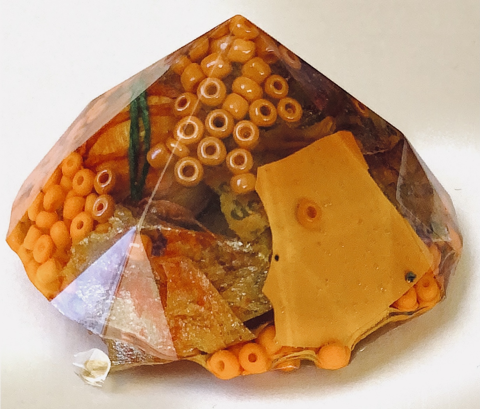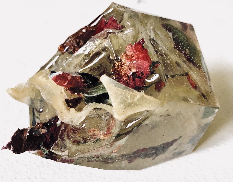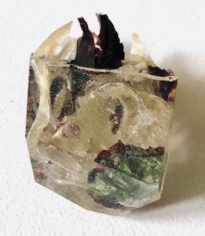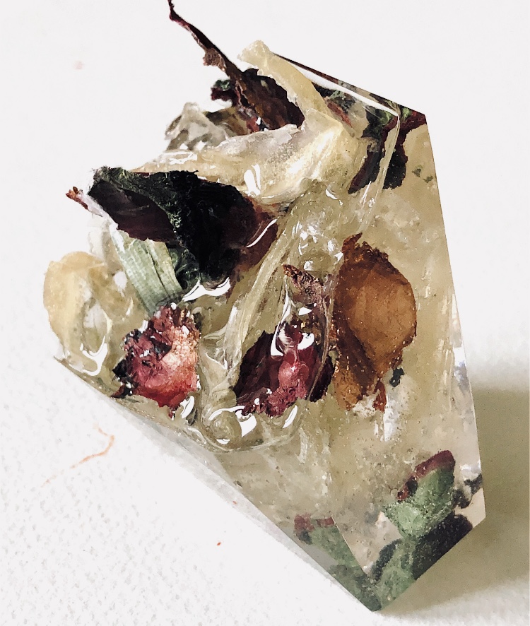 What an amazing material – making 3d objects that encourage the viewer to look at what is encased in a different way. It enables lots of materials to be put together in a microcosm. The materials are suspended in time and space. Light travels through the pieces and is also reflected by the facets and materials inside.,