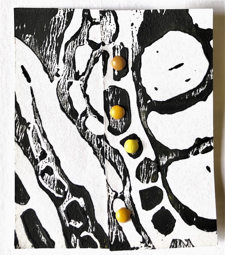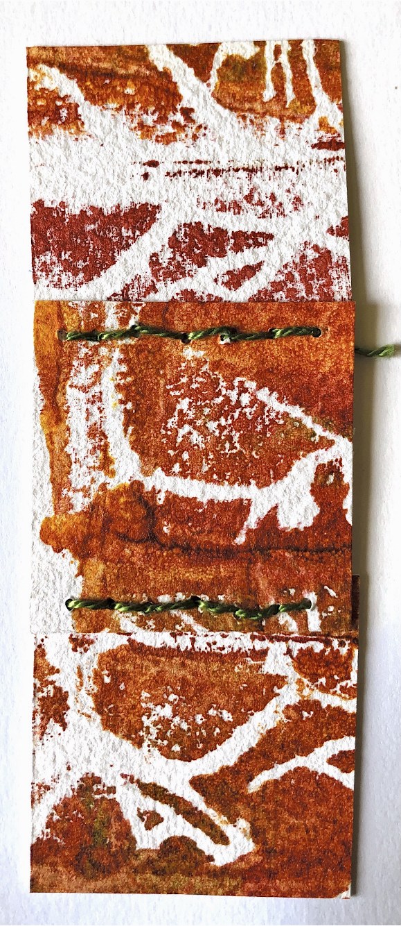 Looking at this sample and also some of the work I did with leaves I decided to experiment with a more natural colour scheme and materials. Using watercolour paper eco-dyed with plant material, I blanket stitched along the edge enclosing leaves. Substituting felted ‘stones’ for the buttons worked well and proved easy to stitch through. This method of joining could be used to make a book, or longer concertina shape. Like most of my other samples there is a flexibility to the piece, creating a structural 3D sample.