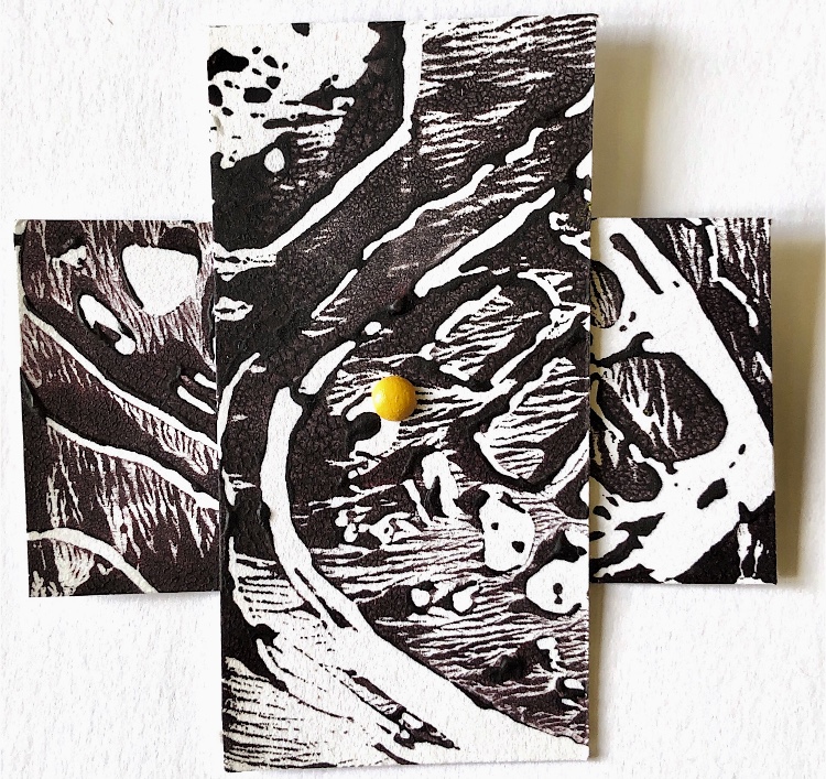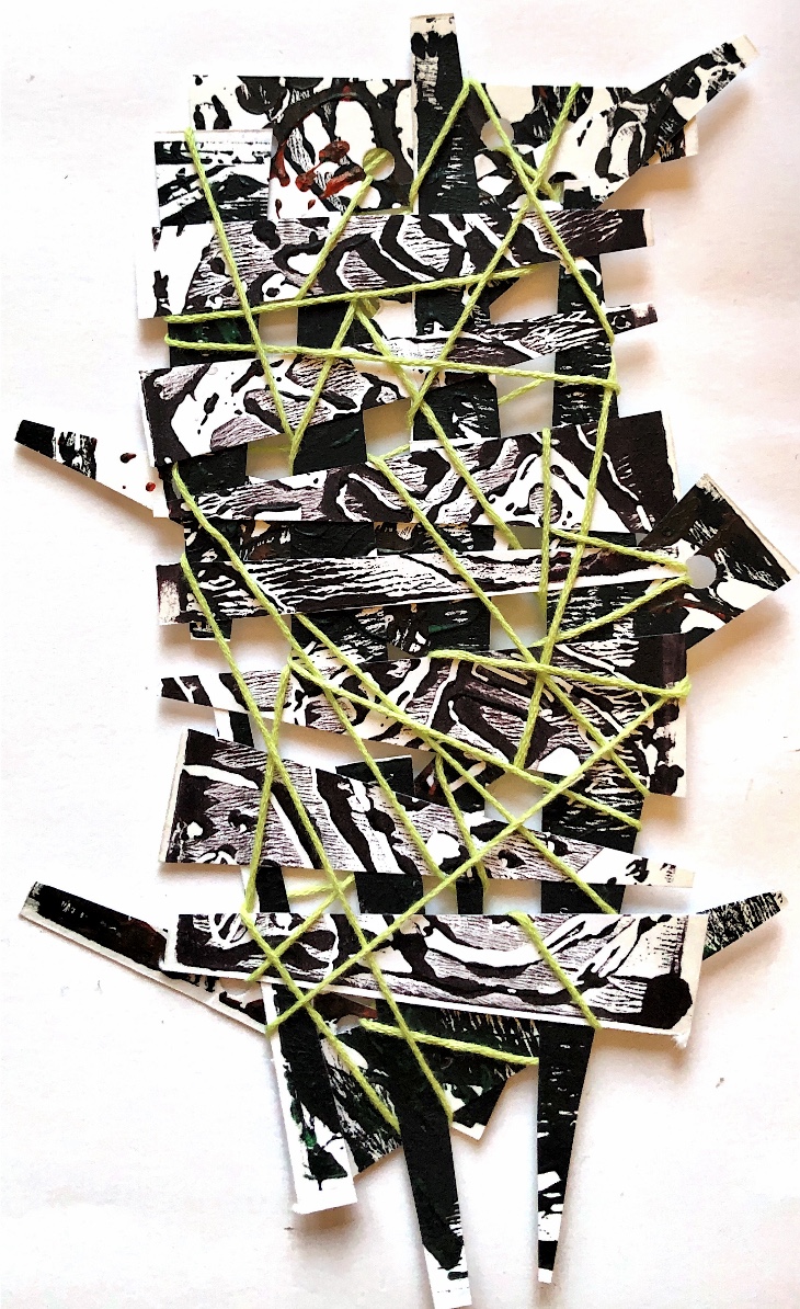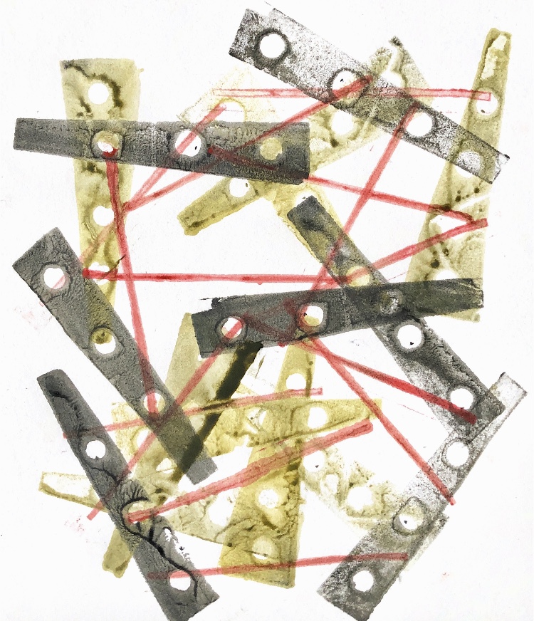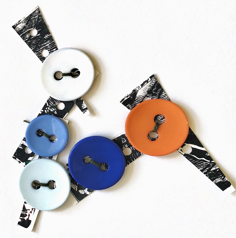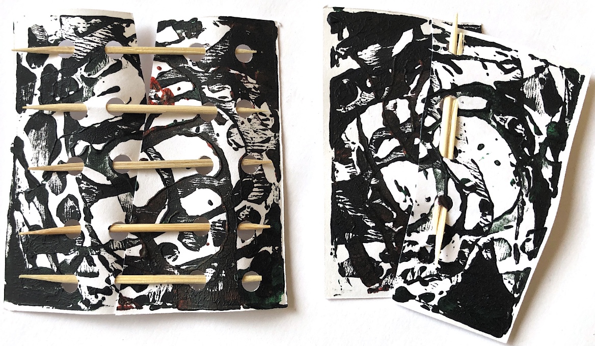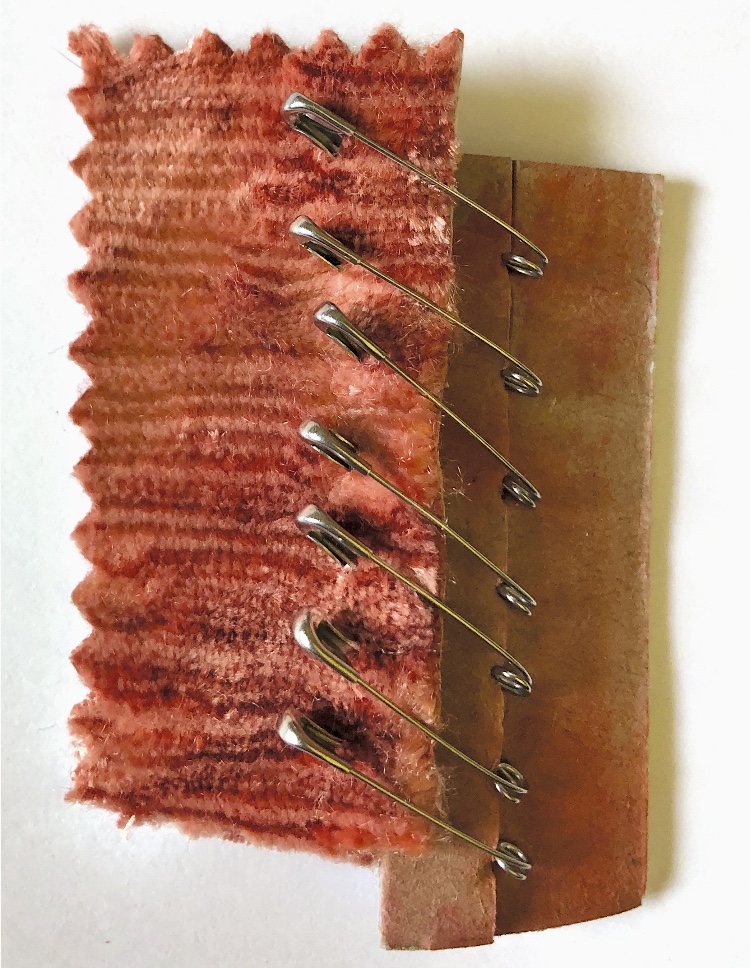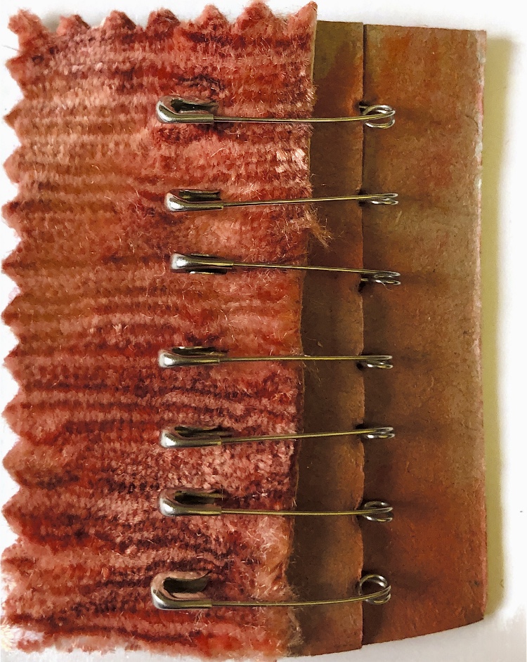 Thick card (this would also work with a thin piece of wood) had holes made with a bradawl and was joined with chenille fabric with safety pins. The method of joining allowed for the materials to be moved up and down and also to be positioned in a ‘v’ shape. I was keen to use the safety pins to make a print – it was easy to imprint a foam sheet with the pins and then print.