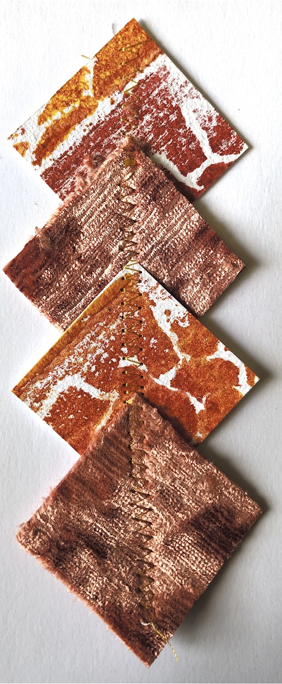 Simple shapes joined with hand stitch, glued strips and machine stitch, plus printed samples joined with paper fasteners and cocktail sticks.