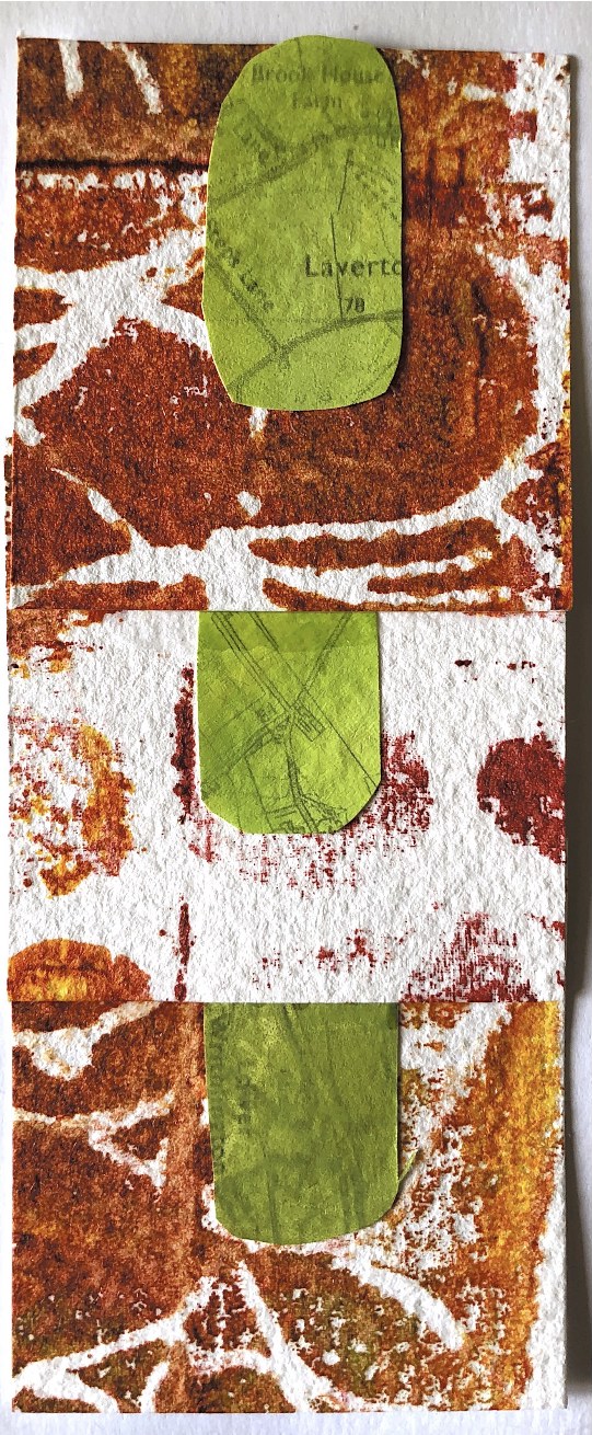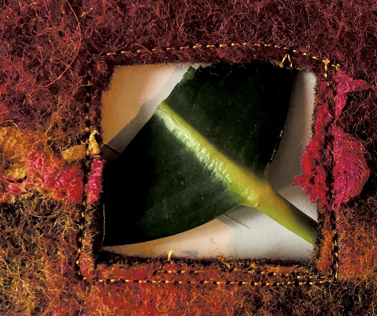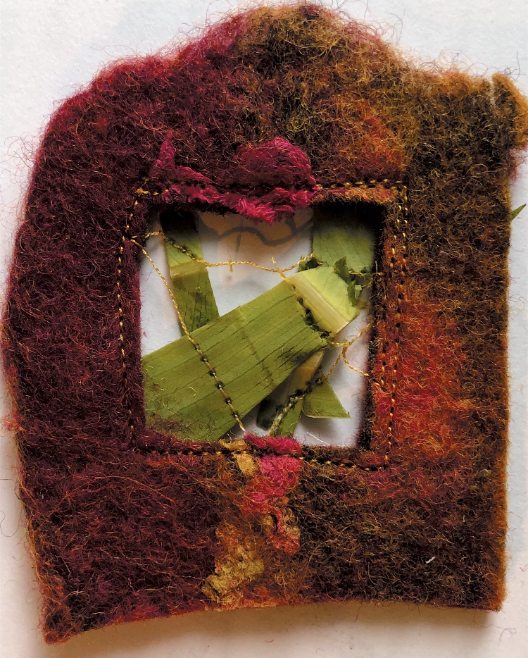 Materials joined – watercolour paper, craft paper, postcard, leaves, hand made felt