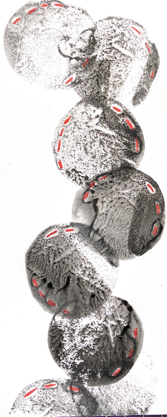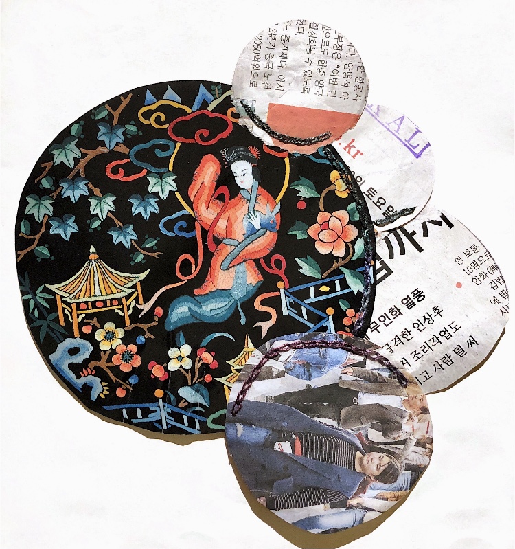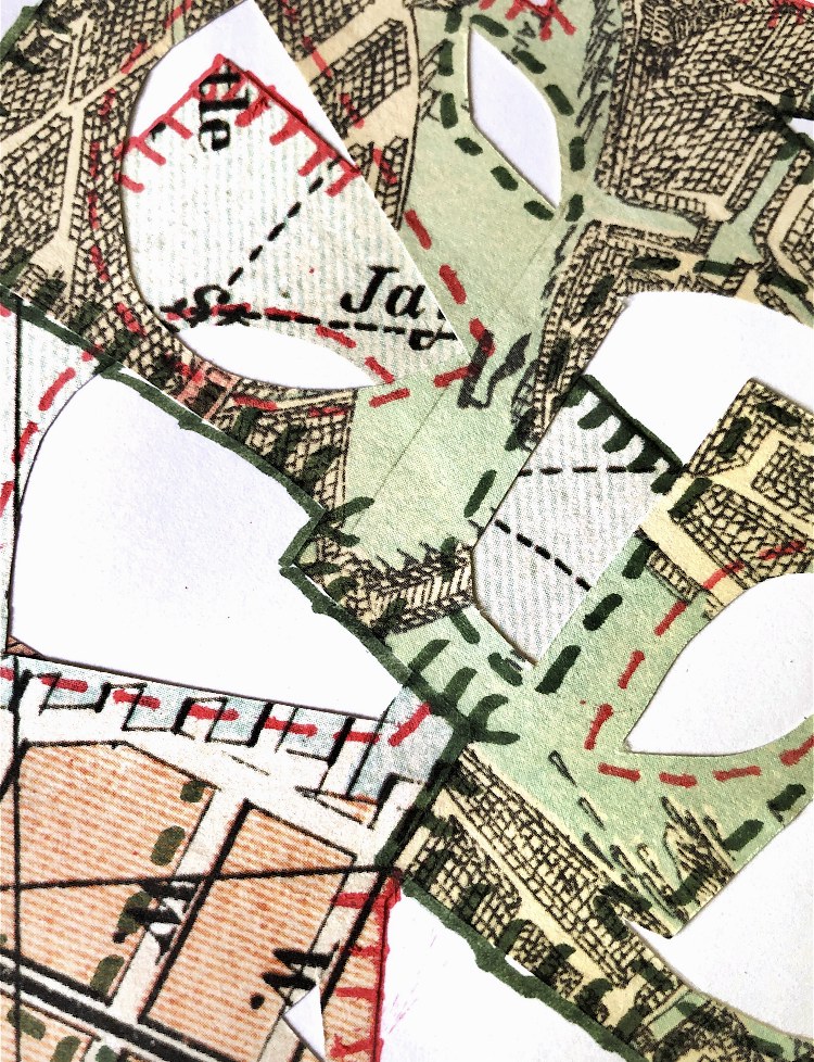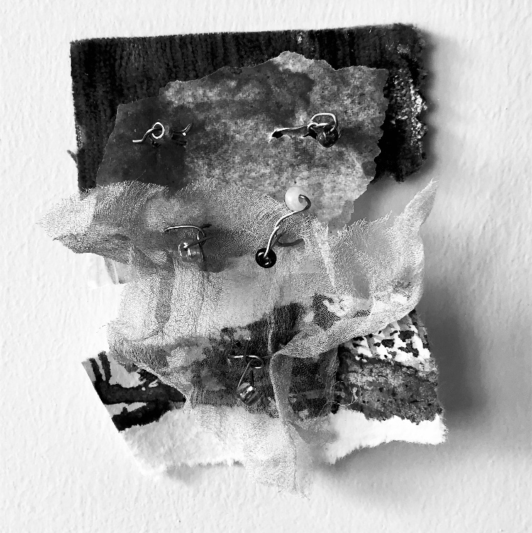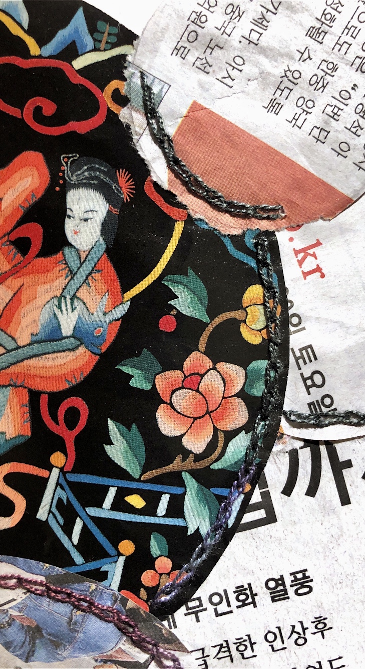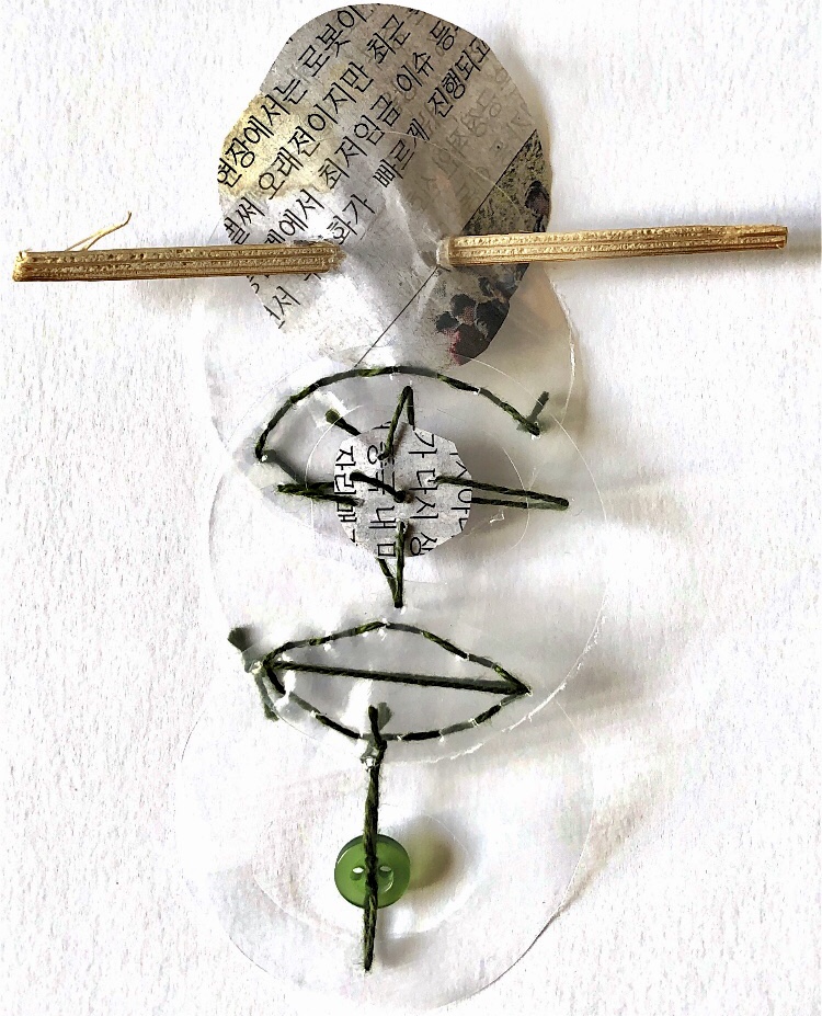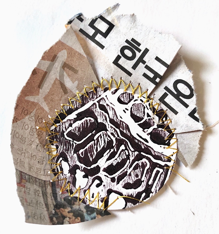 Print on paper with added pen detail, and machine stitching on paper and fabric.