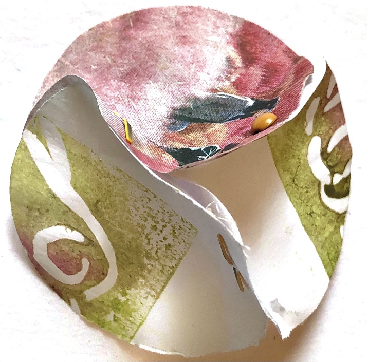 Circle cut from collaged paper with torn circles machine stitched – pleated and gathered to fit. Although this is a relatively simple sample, I wanted to work on the idea of joining different sized curves and to crumple the paper to create a sample that changes every time it opens. Newspaper works really well for this and was easy to join to a sturdy paper circle for the base.