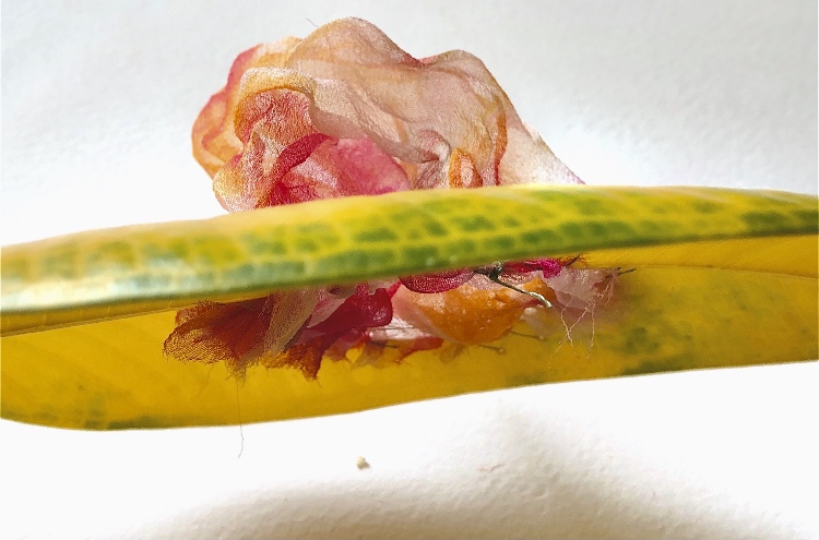 In MMT Part 1 I made some samples with stitched leaves and left them to dry afterwards. I have bound these to a stick using a neutral thread. These samples are full of natural colours and shapes, contrasting with the lines of wrapping and occasional flashes of colour from inside where there are a large button and fine fabric stitched to the leaves.