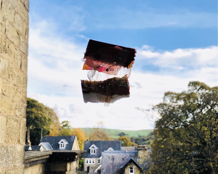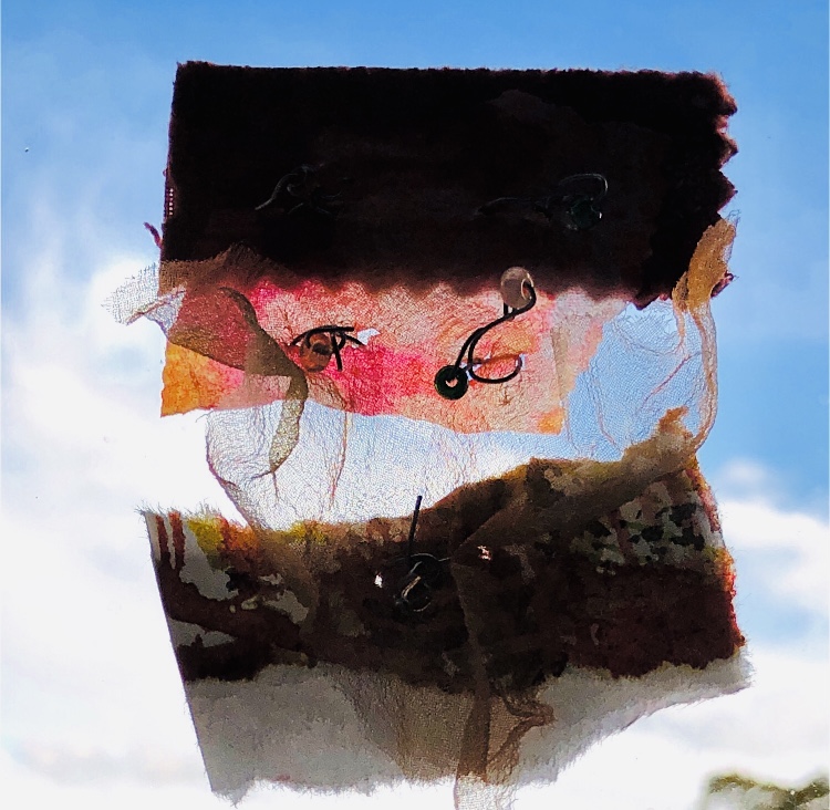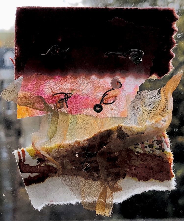 Moving on to translucent fabric overlapped onto a heavy furnishing fabric and watercolour paper, secured with wire and beads – this was a successful sample with lots of possibilities for development. The sample looked very different when photographed against a window – highlighting the transparency of the fabric and darkening the other more solid materials. There is a lot of movement in this piece. I like the way it appears to be floating away in the sky.