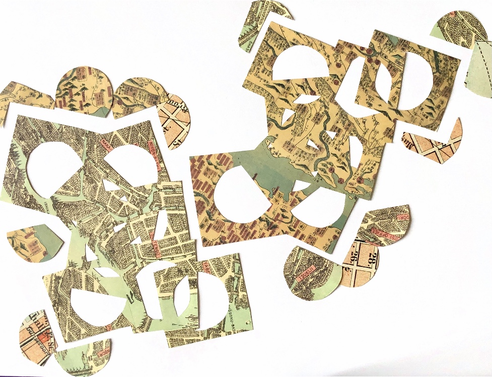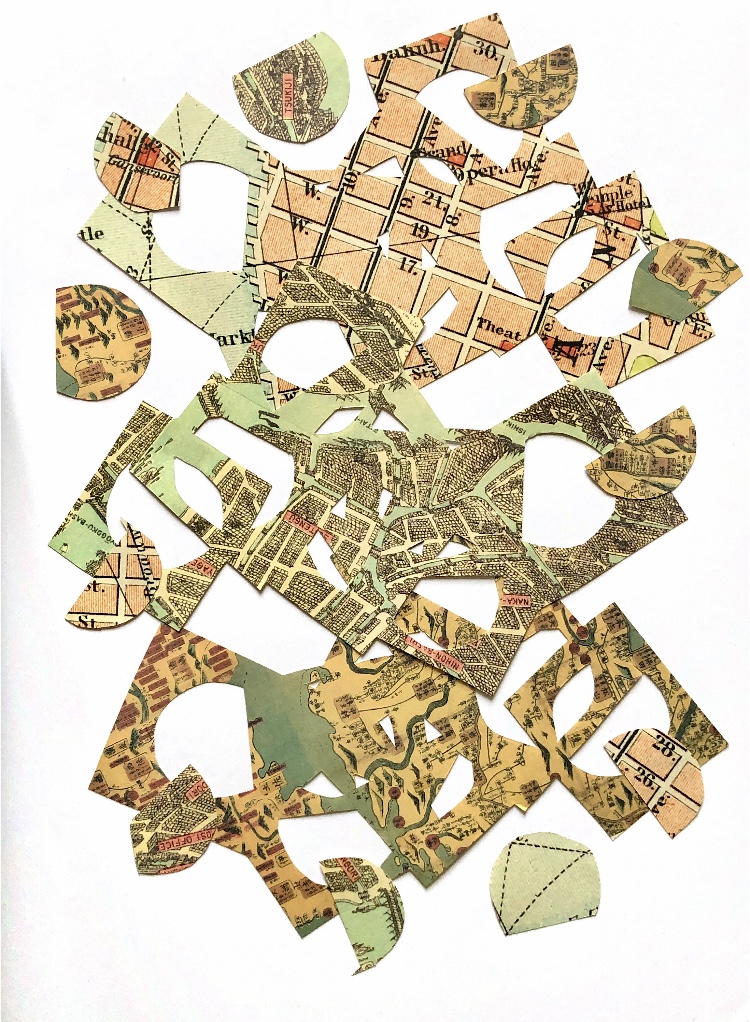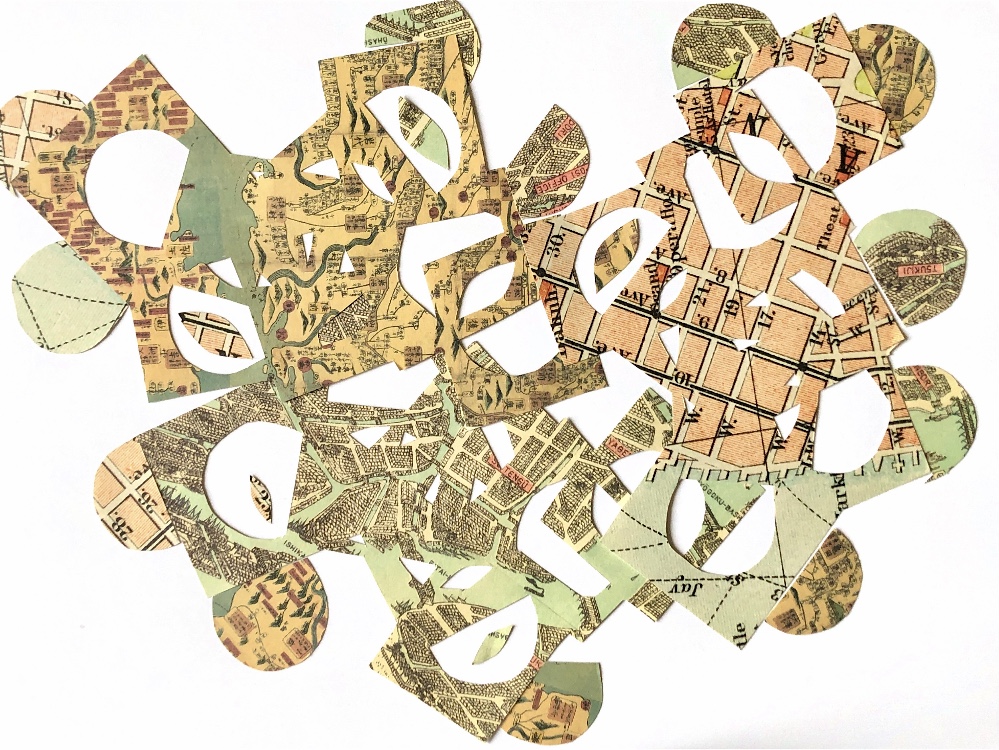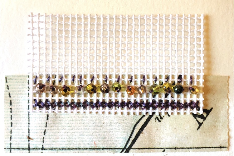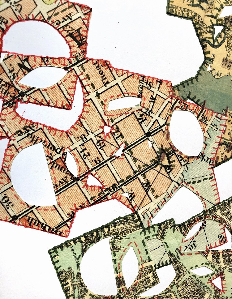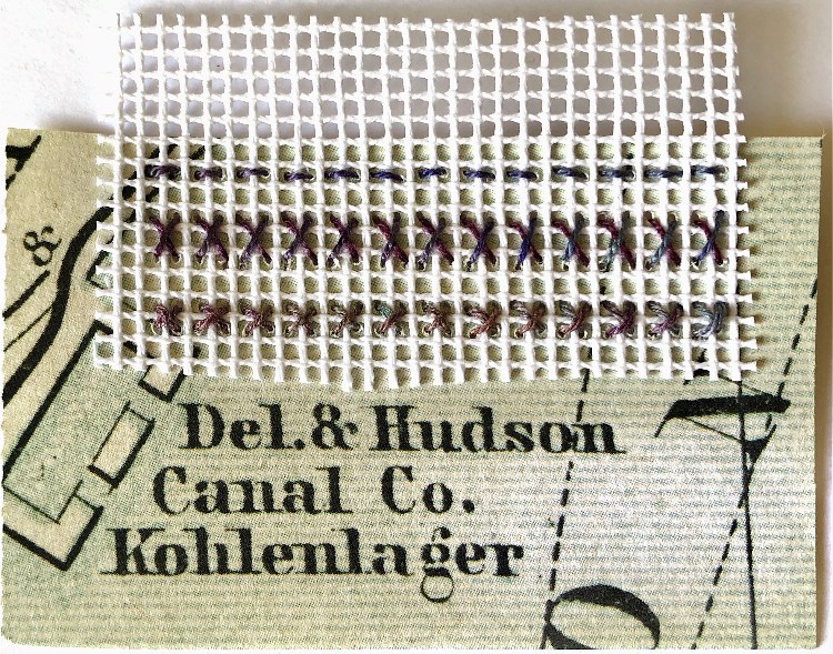 I overlapped cross stitch canvas onto a piece of map paper and used cross stitch, running stitch and beads to hold the materials together. I like the even, ordered stitching contrasting with the writing and map drawings on the paper. The idea of completely contrasting materials and patterns intrigues me.