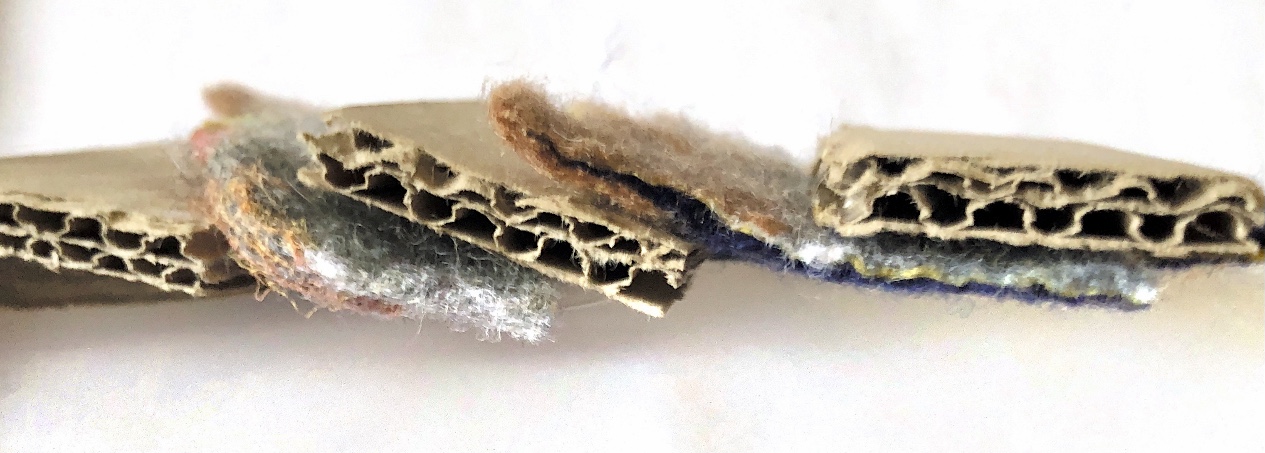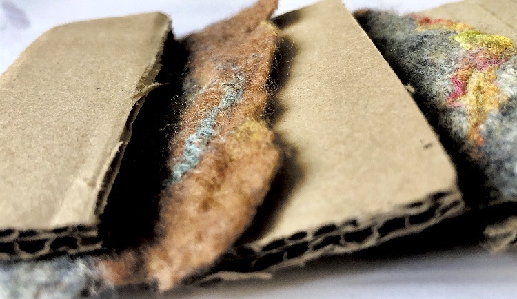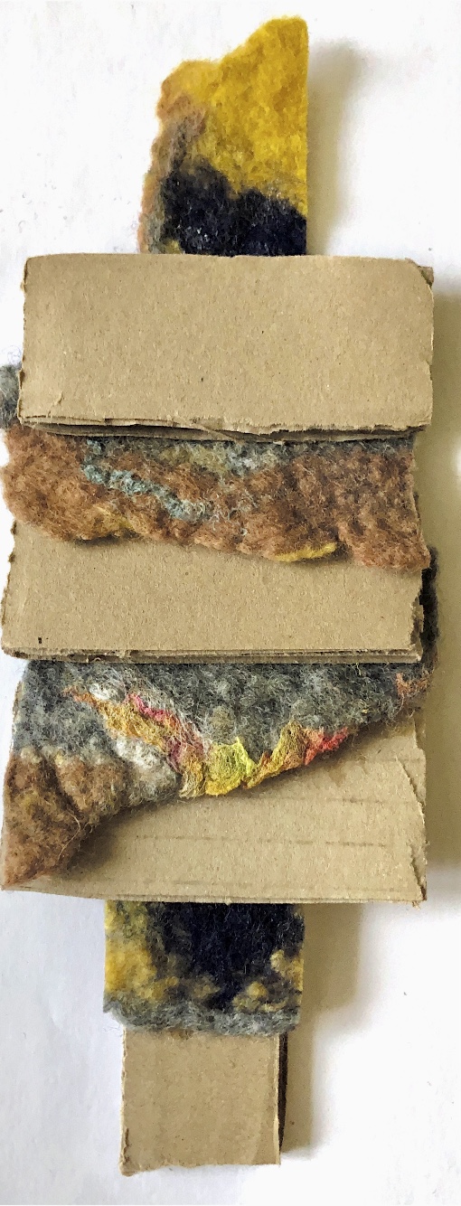 Corrugated card and a cut up piece of hand made felt were glued together and photographed from different angles. The soft, uneven edges of the felt sit in with the smooth, hard card to create a tactile sample.