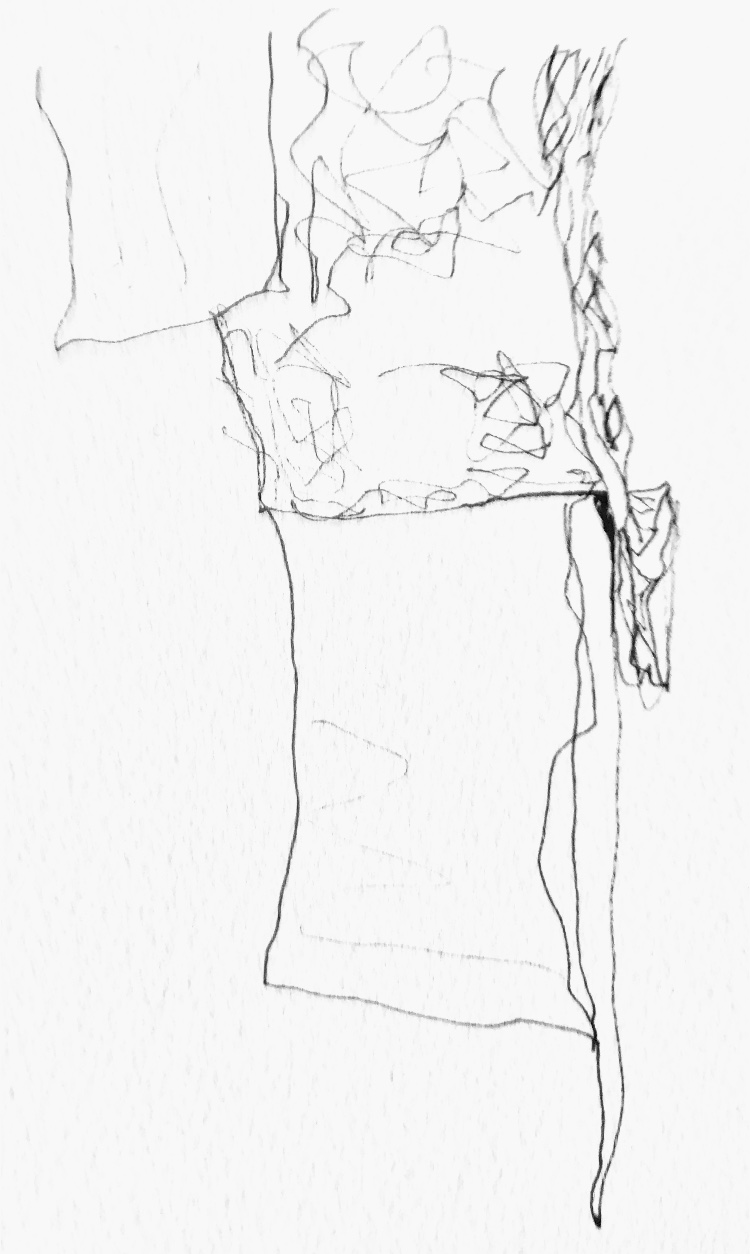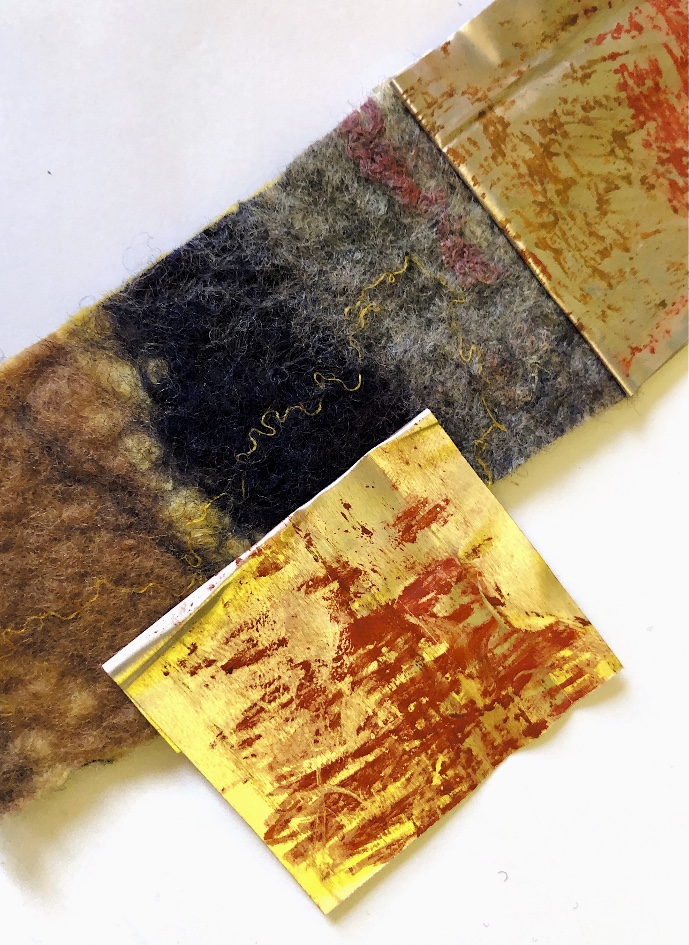 Handmade felt and thin metal sheet are very different materials, – the sheet could be folded to enclose the felt without another joining method. Photographed from the edge of the sample makes an interesting line pattern. What was difficult was translating the textures into the drawing.