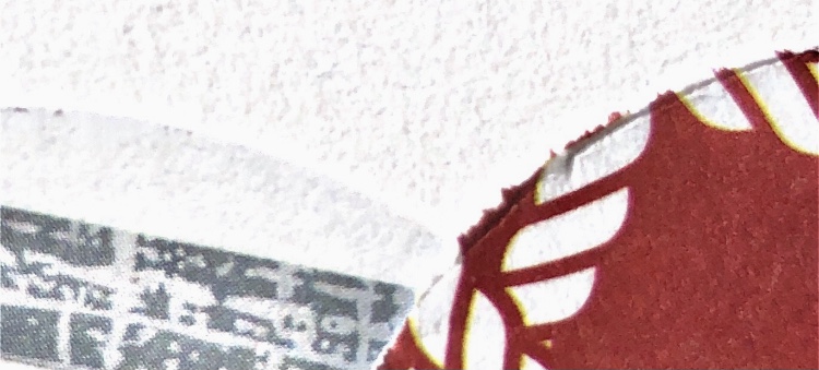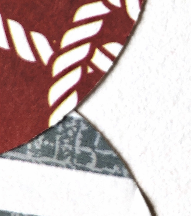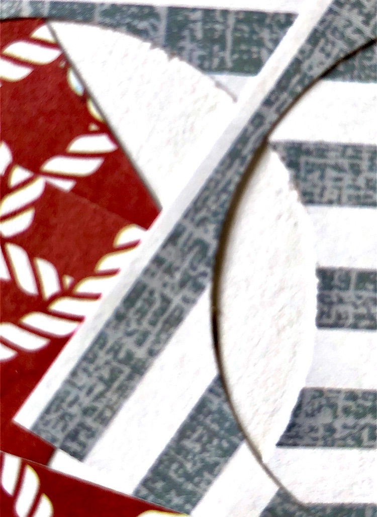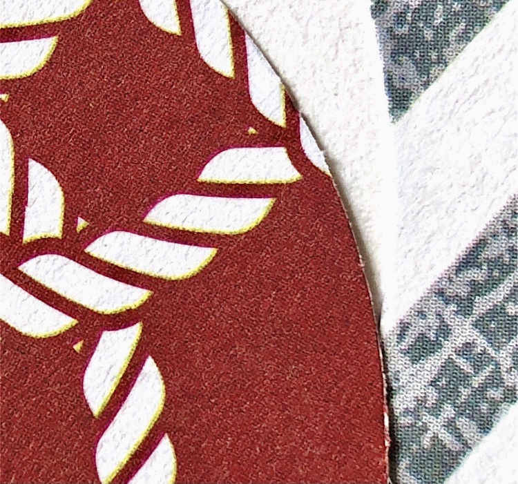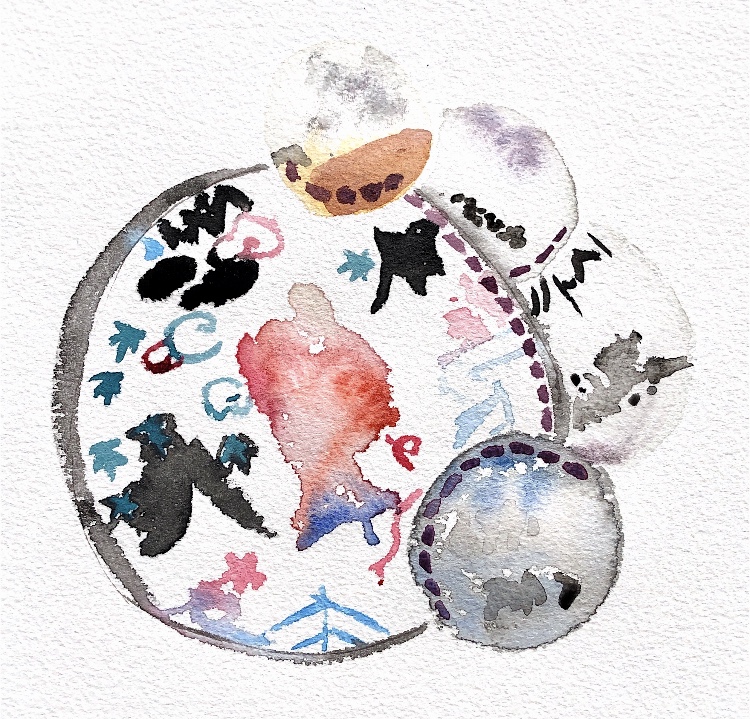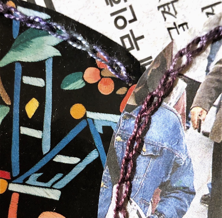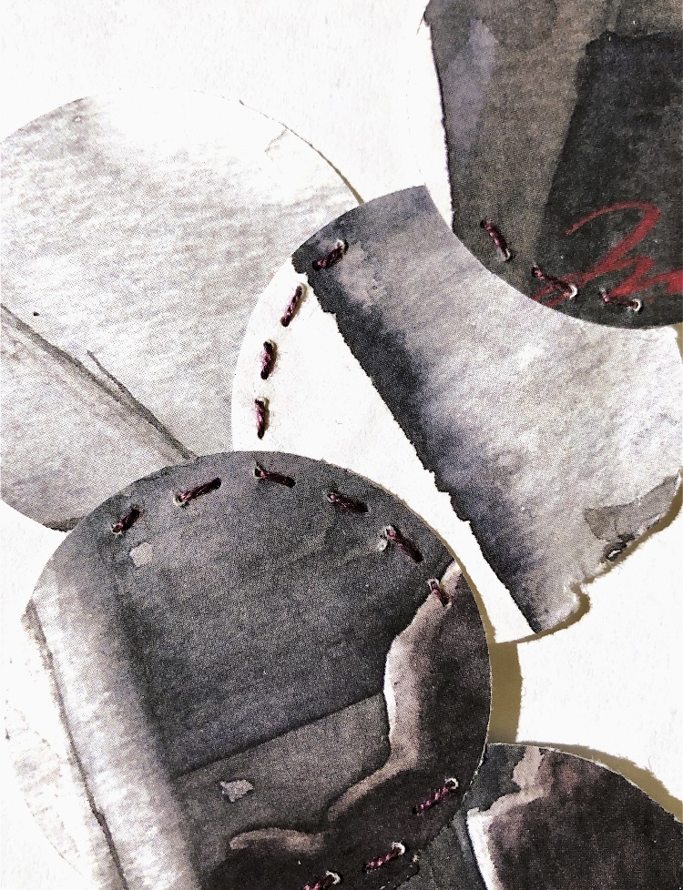 Joining curved edges – I chose to use a Japanese themed wrapping paper and newspaper. I always buy a newspaper when I visit another country and try to use bits in my work. Here the text contrasts nicely with the decorative wrapping paper and the chain stitch join adds another element. I think I have captured the feel of this sample in my watercolour even though I chose to leave out much of the black background. The different sized circles work well for the composition.