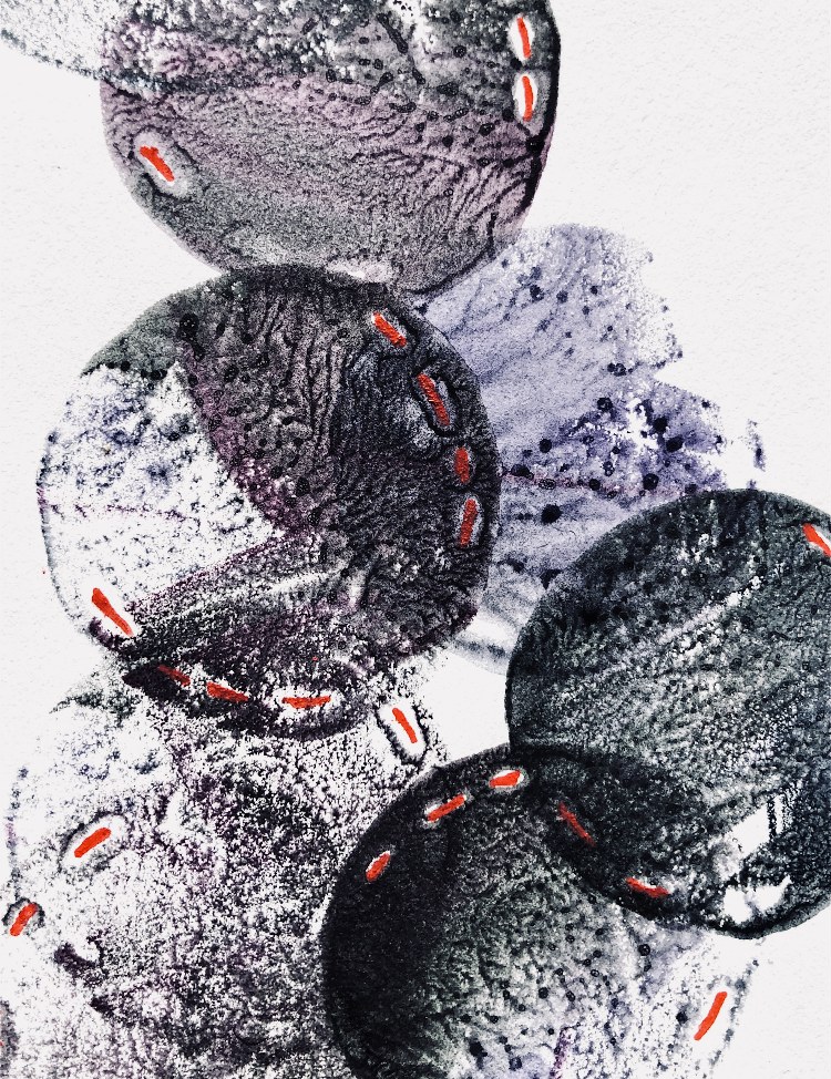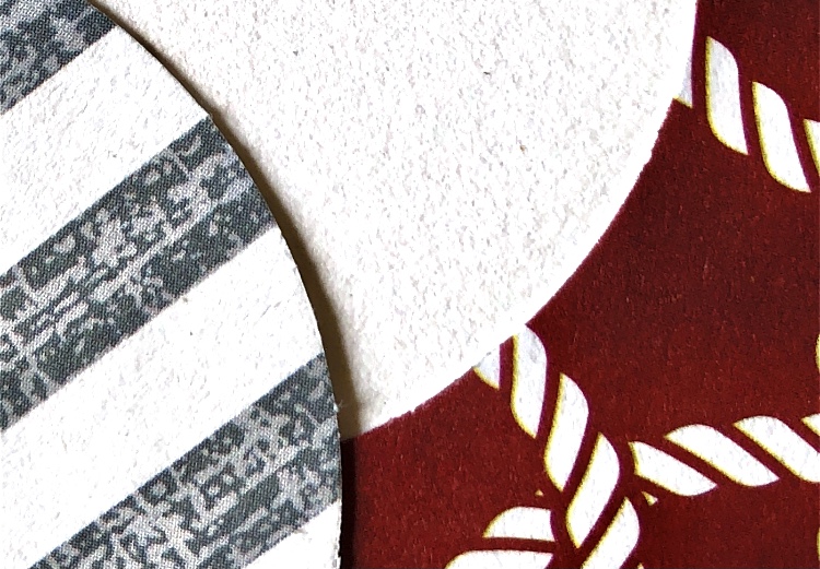 Overlapping circles of one size can be used to create an endless series of patterns. I made just one print block to experiment with designs and also painted a watercolour version to help inspire the printing. Adding a little red pen for the stitching on the prints added interest.