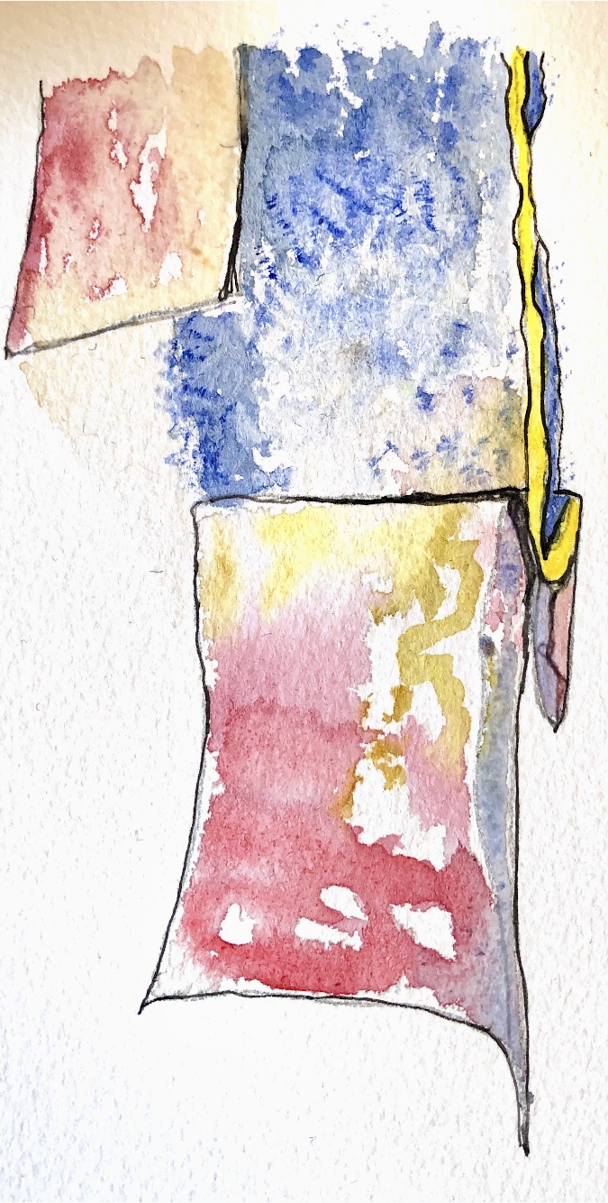 Exploring translucency with stitch and newspaper – this sample is a bit messy but I think it has possibilities for further exploration. It was a challenge to capture the qualities of this sample in watercolour but I think I have achieved a fairly good representation.