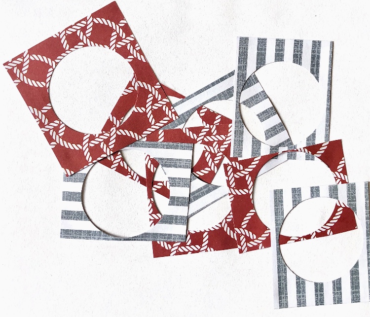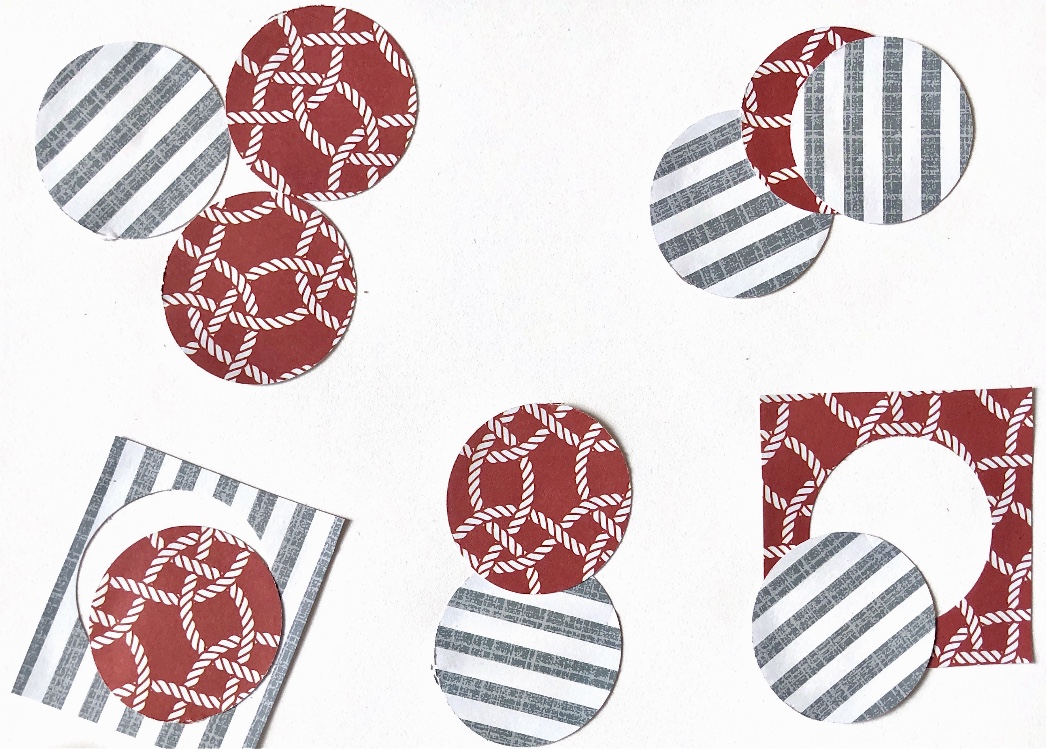 Using a tracing of one of the collages as a starting point, I cut out a series of shapes from different papers and created more samples. I concentrated on creating pleasing compositions with the shapes and colours. I think a bigger colour contrast might be useful to consider in future samples like these – maybe a dark colour as a background or an accent colour. However maybe this could be added with stitch?
