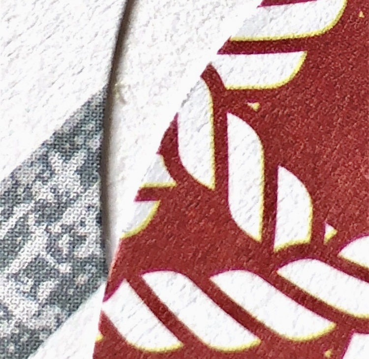 Printing with small varied blocks to make a pattern in different colourways. This pattern is very angular.