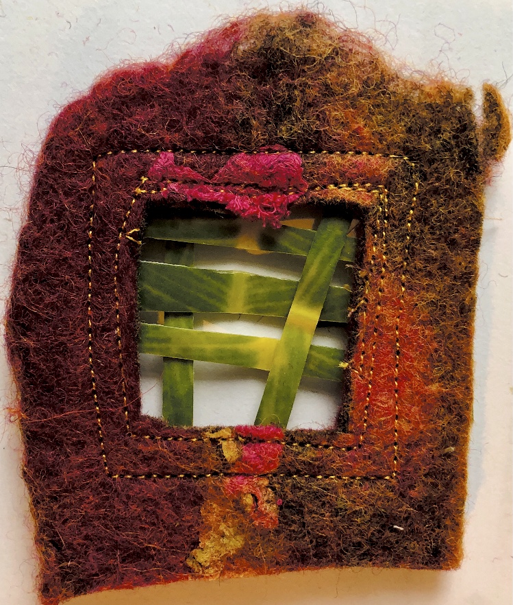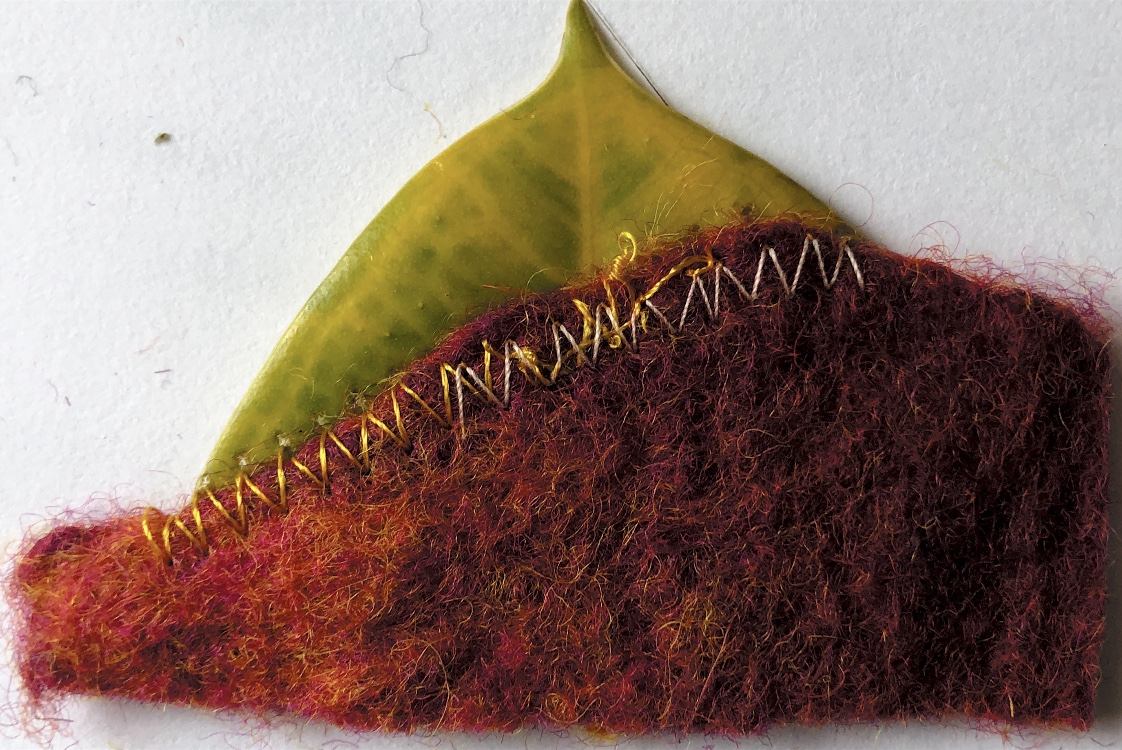 I have discovered working through these exercises, that almost every join makes some sort of angle. In the following samples I have stitched leaf strips to hand made felt. The fact that both are natural fibres pleases me and also the total difference in strength, texture, colour and permanence. Machine stitching on leaves is not easy and causes the leaf to become very fragile, but as the leaf will break down quickly and the samples will not last, this did not really matter too much.