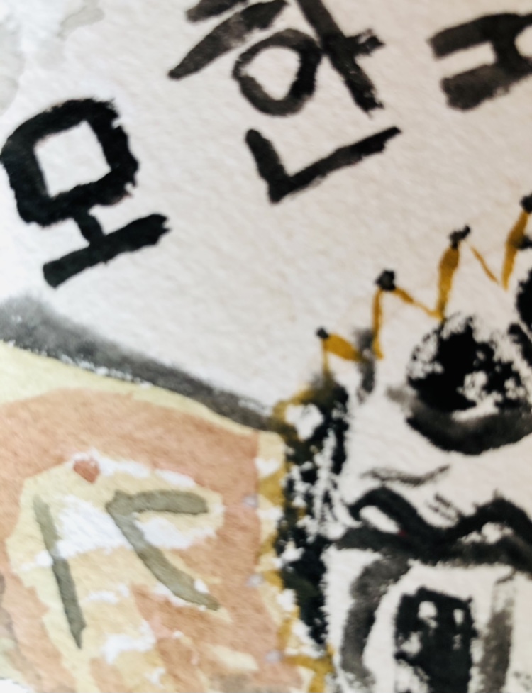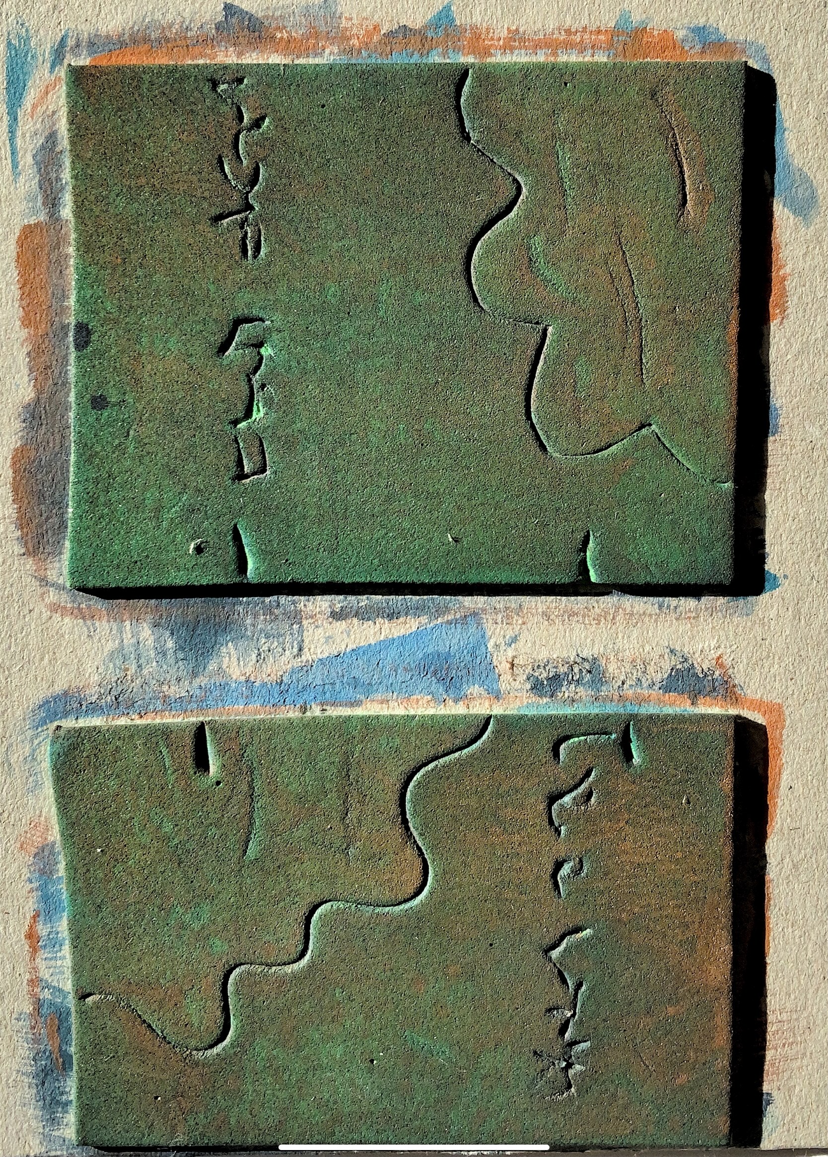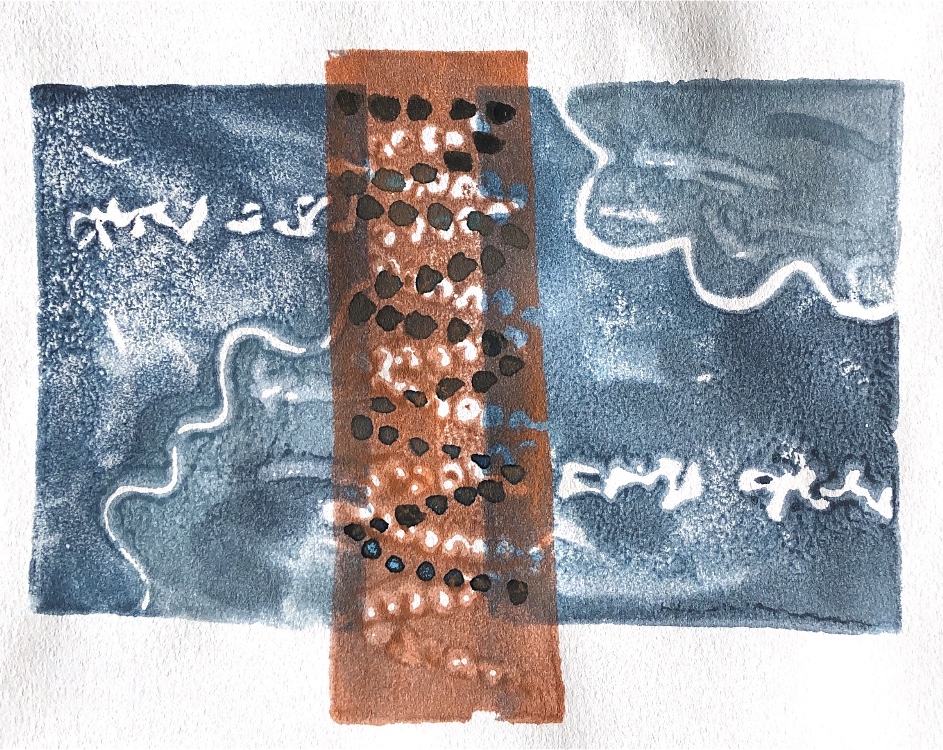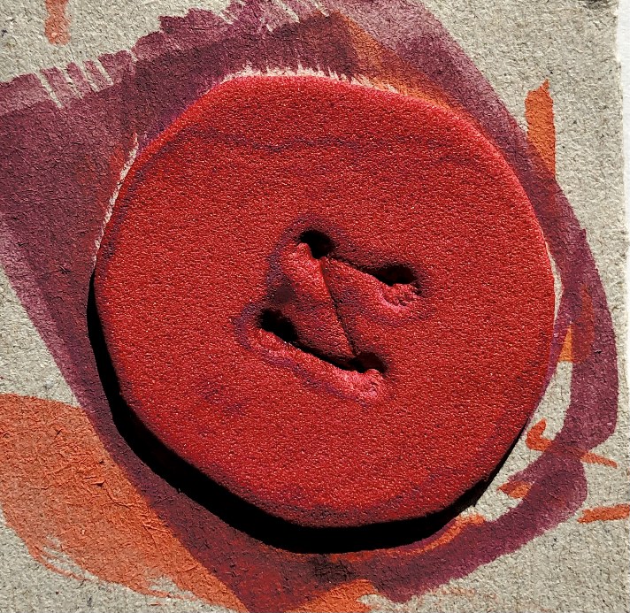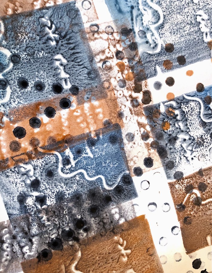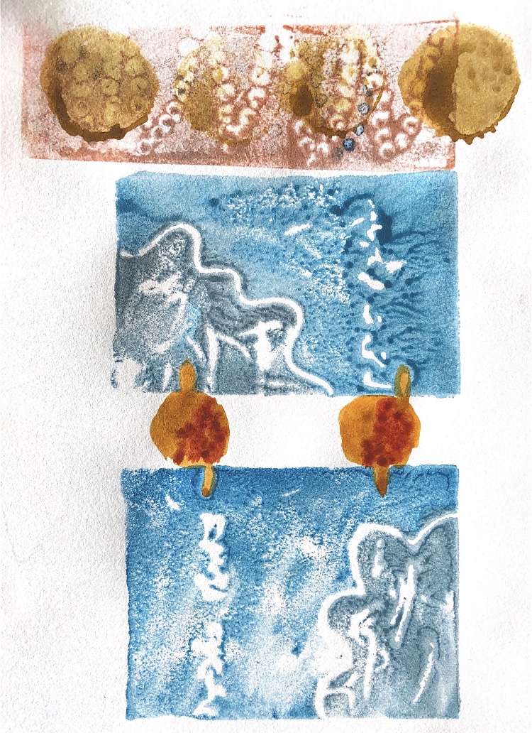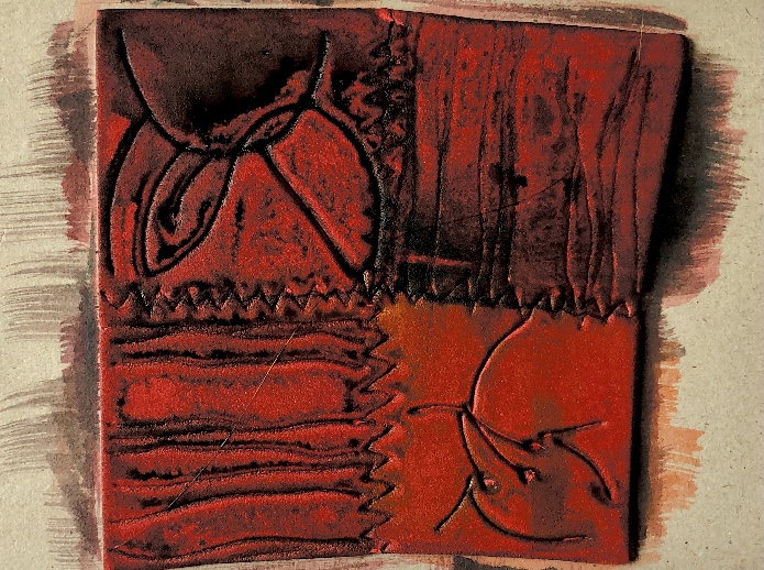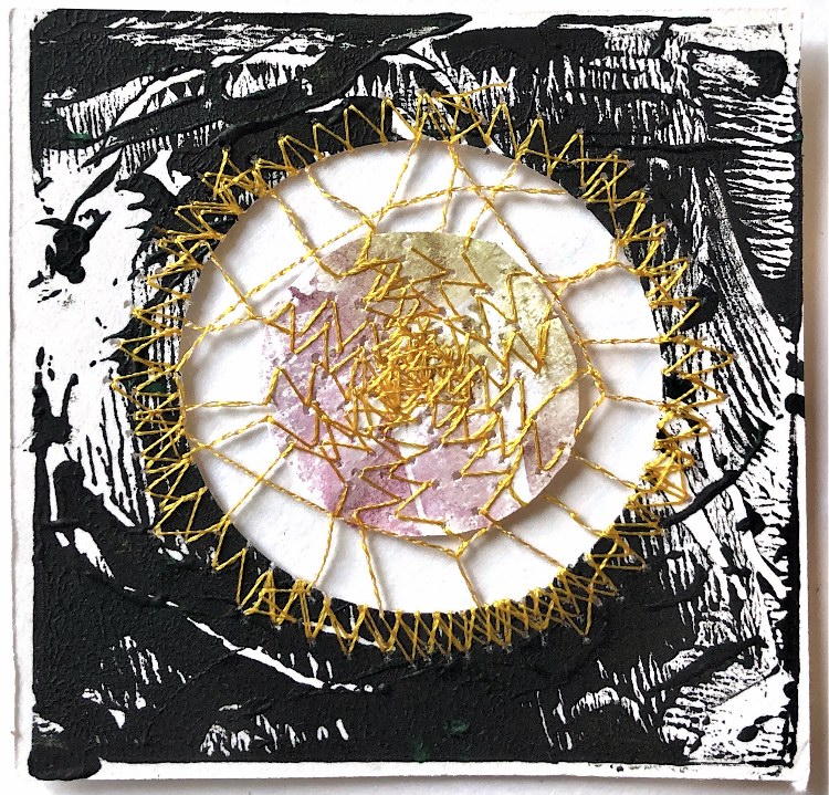 Stitching into plastic was a complete contrast as I needed to consider the reverse side which shows through the transparent plastic sheet. A left handed painting captured the exuberance of this piece but I am not sure the print block has the same impact.