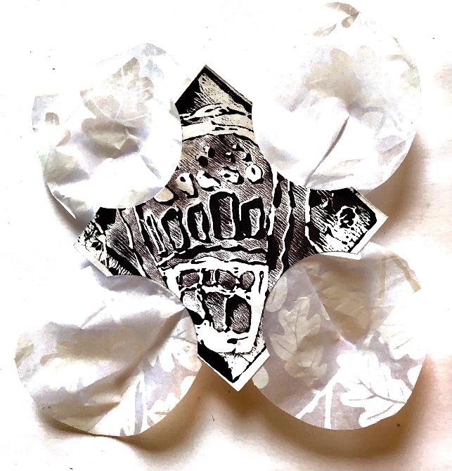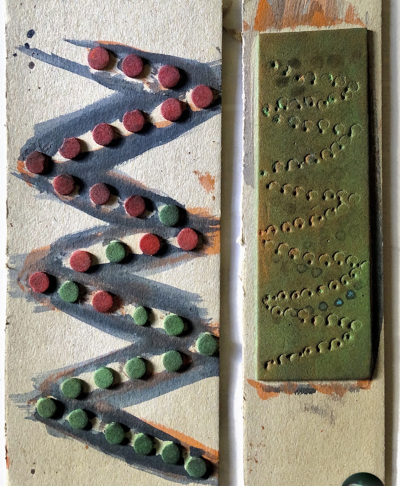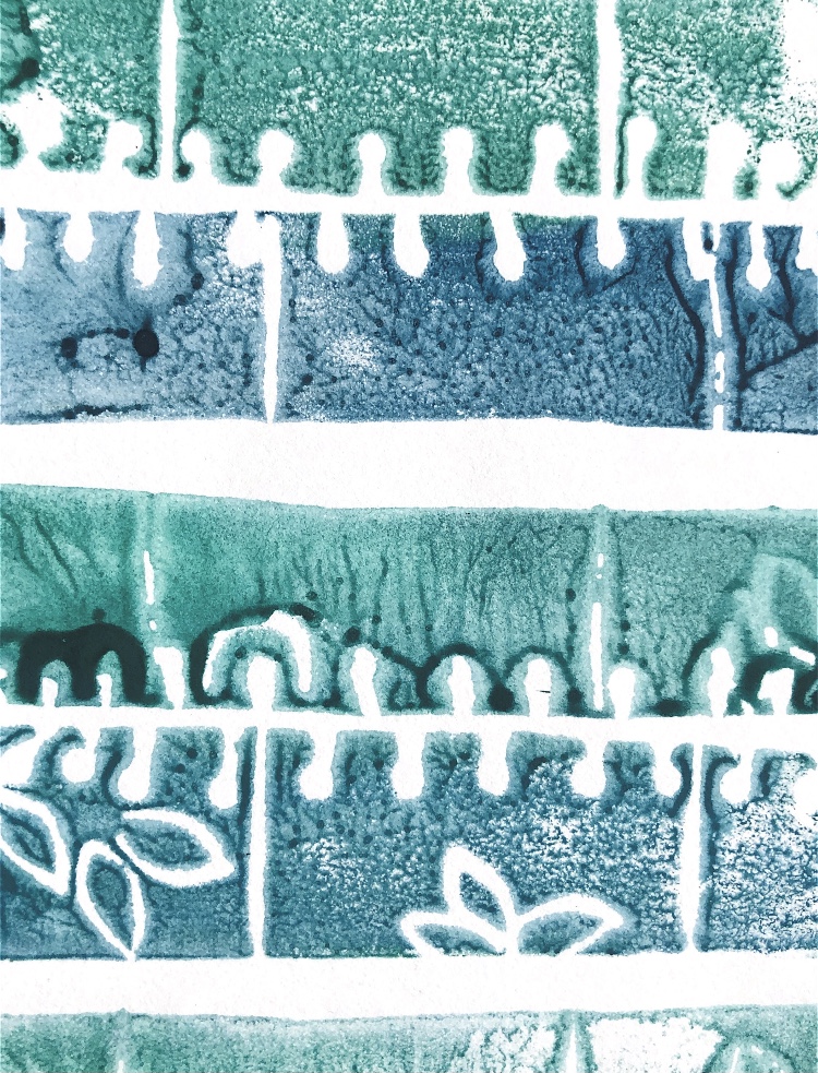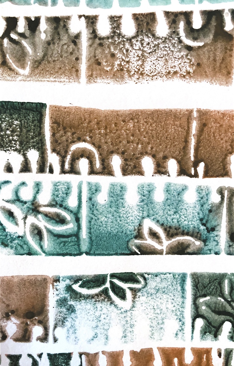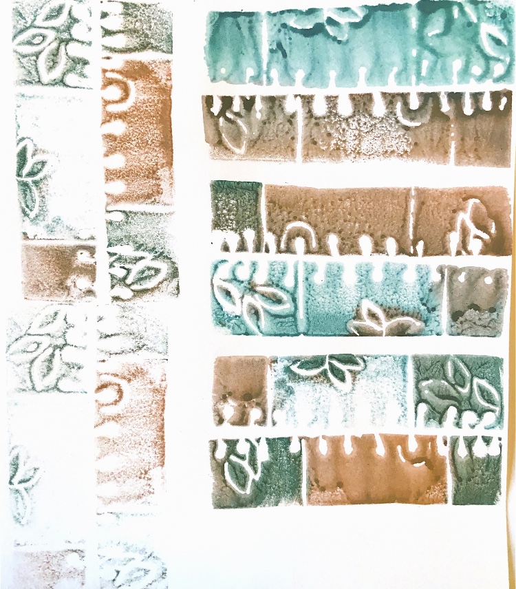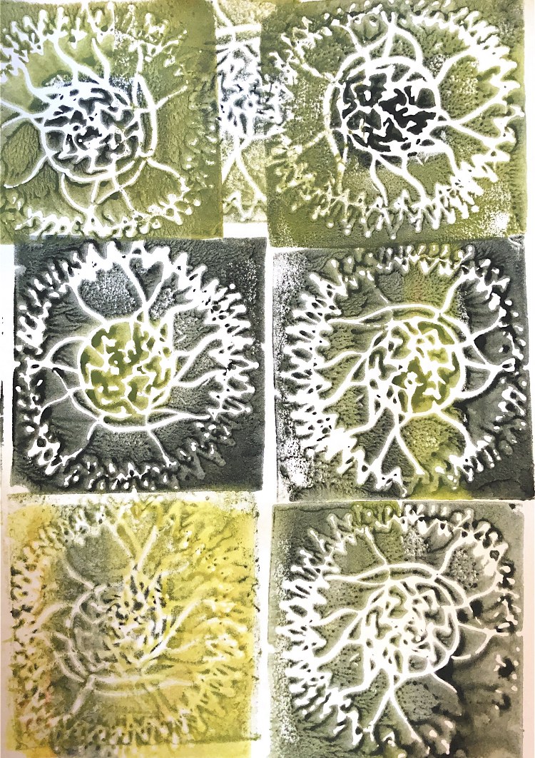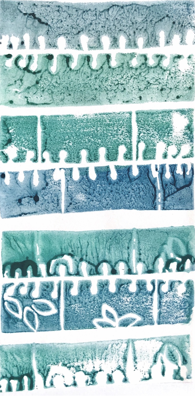 I was very excited by the range of shapes created when puncturing a leaf from one of my houseplants. Clear round holes were made with a hole punch while ragged tears were made by a needle – some of which look like barbed wire. The patterns looked great when manipulated on the computer, and created fabulous print blocks as seen below. With a few simple print blocks the overlaid patterns are exciting and appealing even when printed with a couple of drab colours.