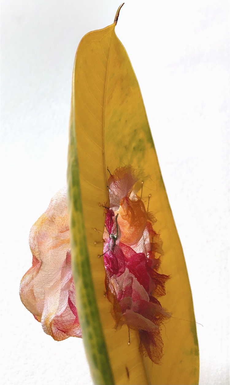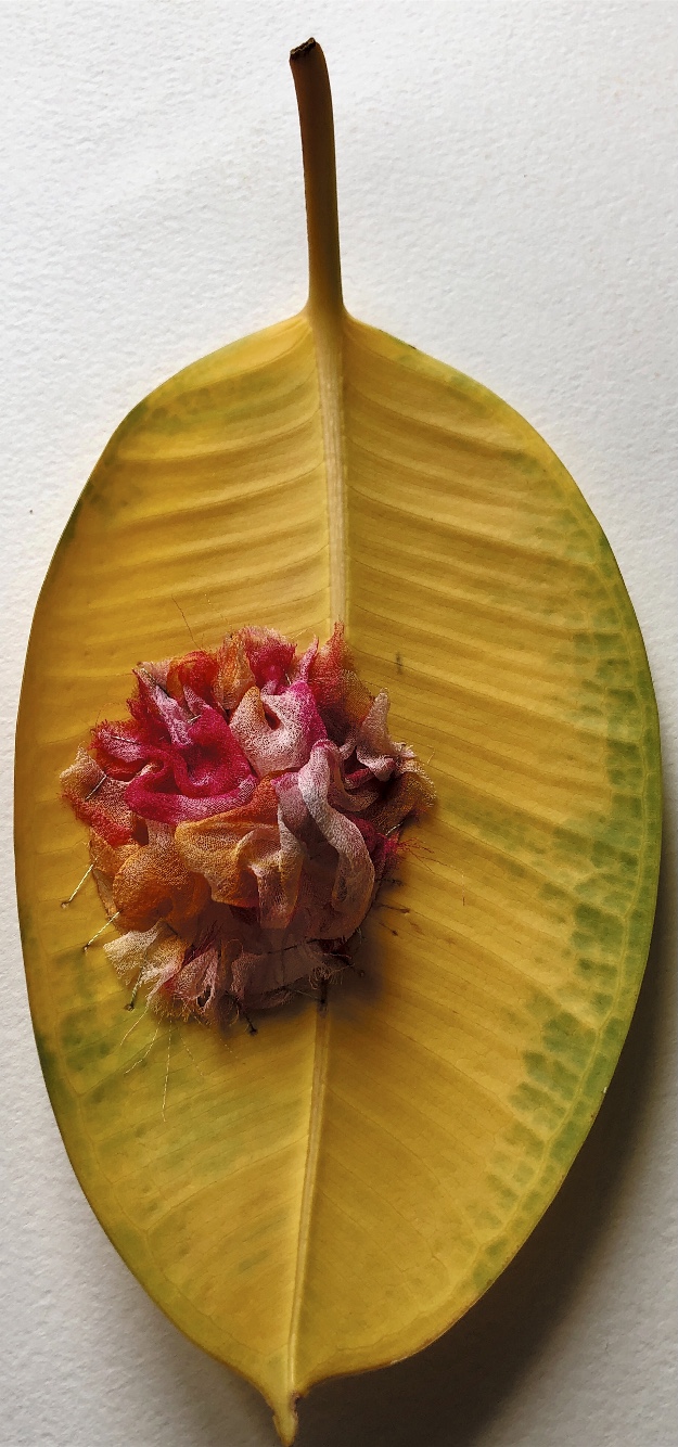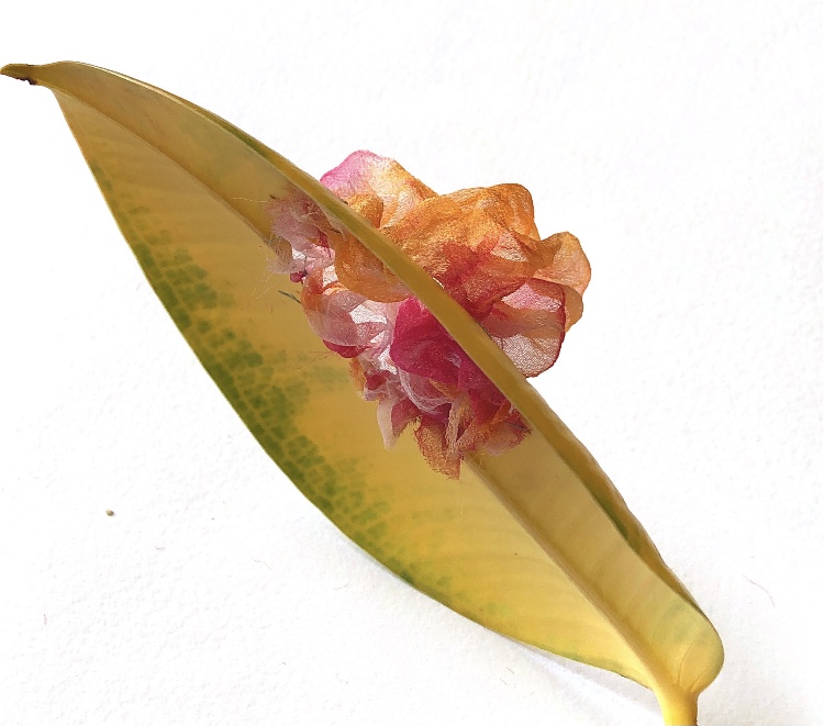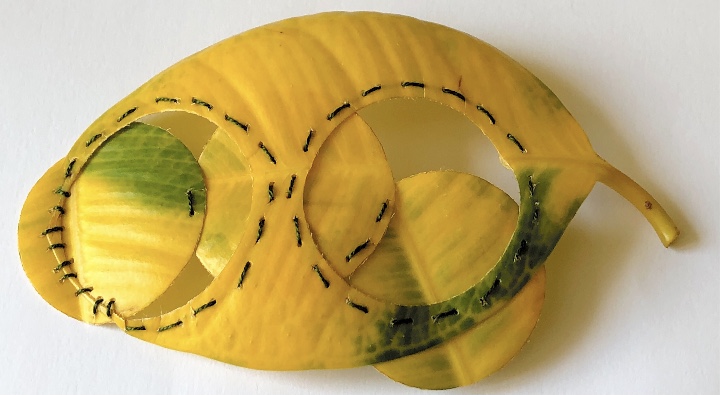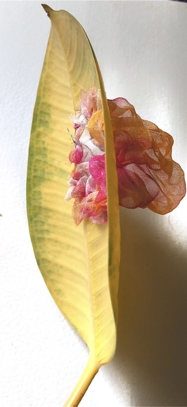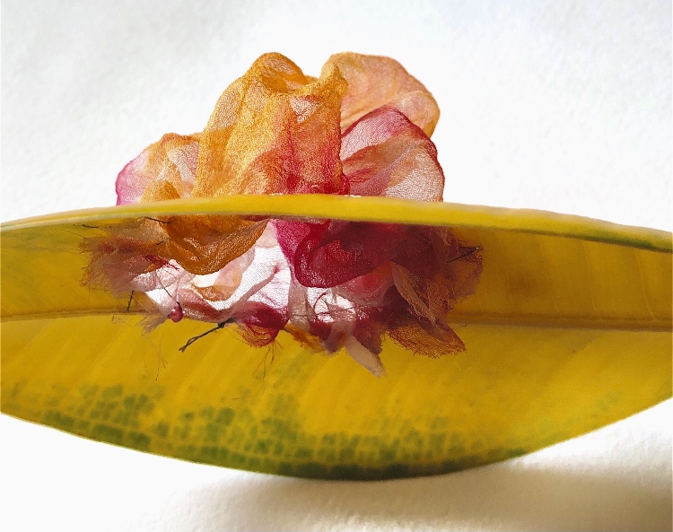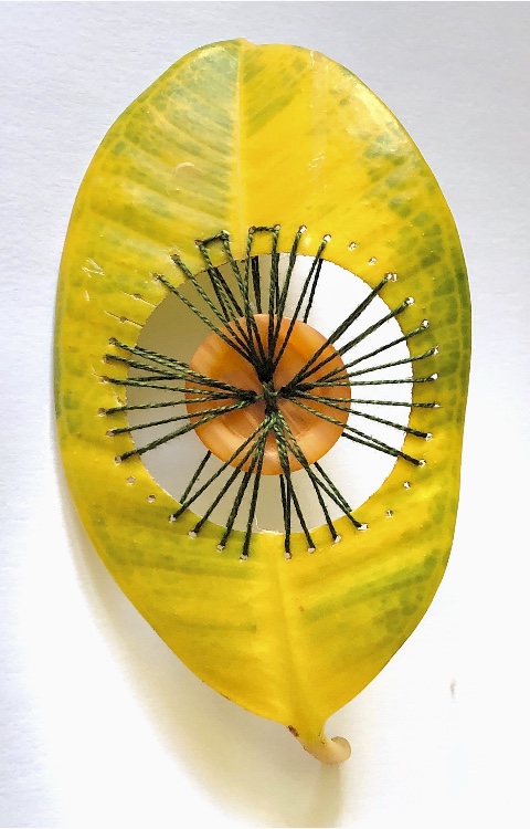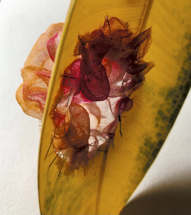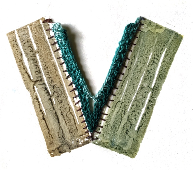 Fusing scrunched up coloured pieces of plastic was very exciting – I incorporated bits of muslin and sari silk for a different texture, and the resulting samples remind me of jewelled brooches. They were fun to paint with watercolours, and this gave me the idea to make more and stitch into them. Hand stitching through the layers was not difficult, I tried different stitches on each sample. I am sure that this technique could be explored further with different coloured plastic and much more stitching to really intensify the embellishment to make beautiful, decorative, wearable art.