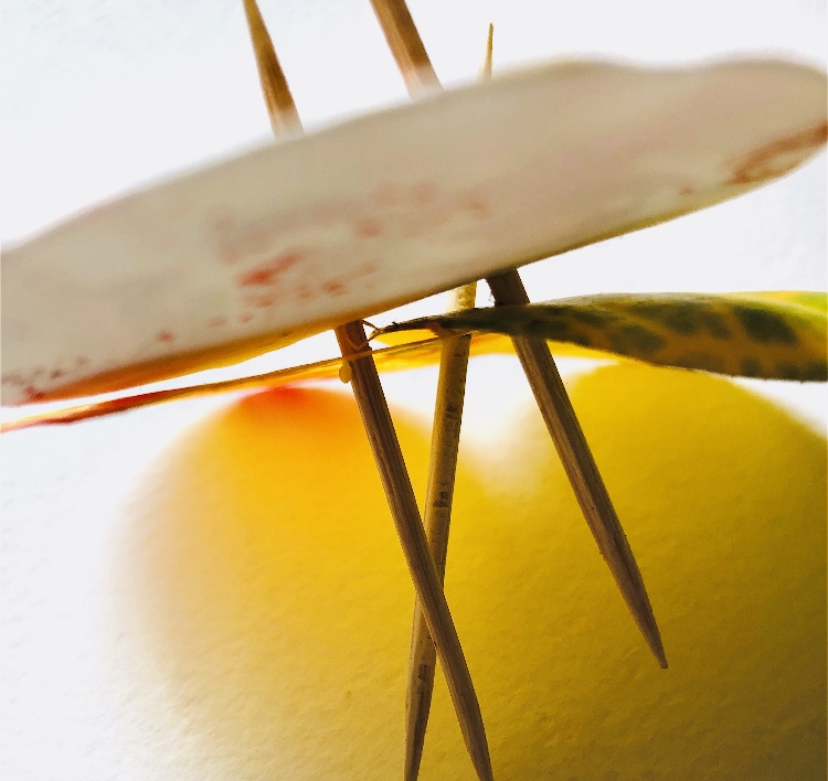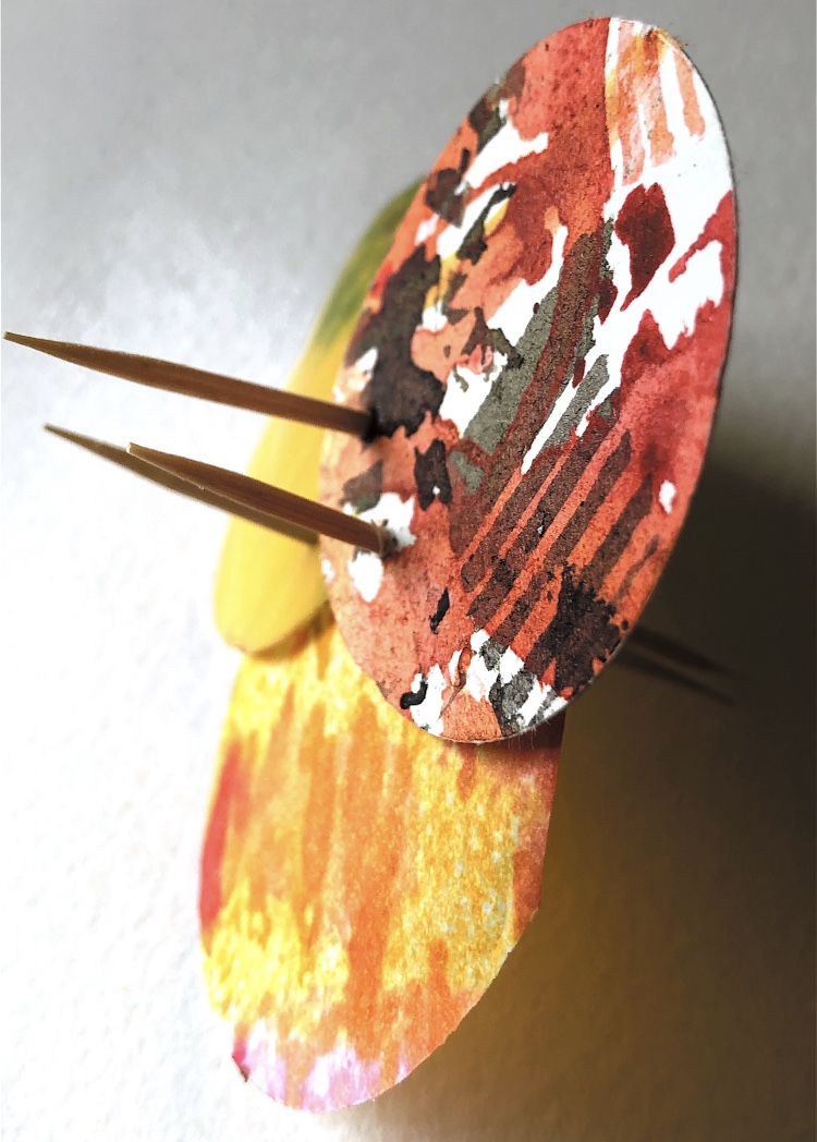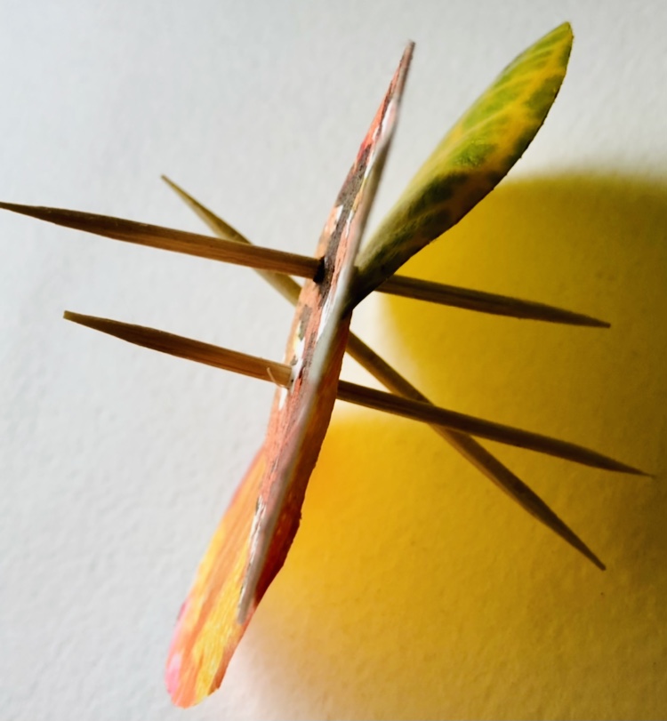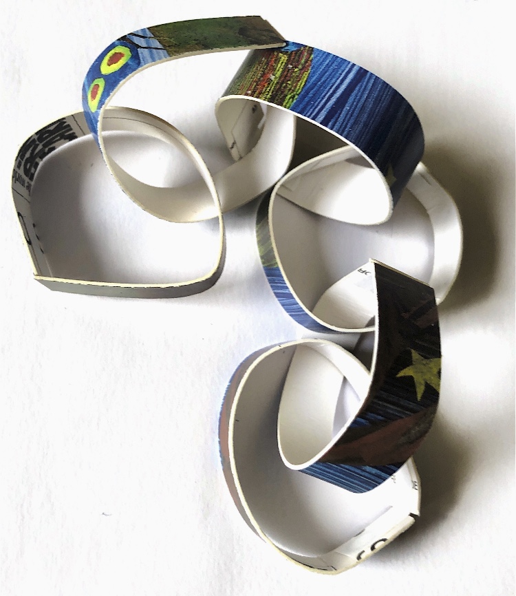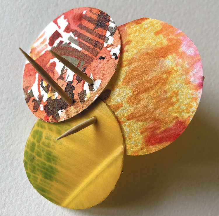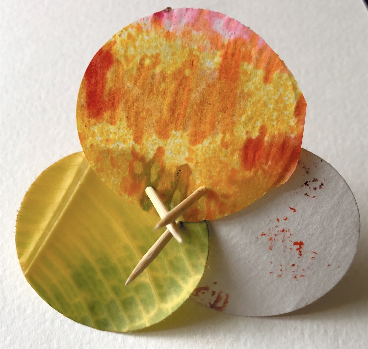 Finally I have chosen a 3d piece folded and secured with cocktail sticks with stitching along the folds, as it nicely uses a number of techniques and makes use of a bold printed paper for added interest. I like the way this looks so different when viewed from another angle.