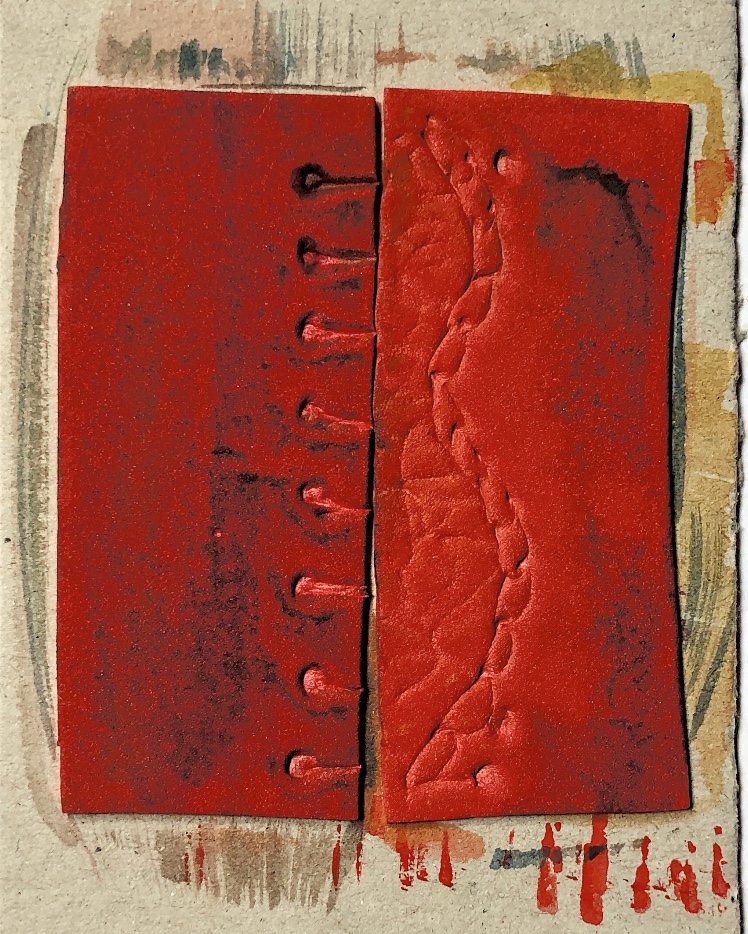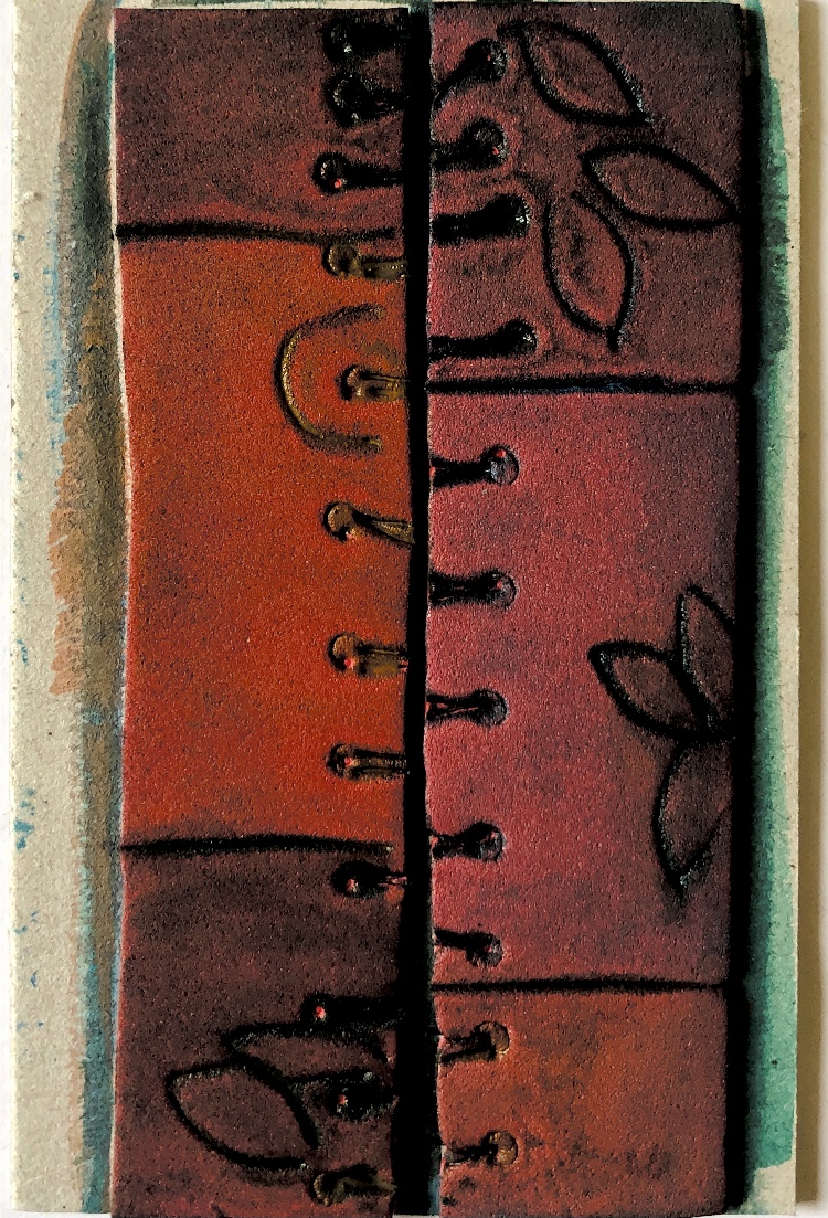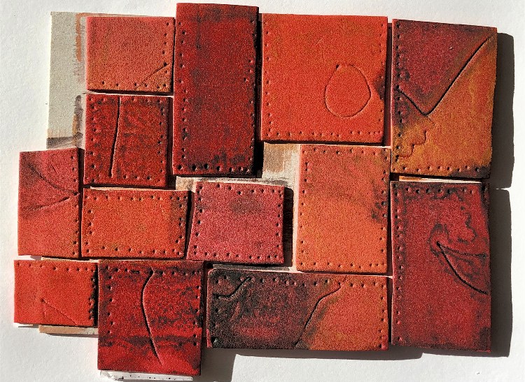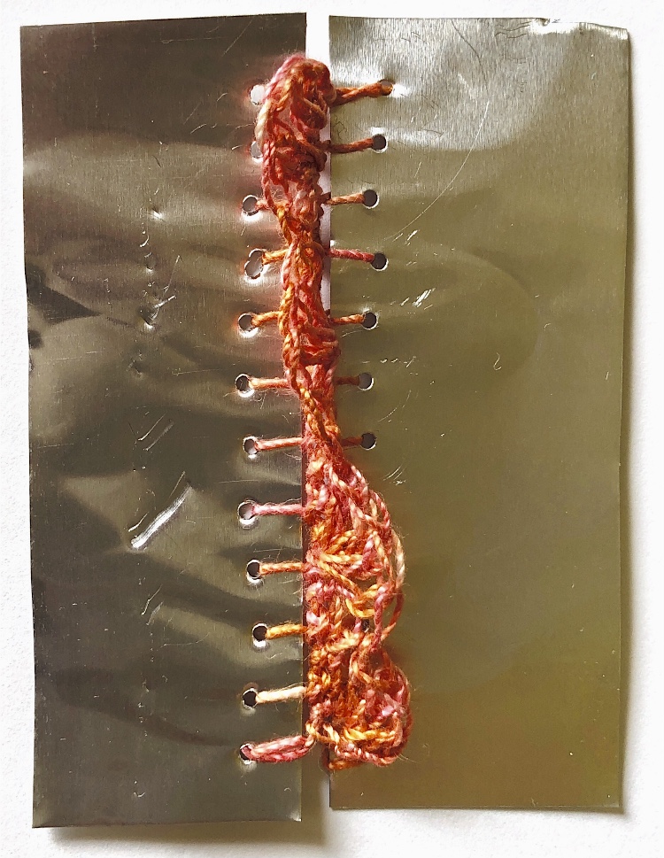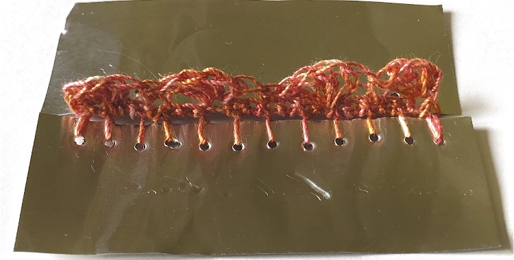 Exercise 2 Stitching I chose to make my first sample from a different material and chose air drying clay. I punctured lots of holes before it dried with needles, a bradawl and the wrong end of a pencil, with patterns for stitch in mind. The puncturing process created an undulating surface which I then used to hold beads and to emphasise some stitches. Kantha stitching, blanket stitch and running stitch worked well together with a crochet edging. The dried clay was still fairly fragile but it was interesting to stitch on and the smooth surface shows off the stitches really well. The surface could be further distorted by pressing materials into the clay before it is dry to create a pattern.