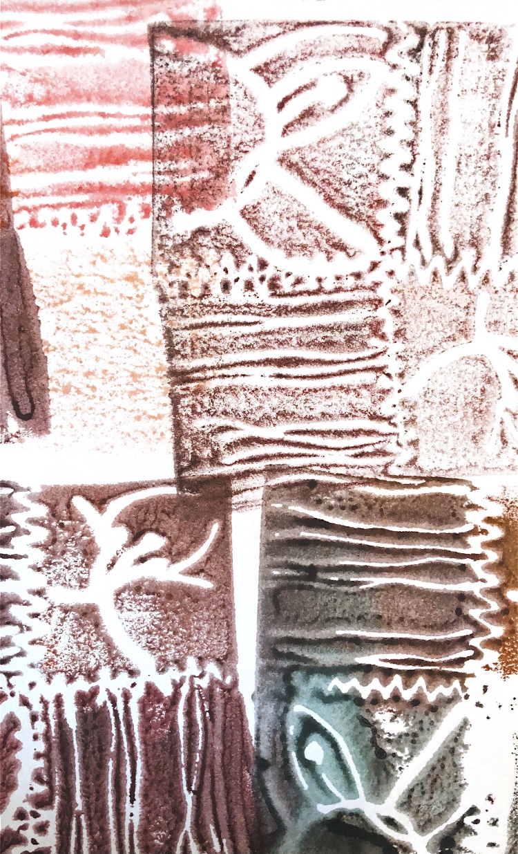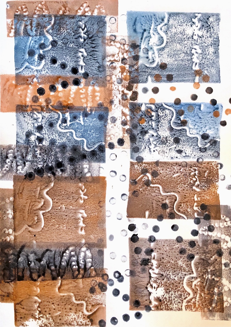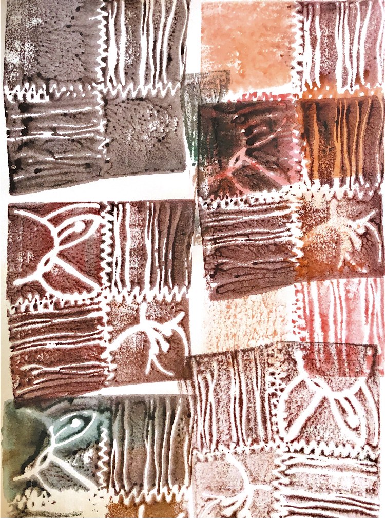 3. Project 3 Heating and fusing Exercise 1 Fusing plastic Again plastic was not something I really wanted to work with but I found this exercise really inspiring. Using just coloured plastic bags cut into strips and ironed, The samples were easily translated into print blocks. The printing using Inktense sticks echoed the textured wrinkles on the plastic created by the ironing process.