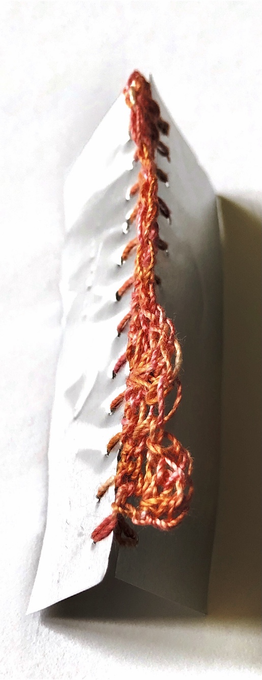 The experiment of stitching ribs on one of the samples worked well and the use of red thread on the monochrome paper emphasised the sharp folds. Because the stitching held the folded ribs in place, the paper could be further crumpled without destroying the sharp creases.