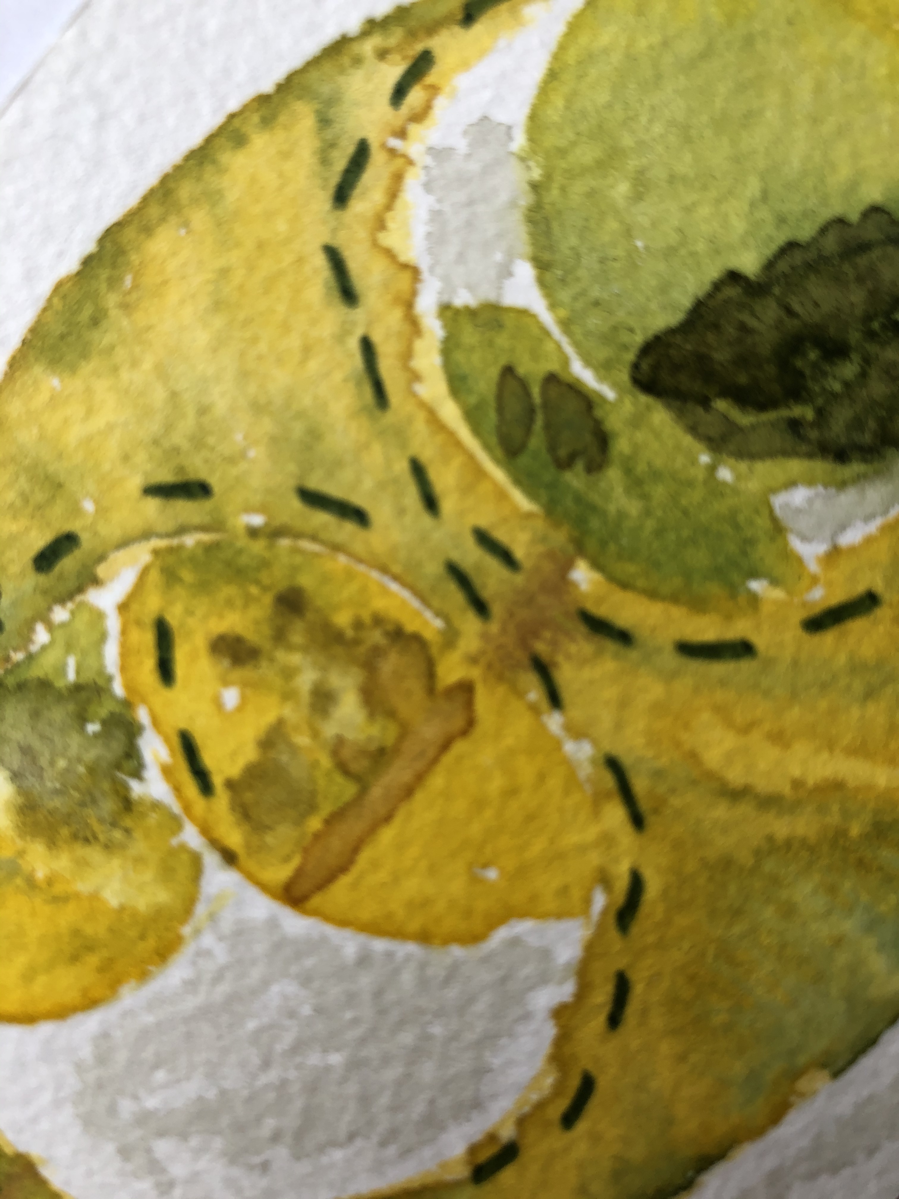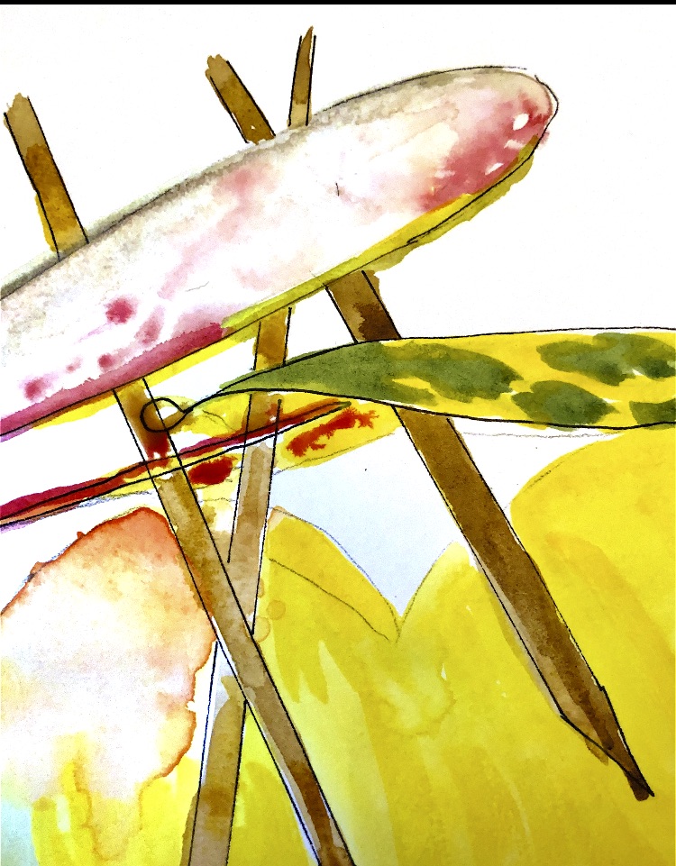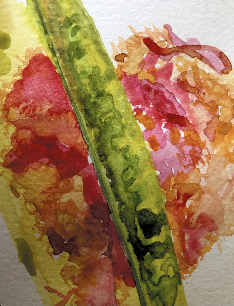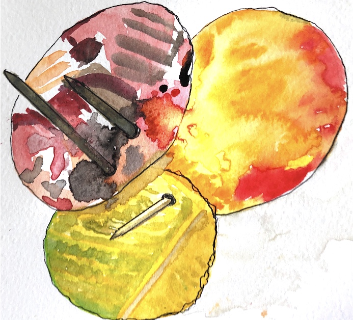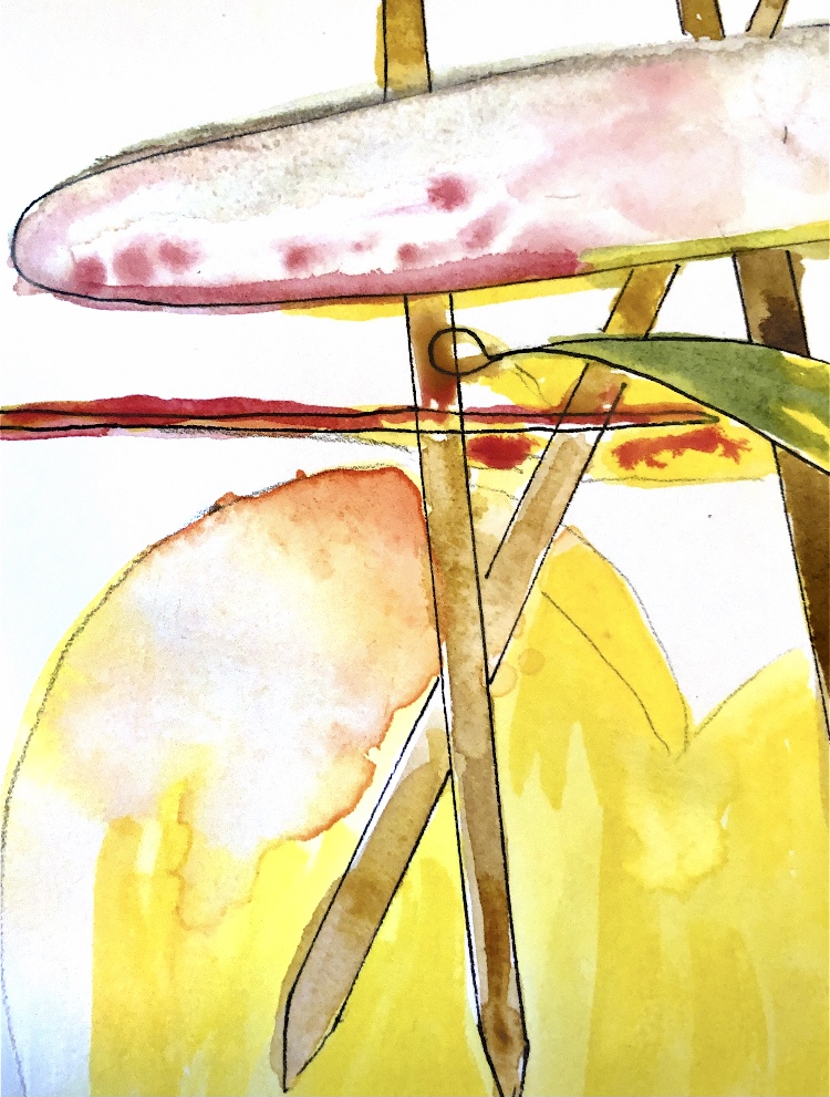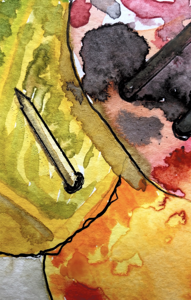 Exercise 3 Using hot water Using a meandering hand stitch pattern on polyester satin I gathered up the fabric and then boiled it for 30 minutes. The result was an intriguing scrunched up fabric that could be pulled open and would crease up again when let go. The dark shadows created by the folds are full of pattern and captured clearly in the ‘Waterlogue’ app manipulation shown below. It was not an easy thing to draw but observing closely produced a drawing full of movement.