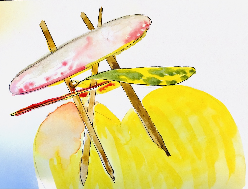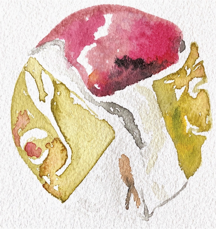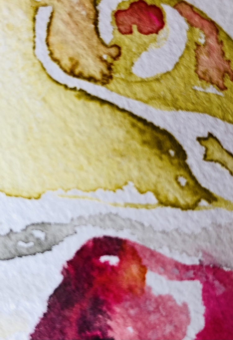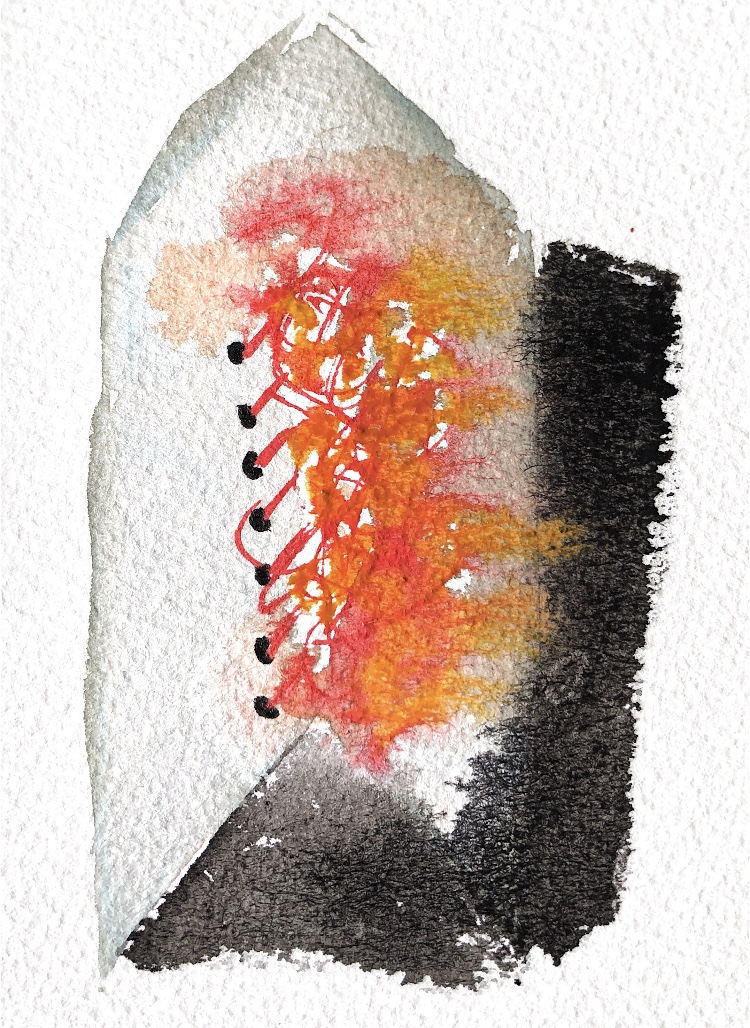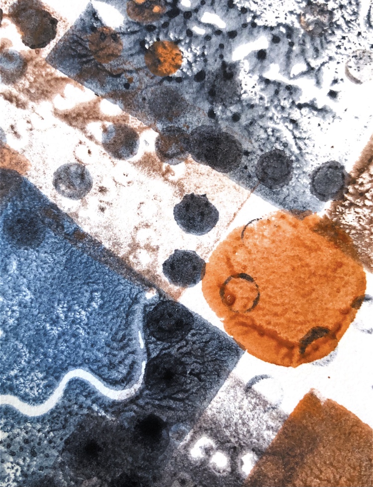 Exercise 3 Using hot water Using a meandering hand stitch pattern on polyester satin I gathered up the fabric and then boiled it for 30 minutes. The result was an intriguing scrunched up fabric that could be pulled open and would crease up again when let go. The dark shadows created by the folds are full of pattern and captured clearly in the ‘Waterlogue’ app manipulation shown below. It was not an easy thing to draw but observing closely produced a drawing full of movement.