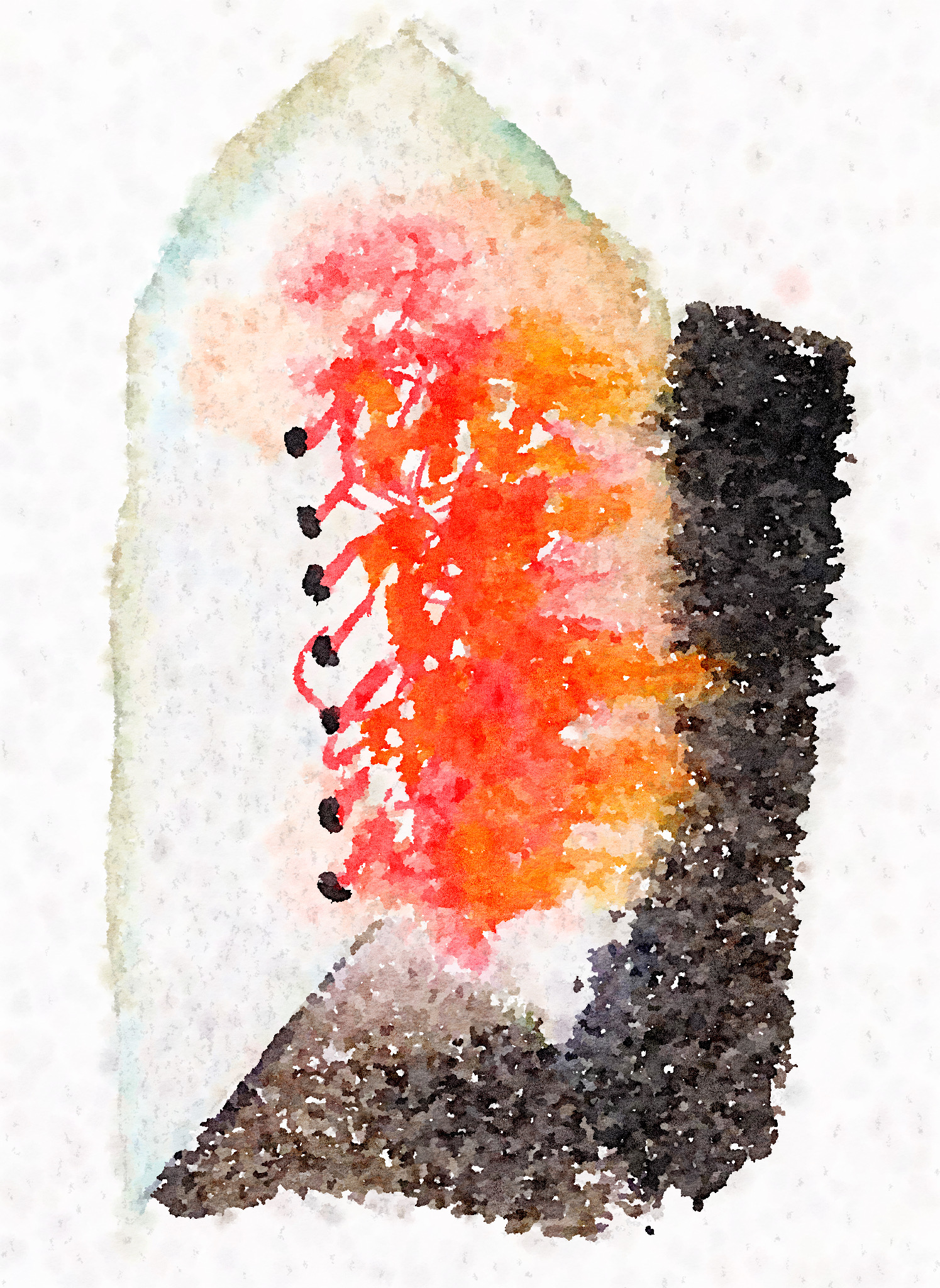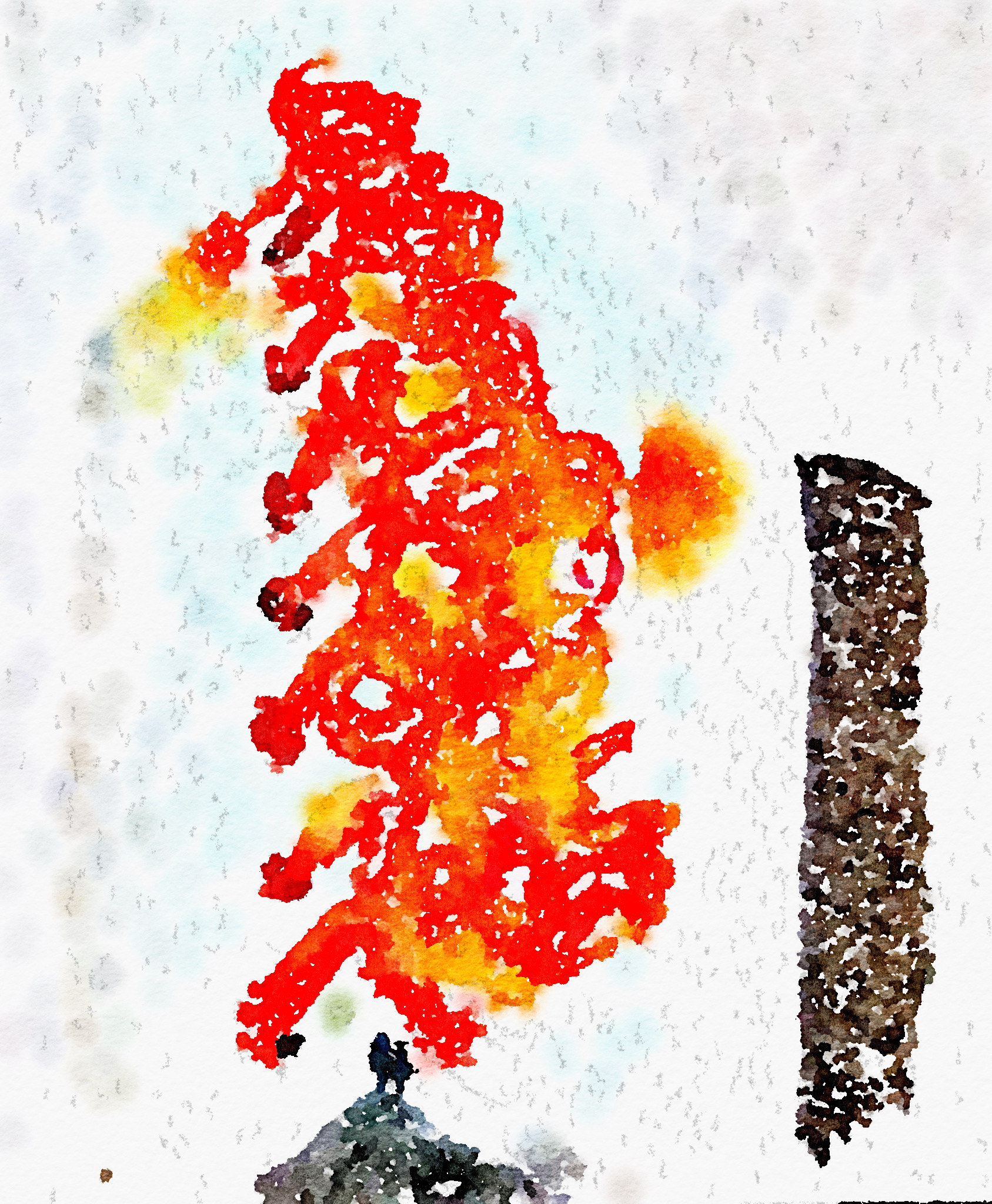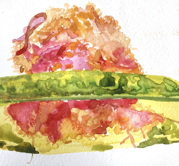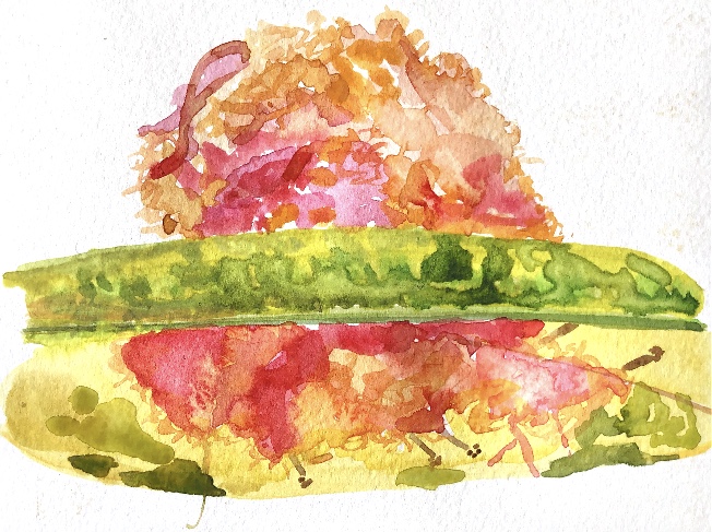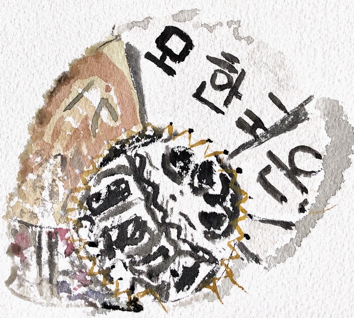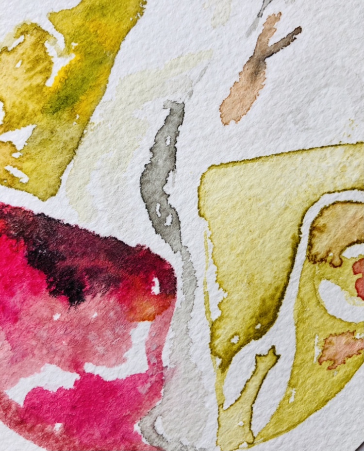 Exercise 3 Using hot water Using a meandering hand stitch pattern on polyester satin I gathered up the fabric and then boiled it for 30 minutes. The result was an intriguing scrunched up fabric that could be pulled open and would crease up again when let go. The dark shadows created by the folds are full of pattern and captured clearly in the ‘Waterlogue’ app manipulation shown below. It was not an easy thing to draw but observing closely produced a drawing full of movement.