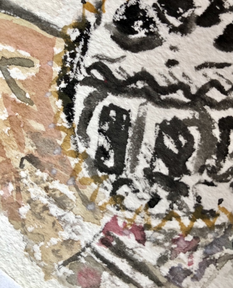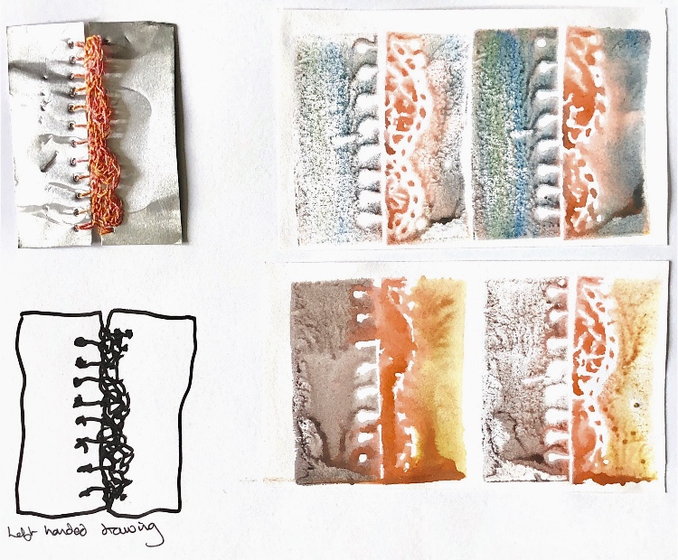 Exercise 2 Using a heat gun Having tried a variety of materials, the sample that excited me most to draw and work with was the black net. The large ragged holes made by the heat gun contrasted with the small neat holes in the net. This was very different to the other sample shown below which is heated satin. Having drawn and painted the sample using made tools and using salt on watercolour, I chose to stitch on one piece of watercolour paper. I love stitching on paper – the feel of the needle pushing through the paper is very satisfying and the stitch is firmly held in place by the paper to make a prominent mark whatever the thickness of thread.