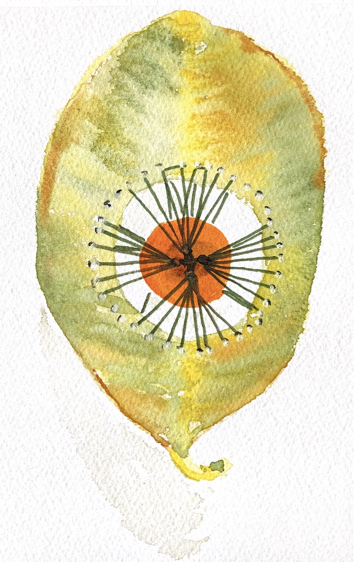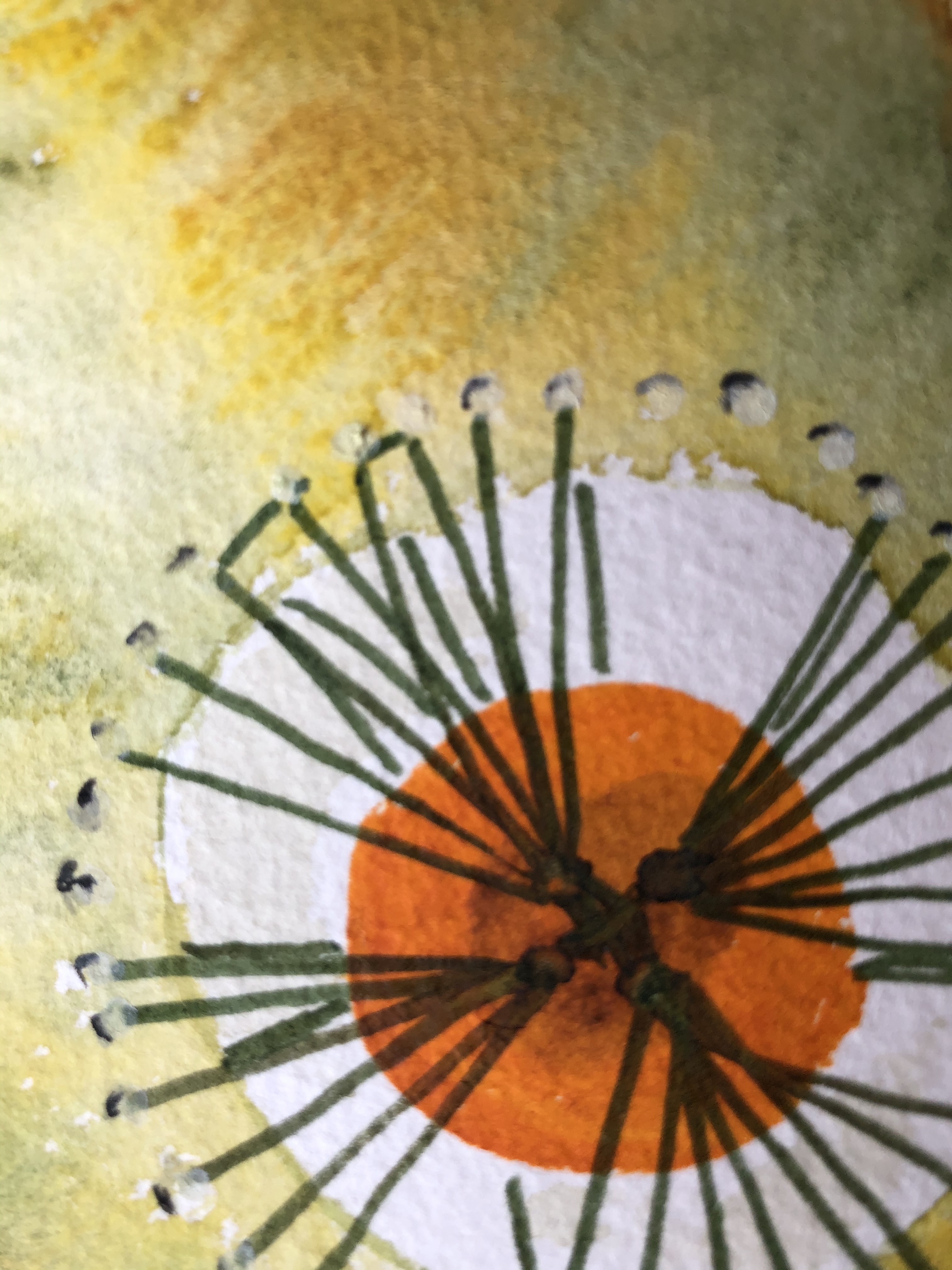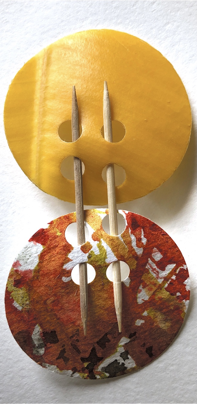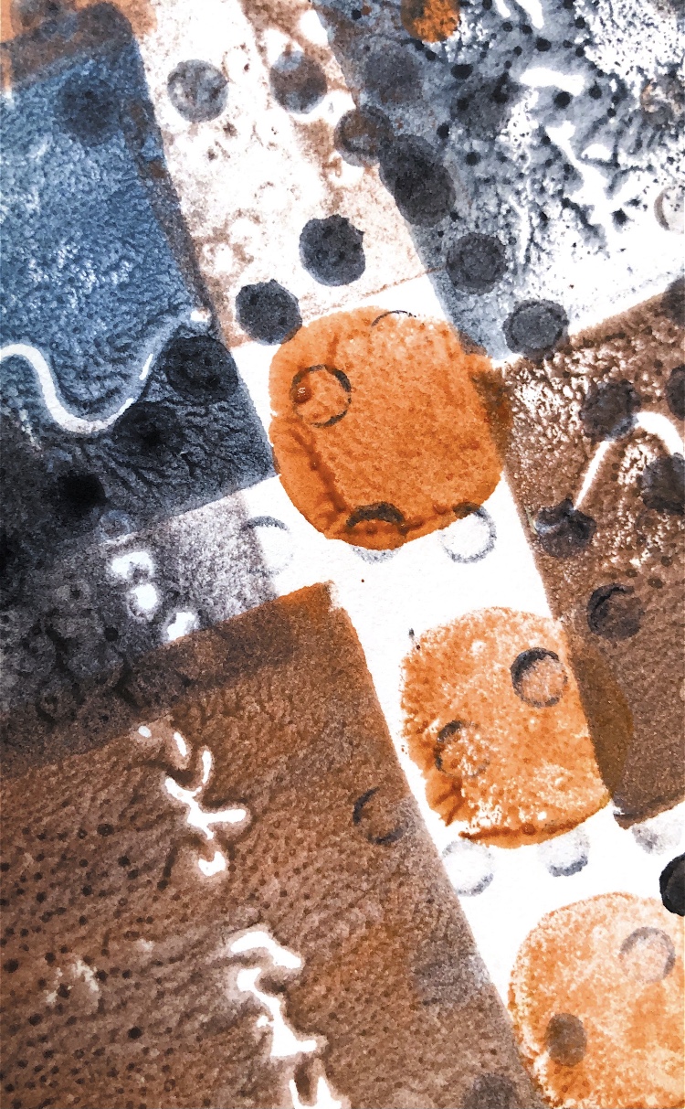 I also boiled a piece of prefelt I had made with buttons tied into it, however boiling alone did not fully felt the sample ,so I needed to handfelt it more fully with rubbing and rolling before taking out the buttons. Simple wax circles with a watercolour wash over captured some of the organic feel of this sample.