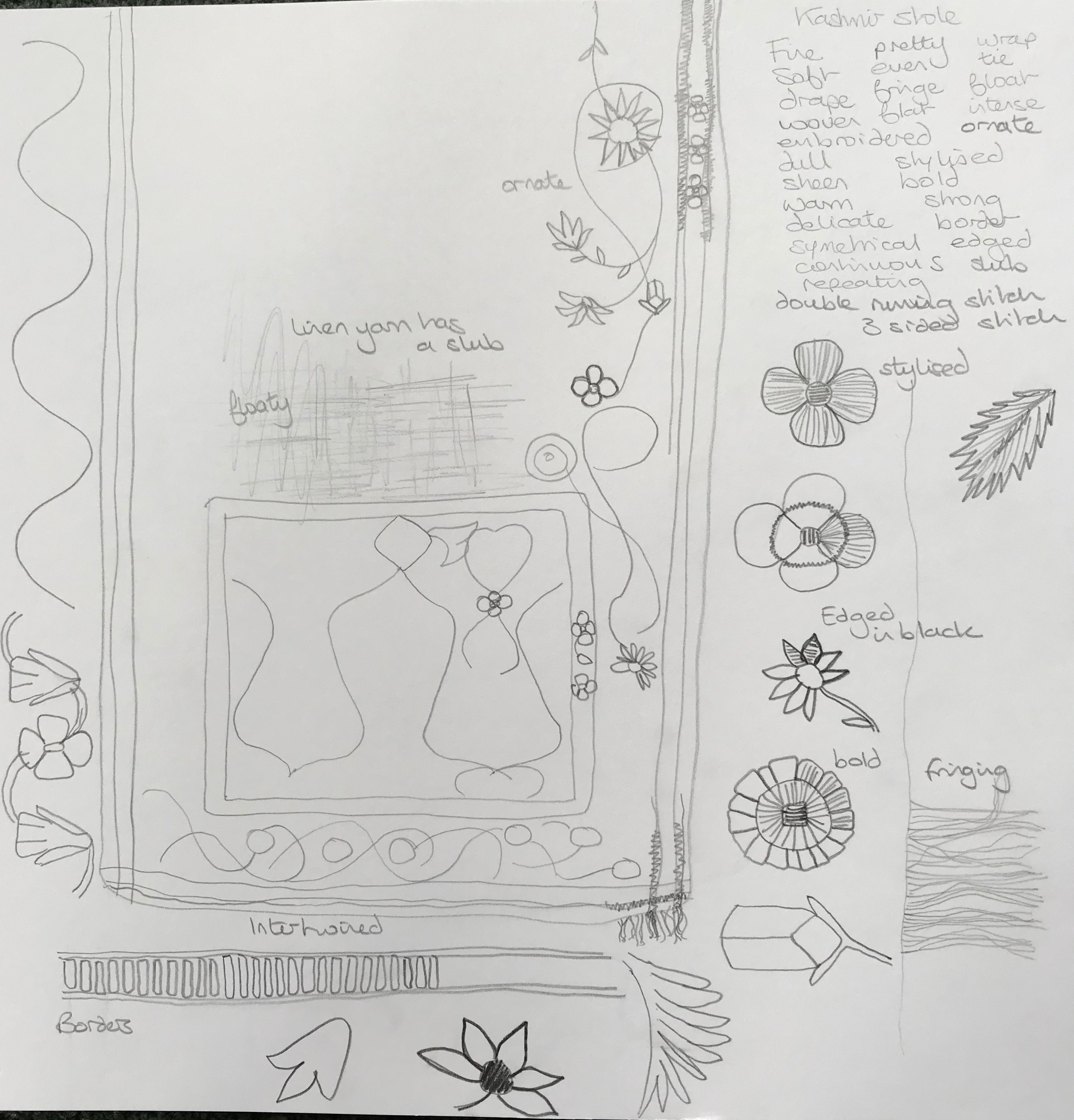 Kashmir stoleKashmir stoleKashmir stole drawn with eyes closed Kashmir stole – drawn left handed Kashmir stole fringing – mark making using acrylic and piece of cardboard