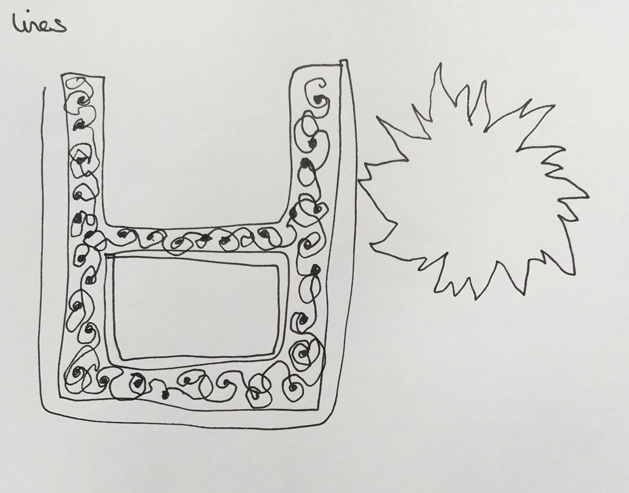 For the three pieces I have chosen, I have written some words and done some simple drawings to capture some of the qualities of each piece. As the pieces are in a museum I am not able to handle or rearrange them but what drew me to each of them was the decoration so I have concentrated on this.
