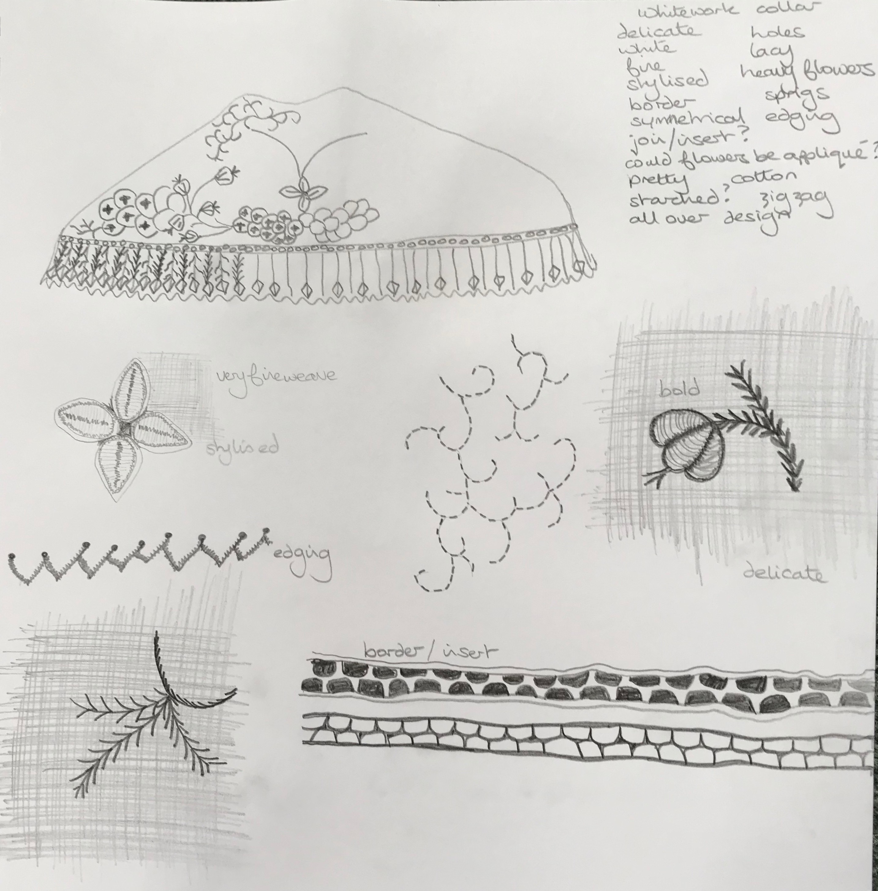 I chose to do my detailed drawings in pencil and pen as I felt this would be best to capture the fine details of my pieces. I was very interested in the stitches in each of the items and the patterns these created.