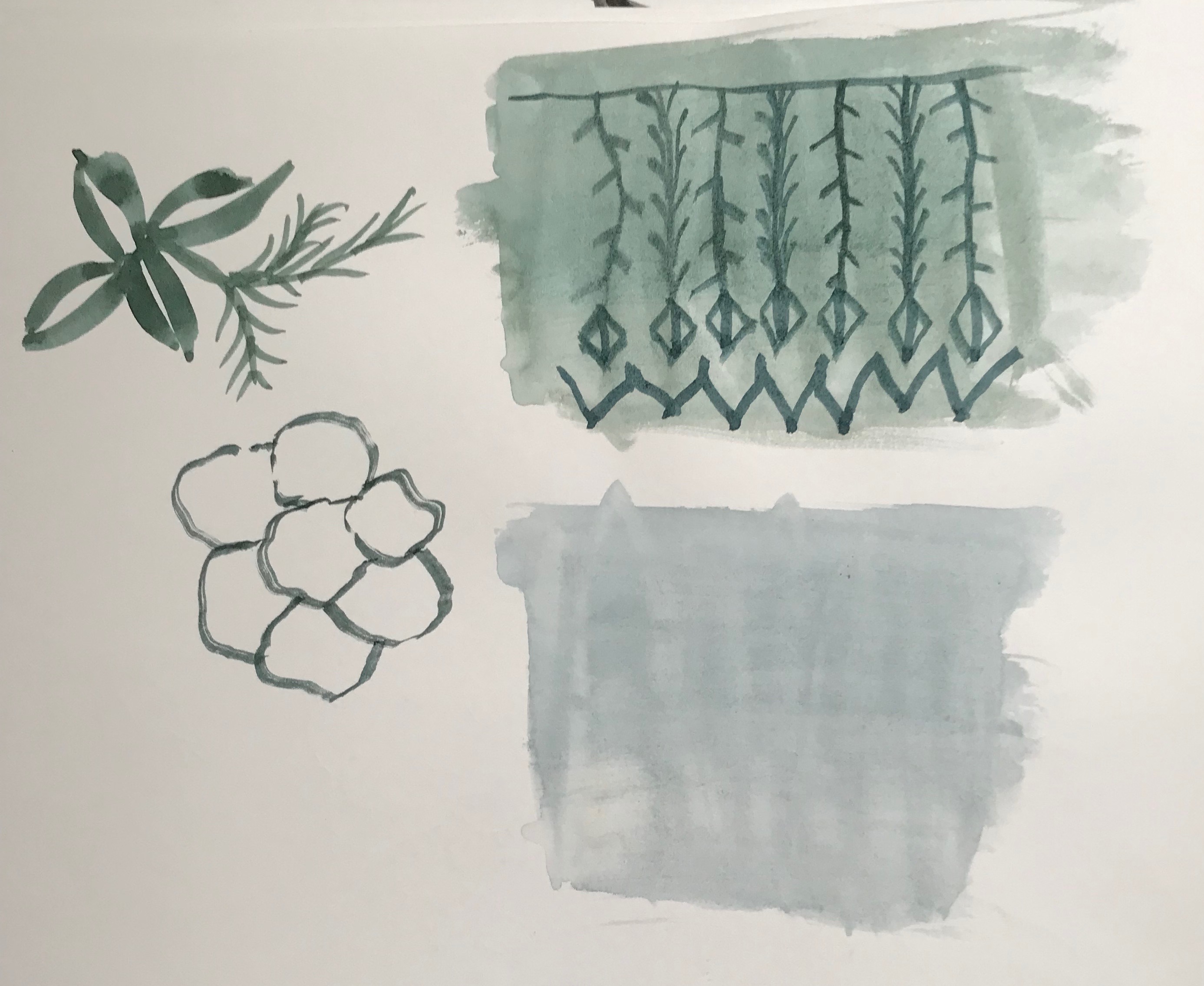 Leaves drawn with water-soluble pastelsPatterns and observations with watercolour Watercolour on rough paperWatercolour observationsRepetition – this could be developed as a border patternExperiments with very wet watercolours running into each otherWatercolour observations