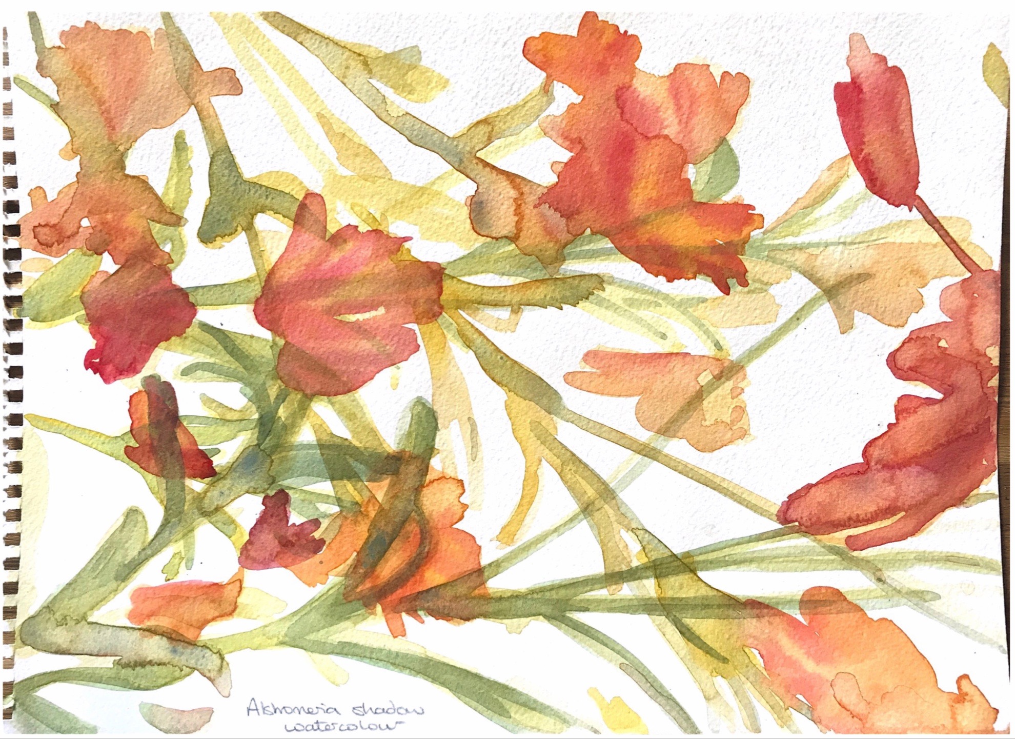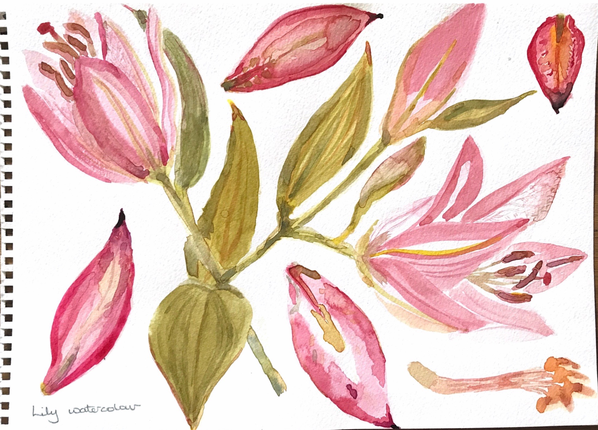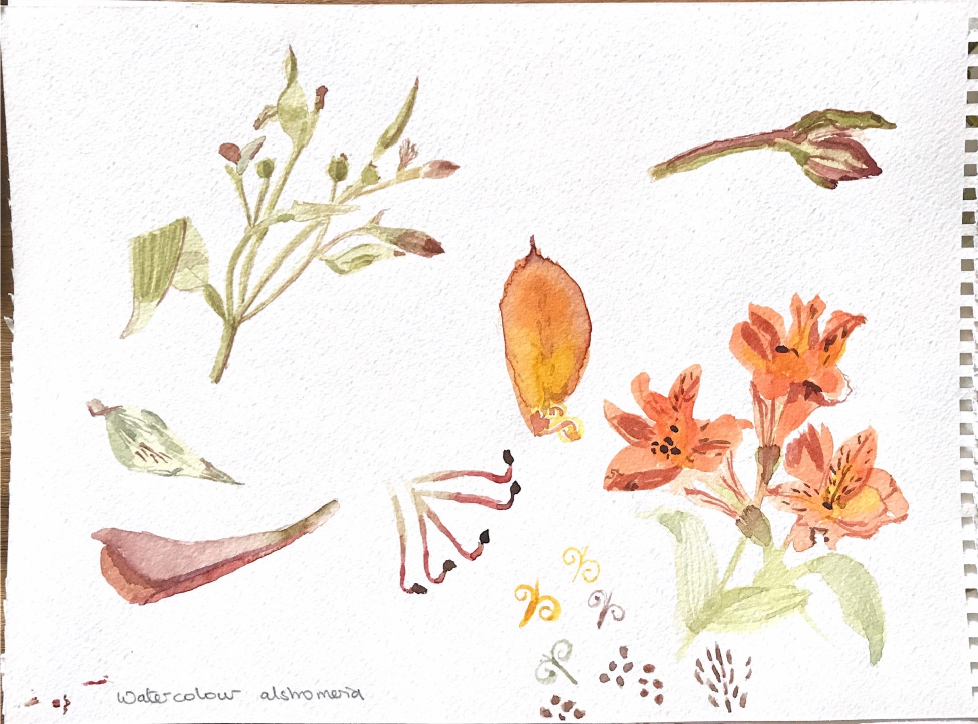 I chose alstromerias, lilies and some ‘weeds’ to start this exercise and thought I would try using watercolour. I haven’t used watercolour much before but I like the soft colours and the way they run into each other when wet.