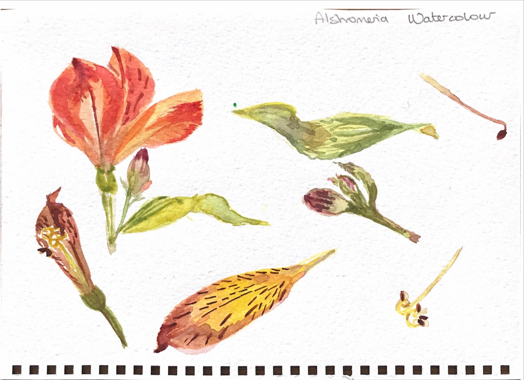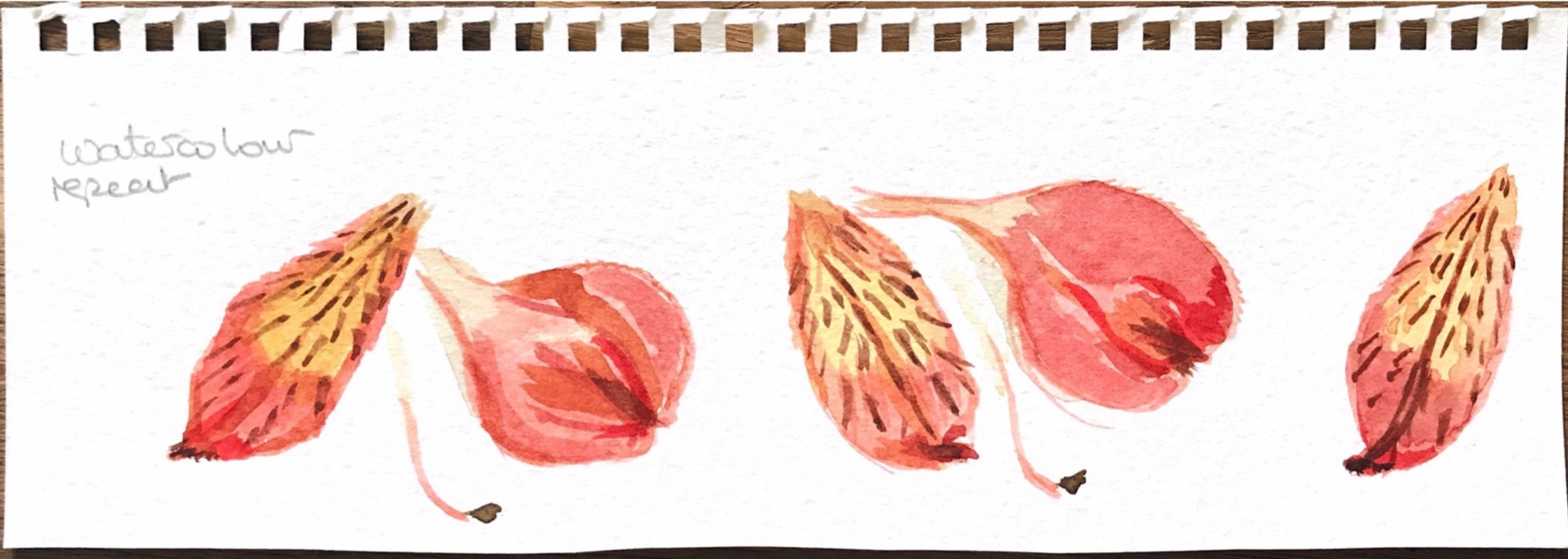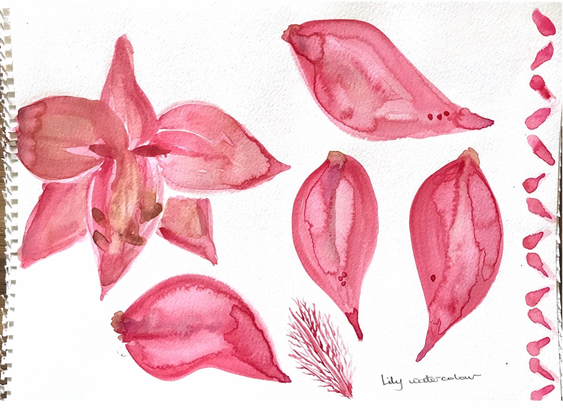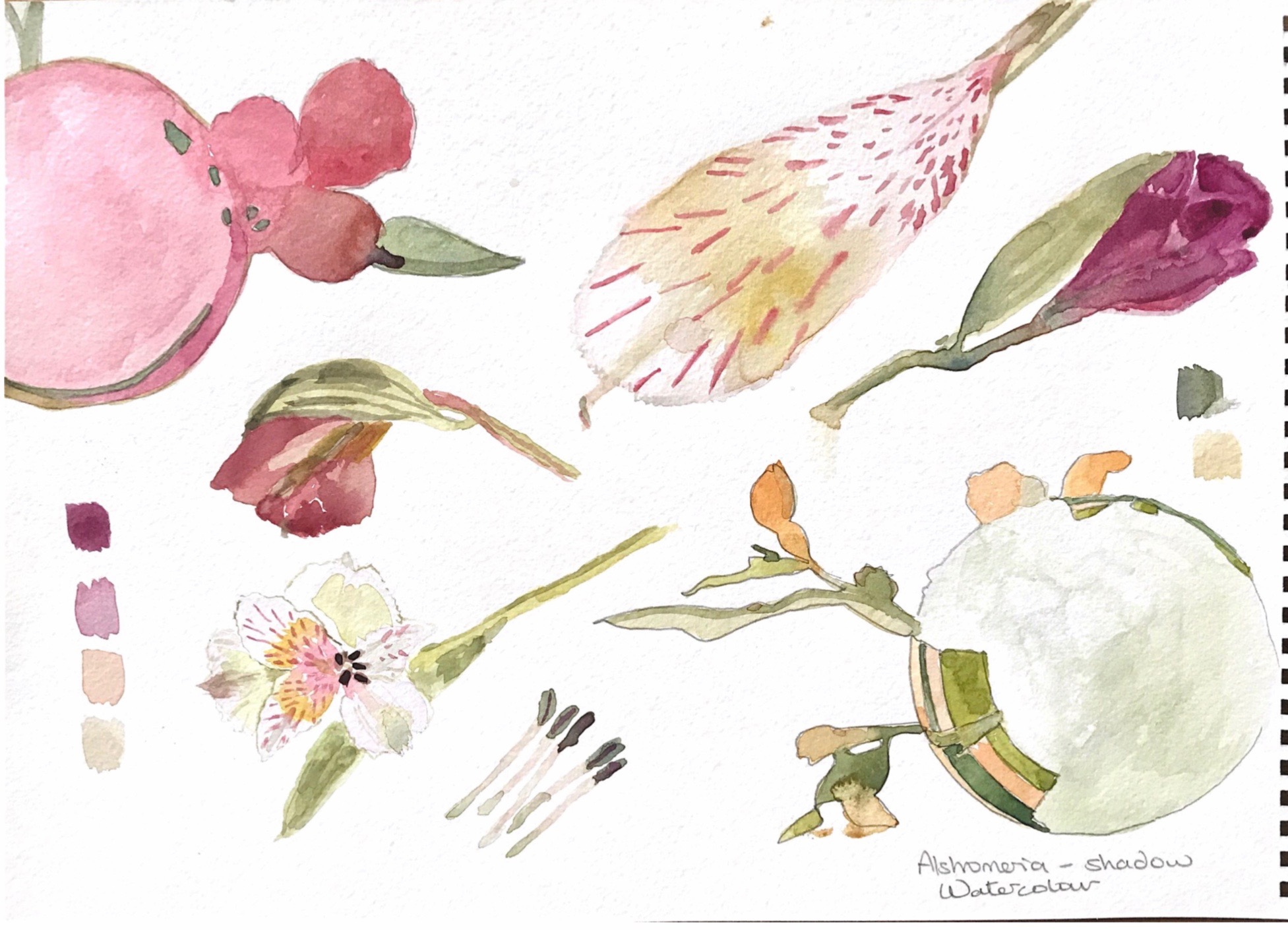 I chose alstromerias, lilies and some ‘weeds’ to start this exercise and thought I would try using watercolour. I haven’t used watercolour much before but I like the soft colours and the way they run into each other when wet.